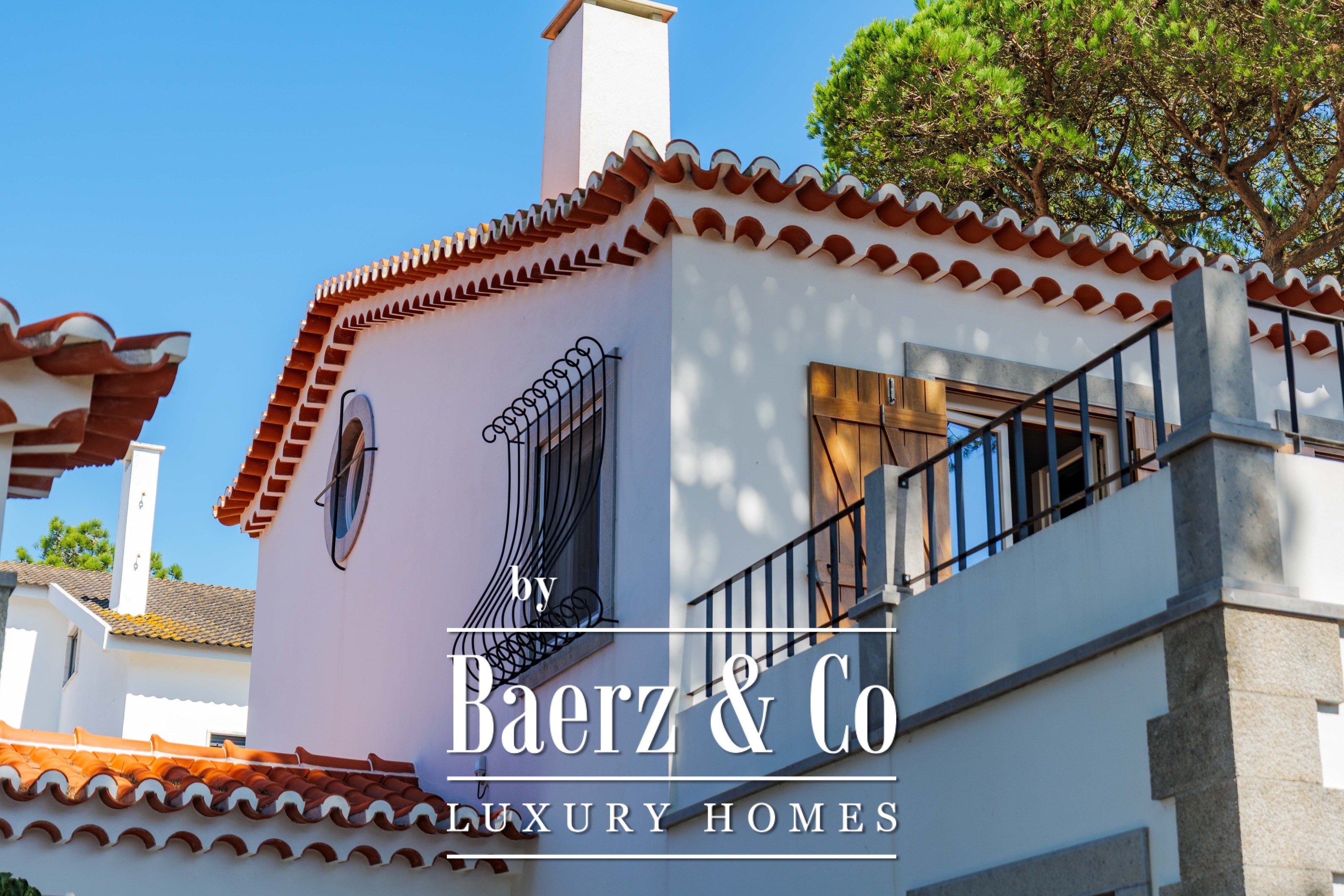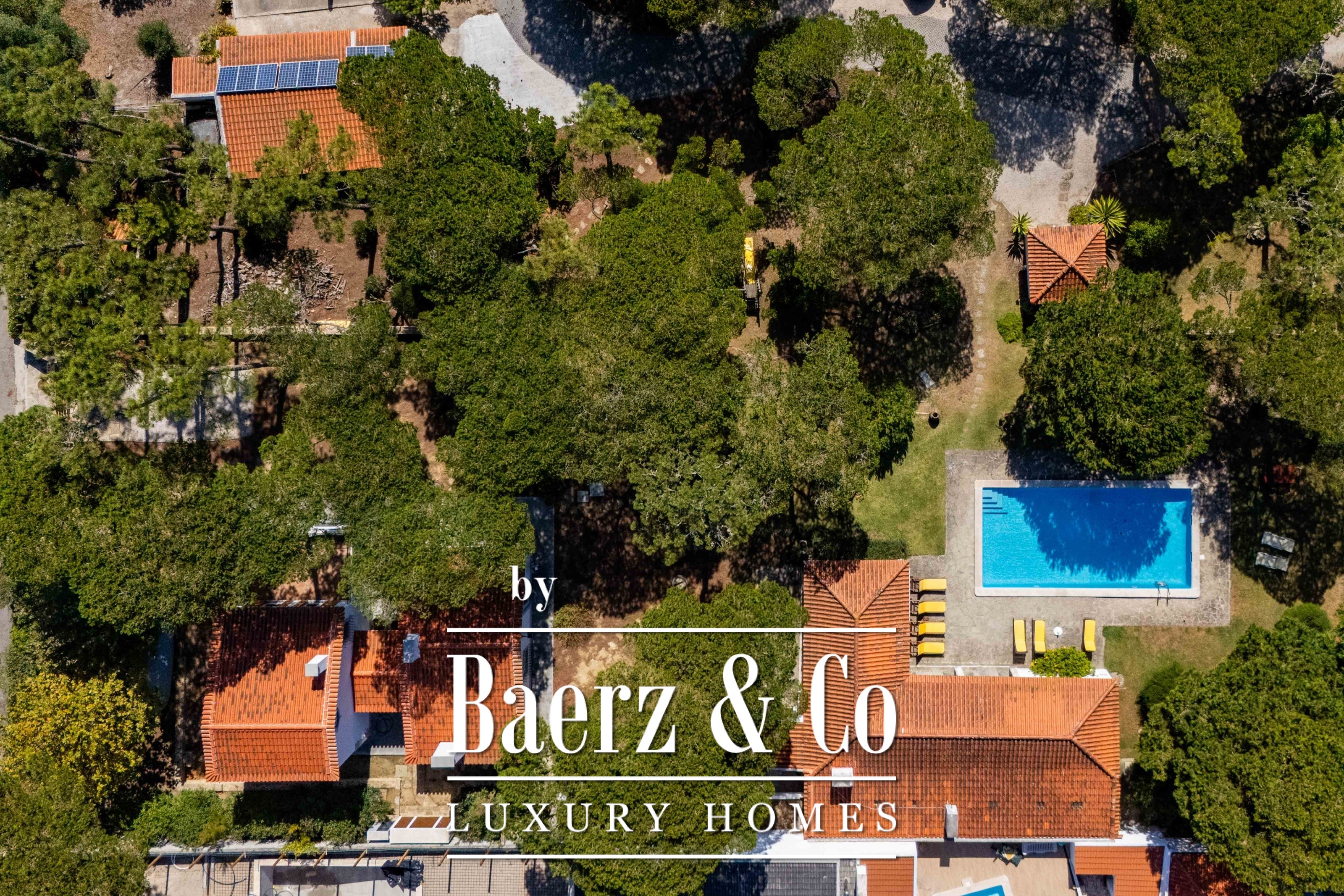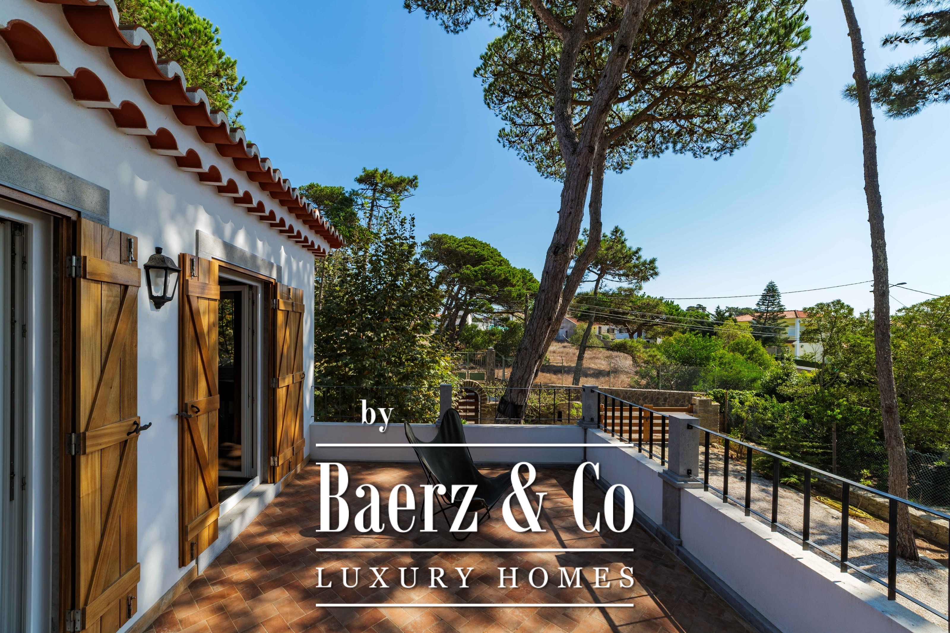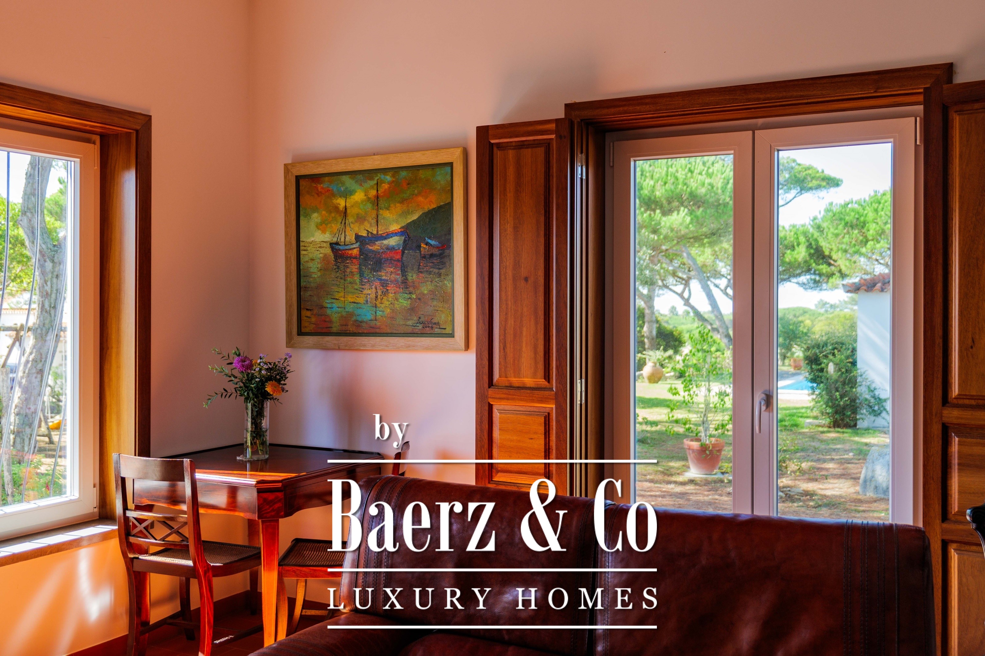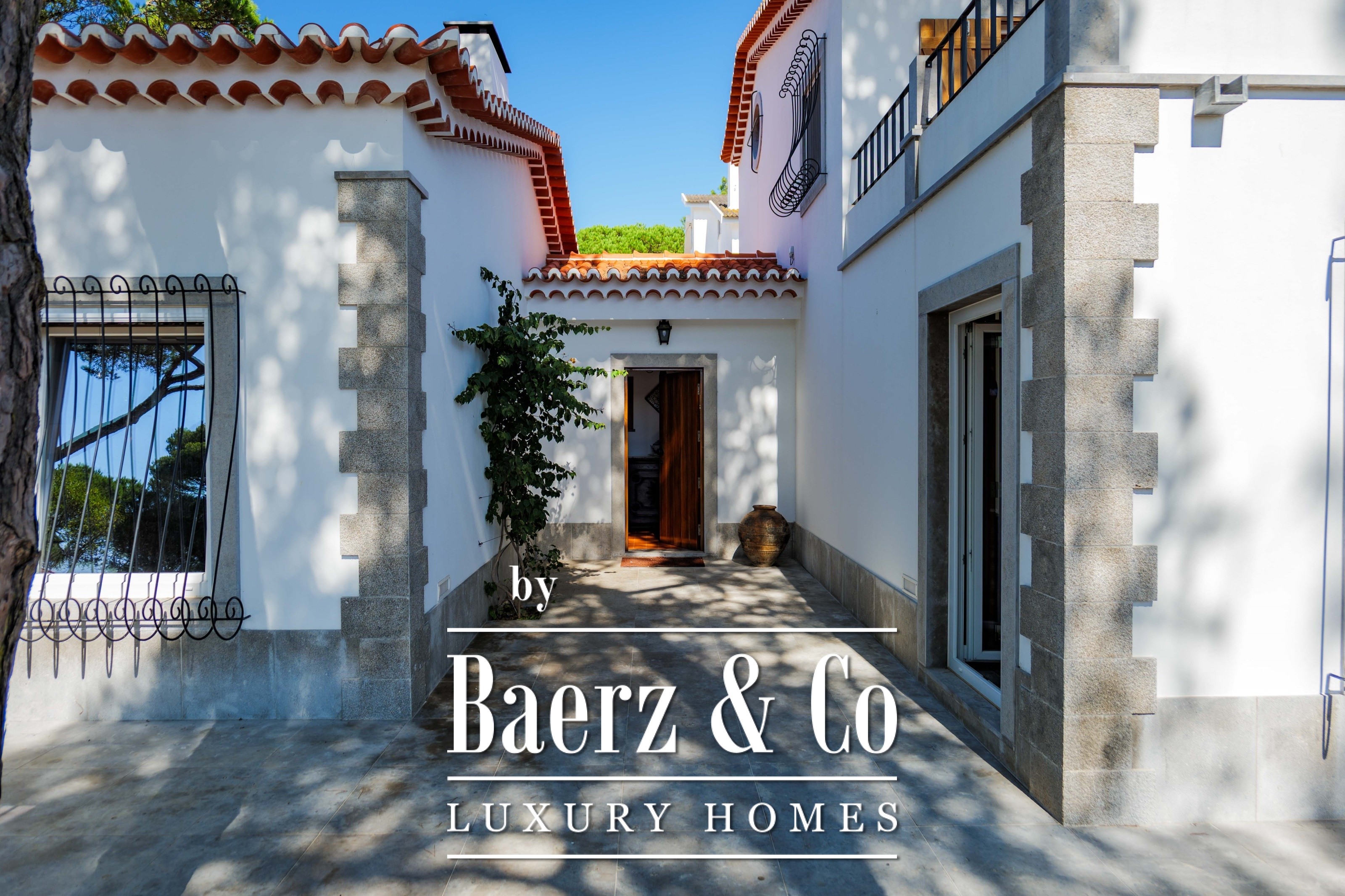 The main residence spans two stories and 302 m², completed in 2023 with a focus on authentic materials: exotic woods, fine stone, traditional clay tile roofing, and handmade wrought iron details. Sunlight from east to west fills harmoniously proportioned rooms—spacious living areas with a fireplace, a fully equipped kitchen opening onto the gardens, private suites, and terraces oriented toward serene views of the Sintra hills and the Atlantic.