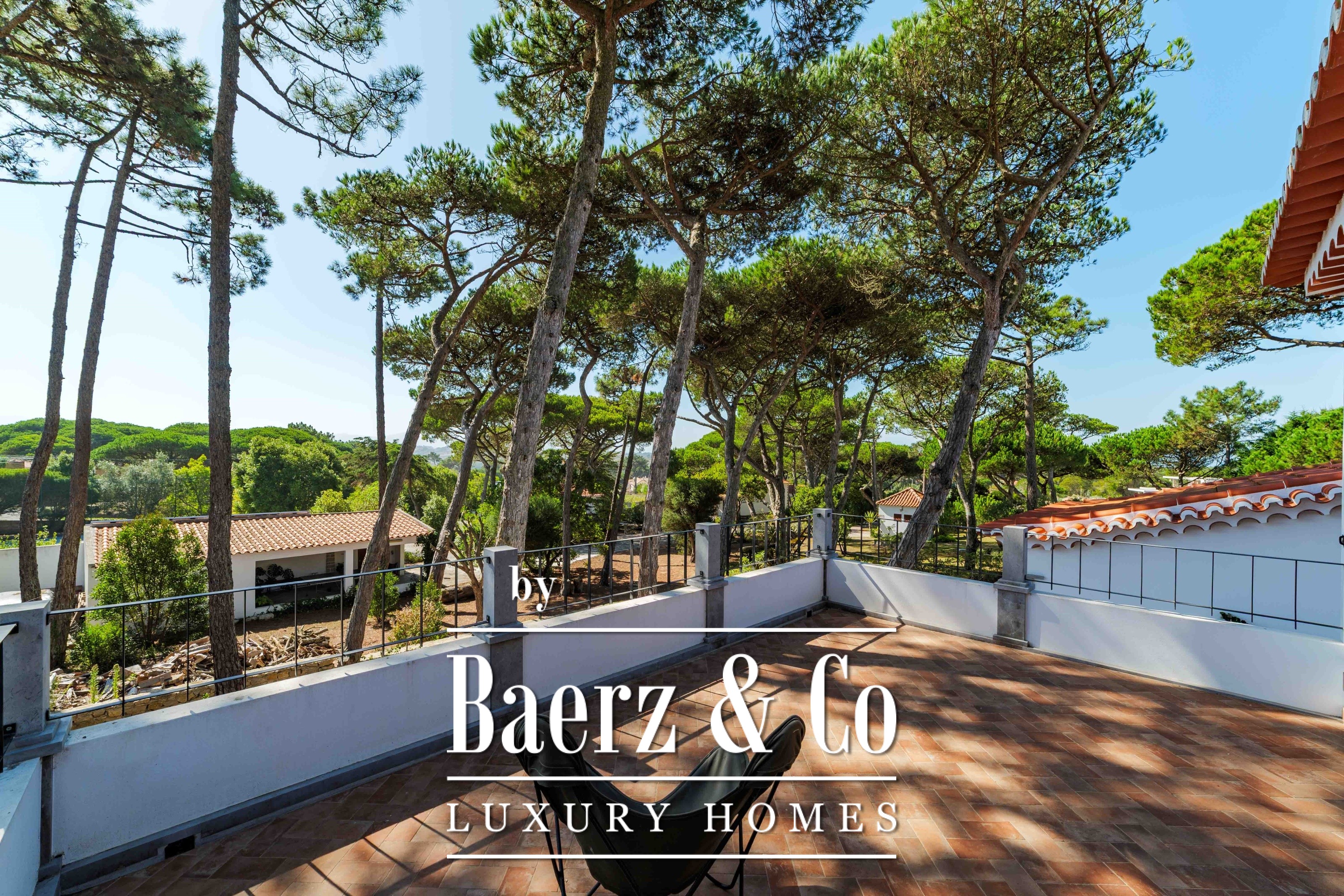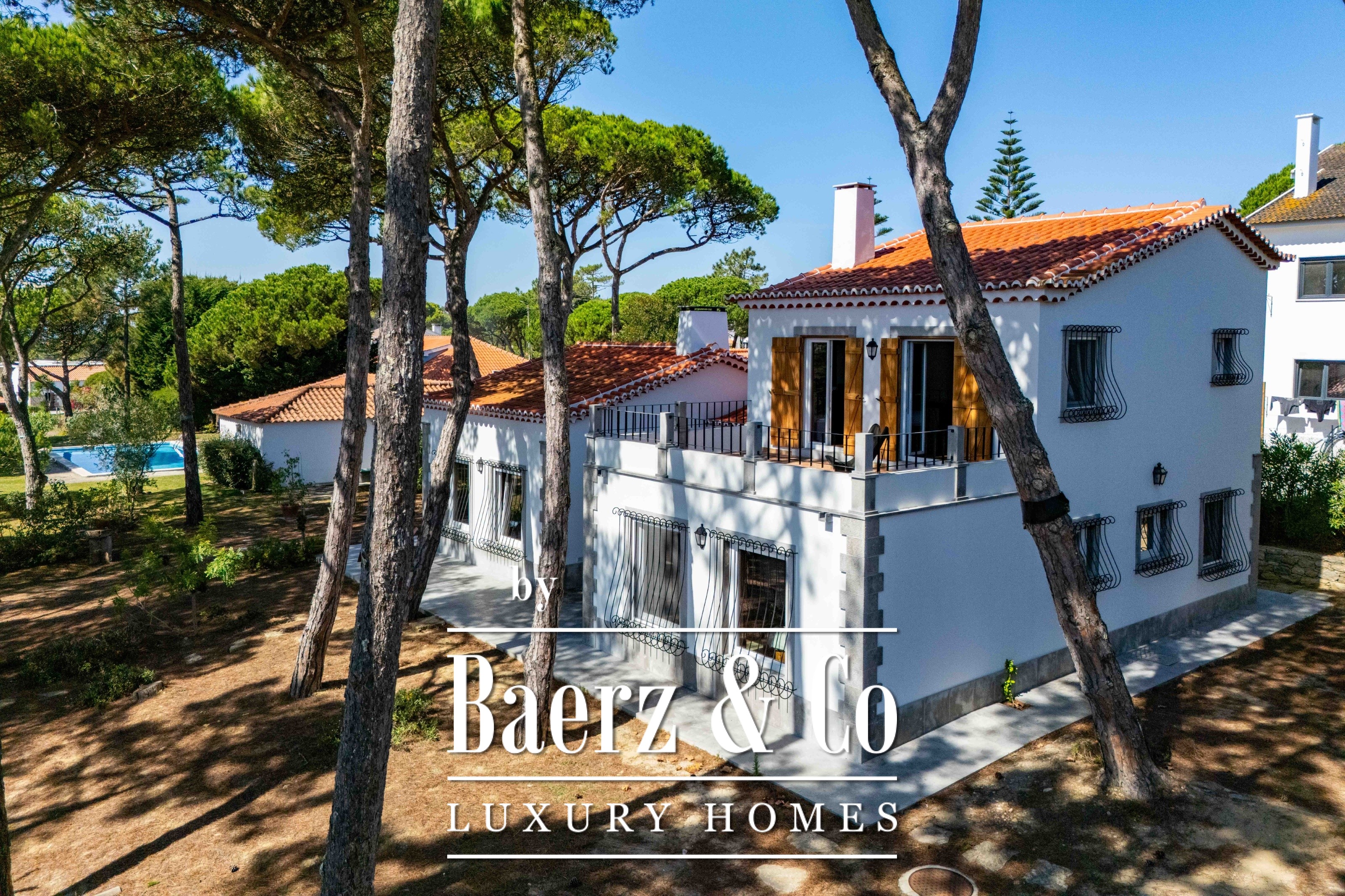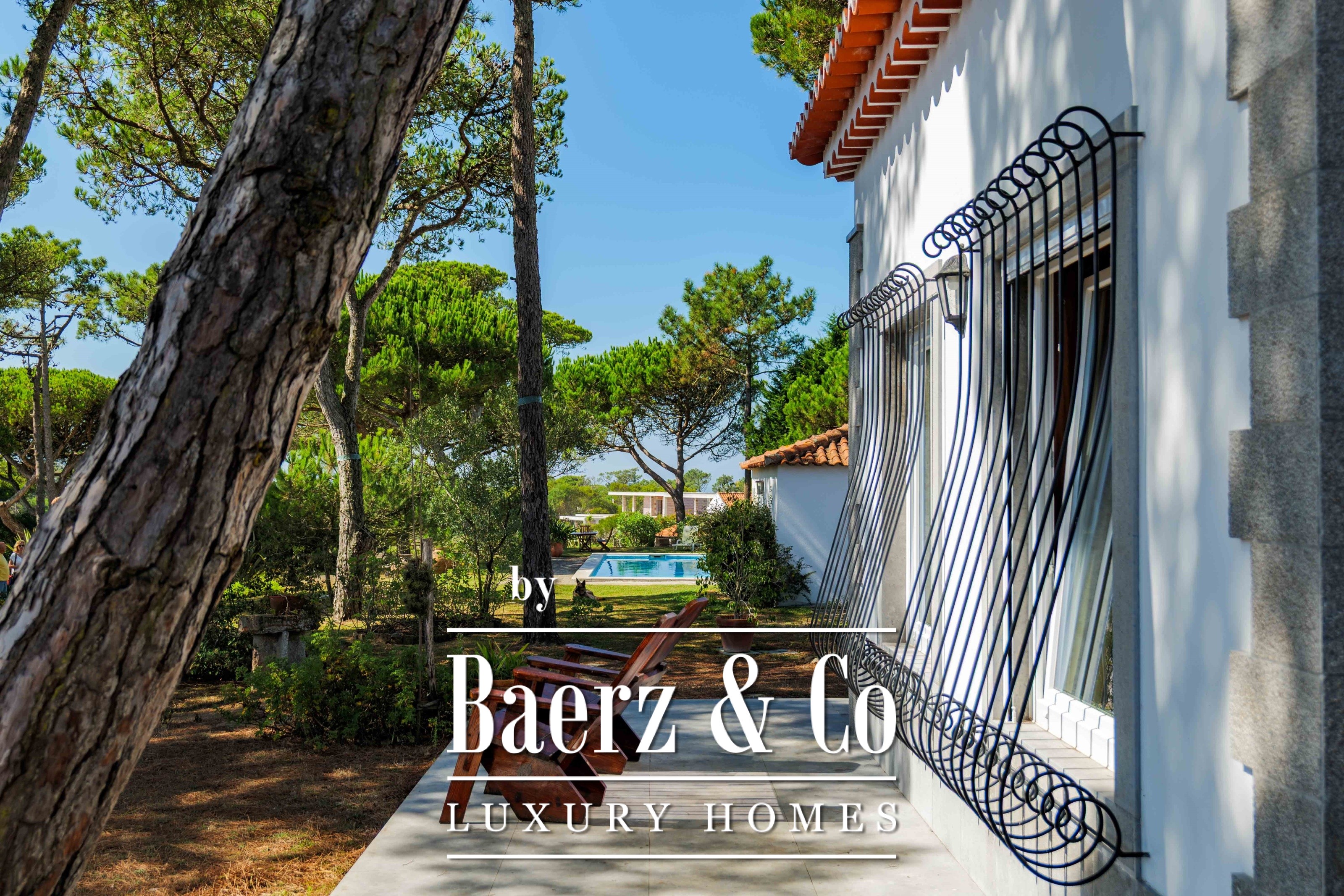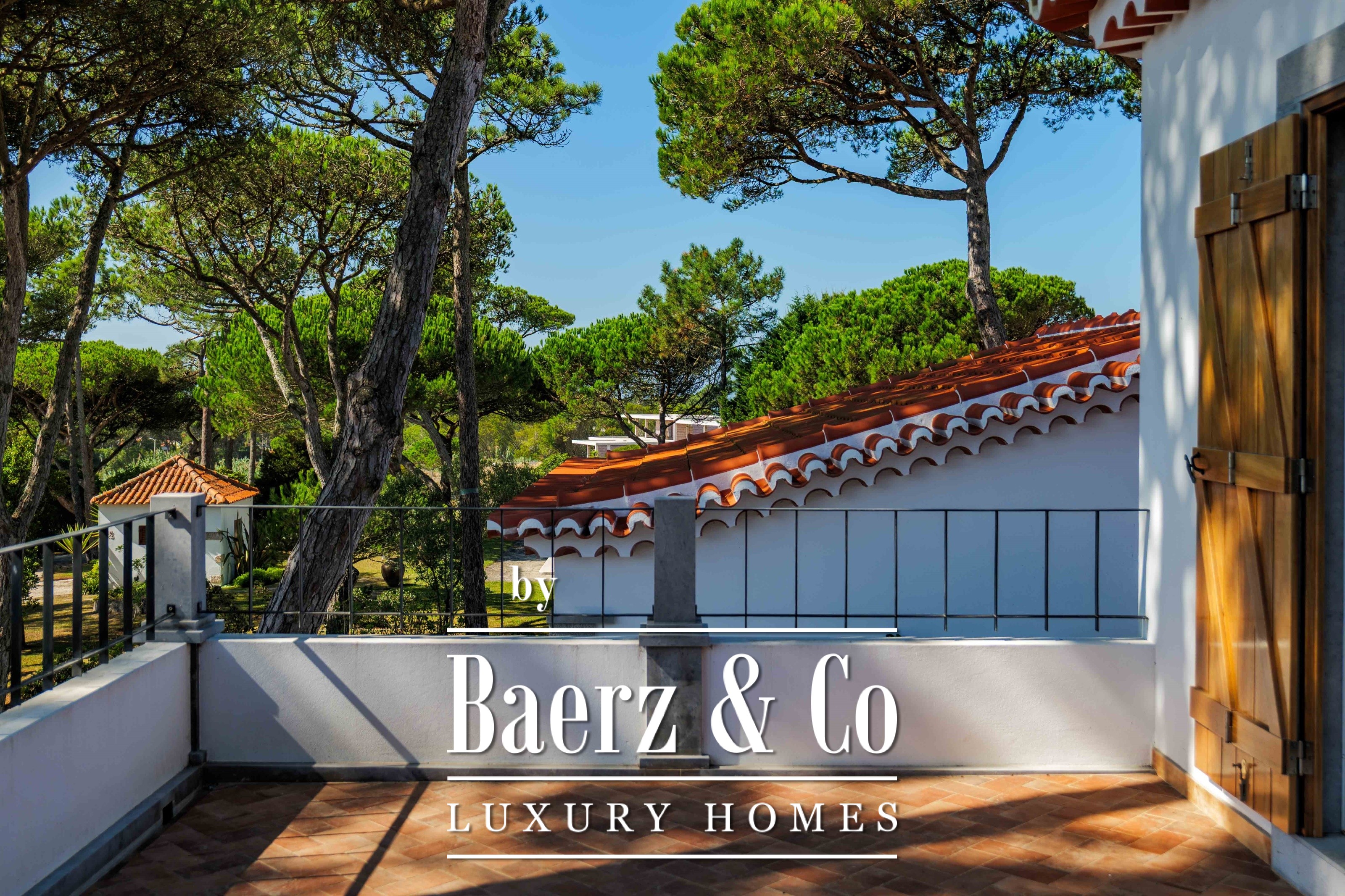 The main residence spans two stories and 302 m², completed in 2023 with a focus on authentic materials: exotic woods, fine stone, traditional clay tile roofing, and handmade wrought iron details. Sunlight from east to west fills harmoniously proportioned rooms—spacious living areas with a fireplace, a fully equipped kitchen opening onto the gardens, private suites, and terraces oriented toward serene views of the Sintra hills and the Atlantic.