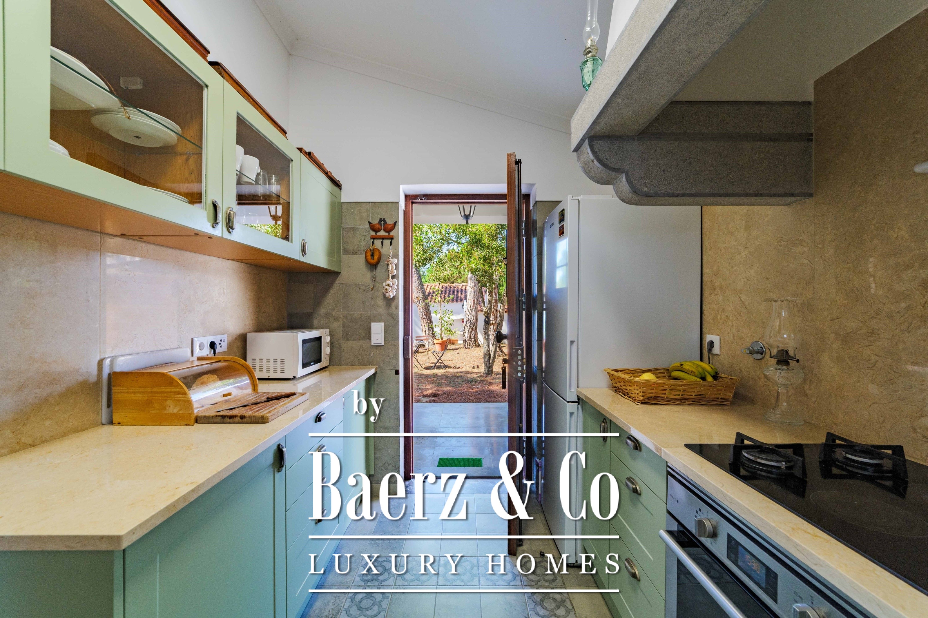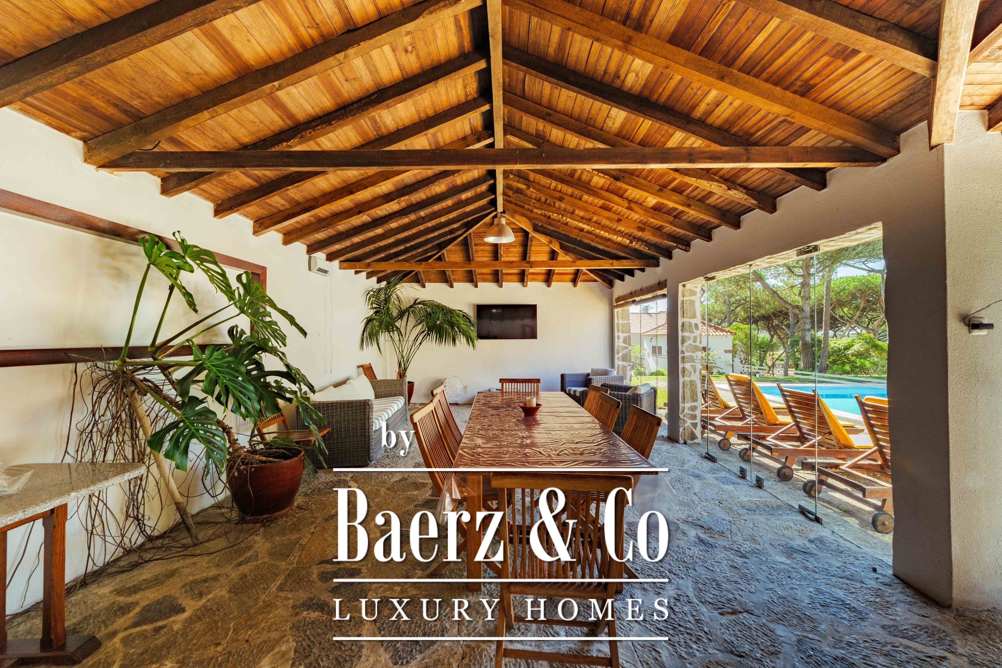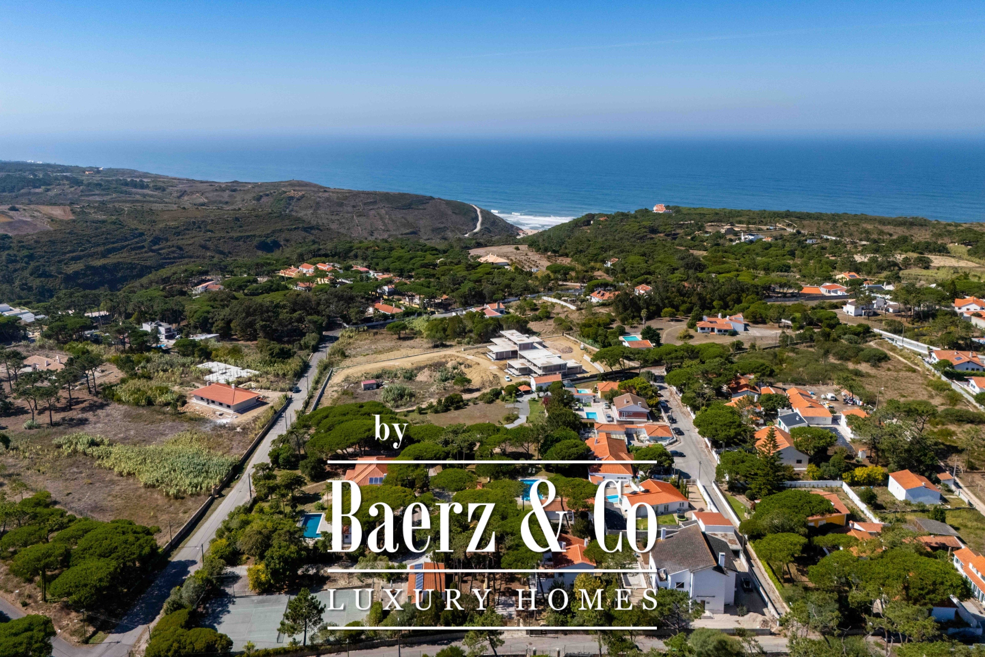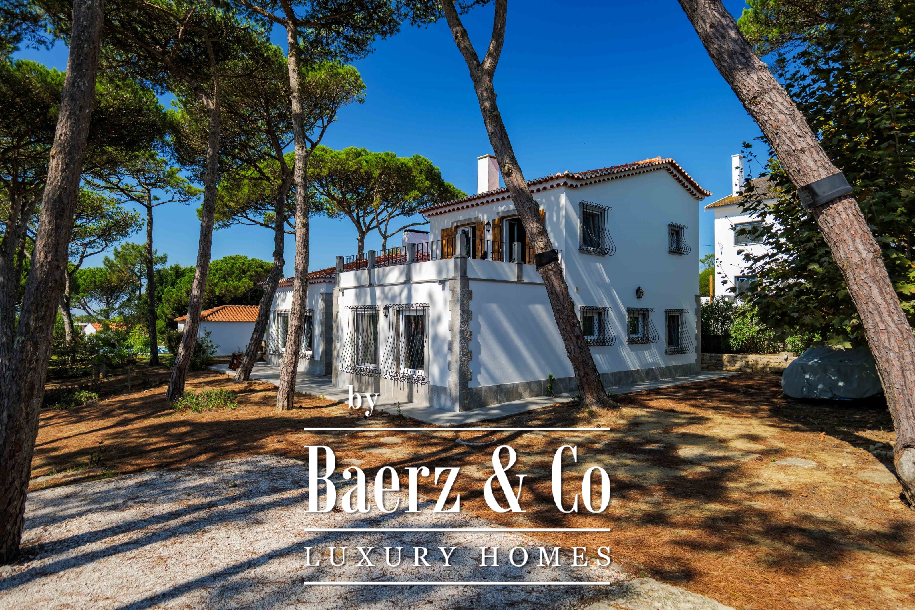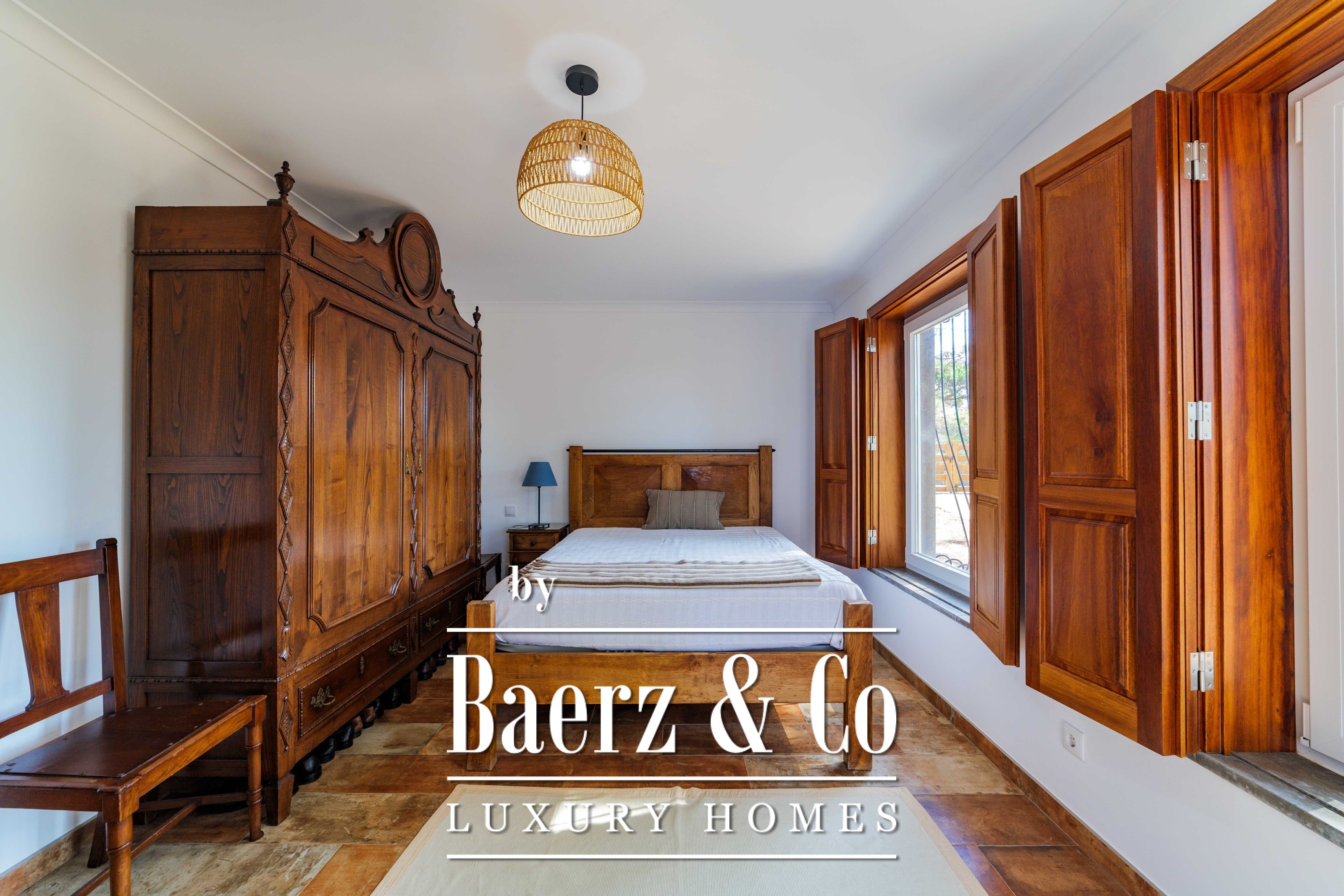 The main residence spans two stories and 302 m², completed in 2023 with a focus on authentic materials: exotic woods, fine stone, traditional clay tile roofing, and handmade wrought iron details. Sunlight from east to west fills harmoniously proportioned rooms—spacious living areas with a fireplace, a fully equipped kitchen opening onto the gardens, private suites, and terraces oriented toward serene views of the Sintra hills and the Atlantic.