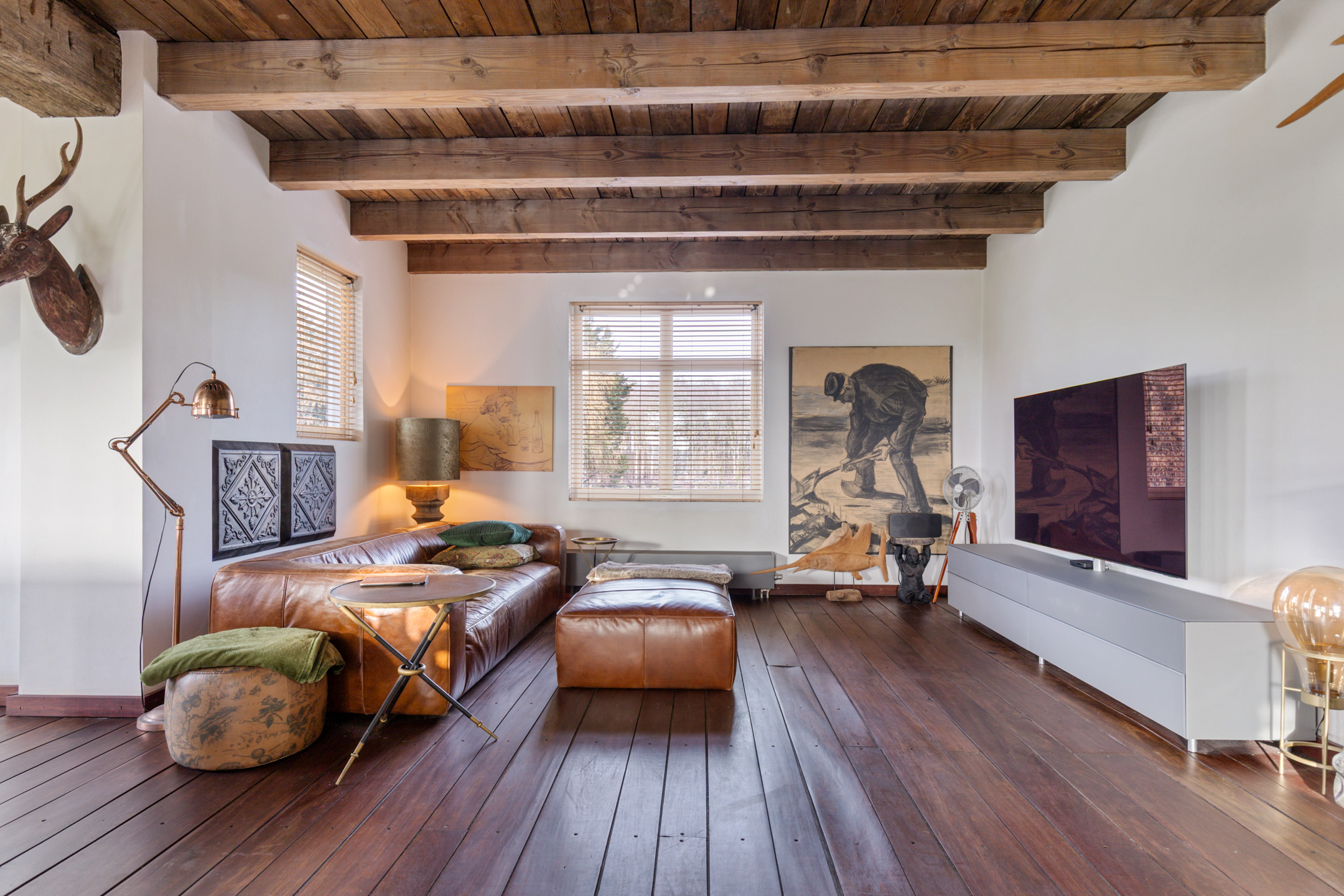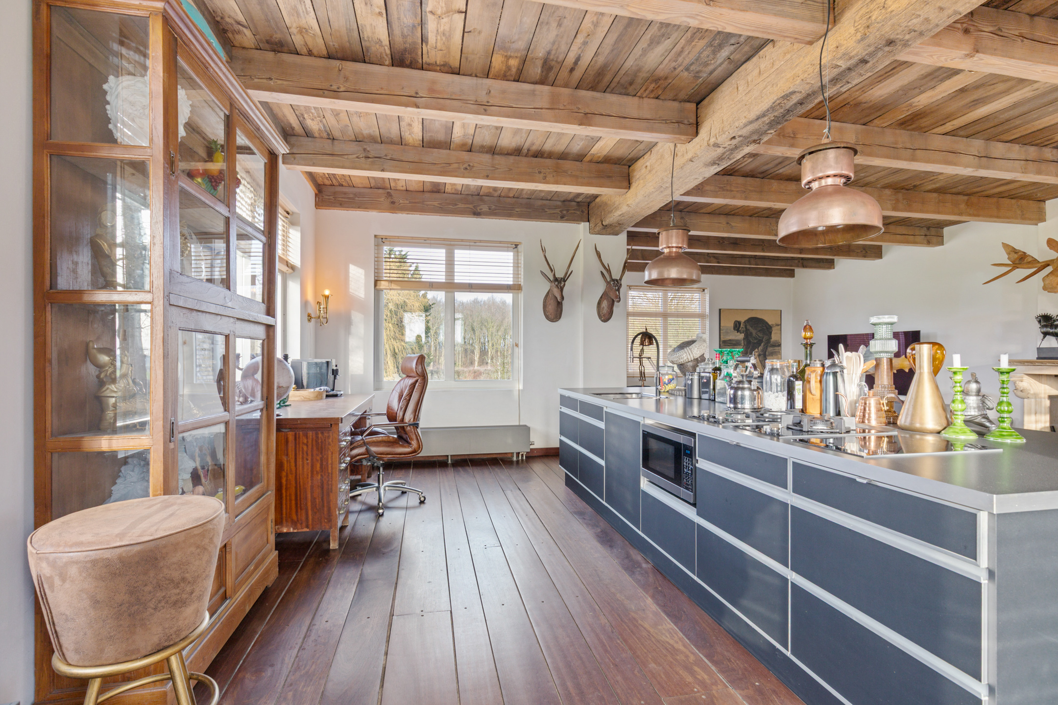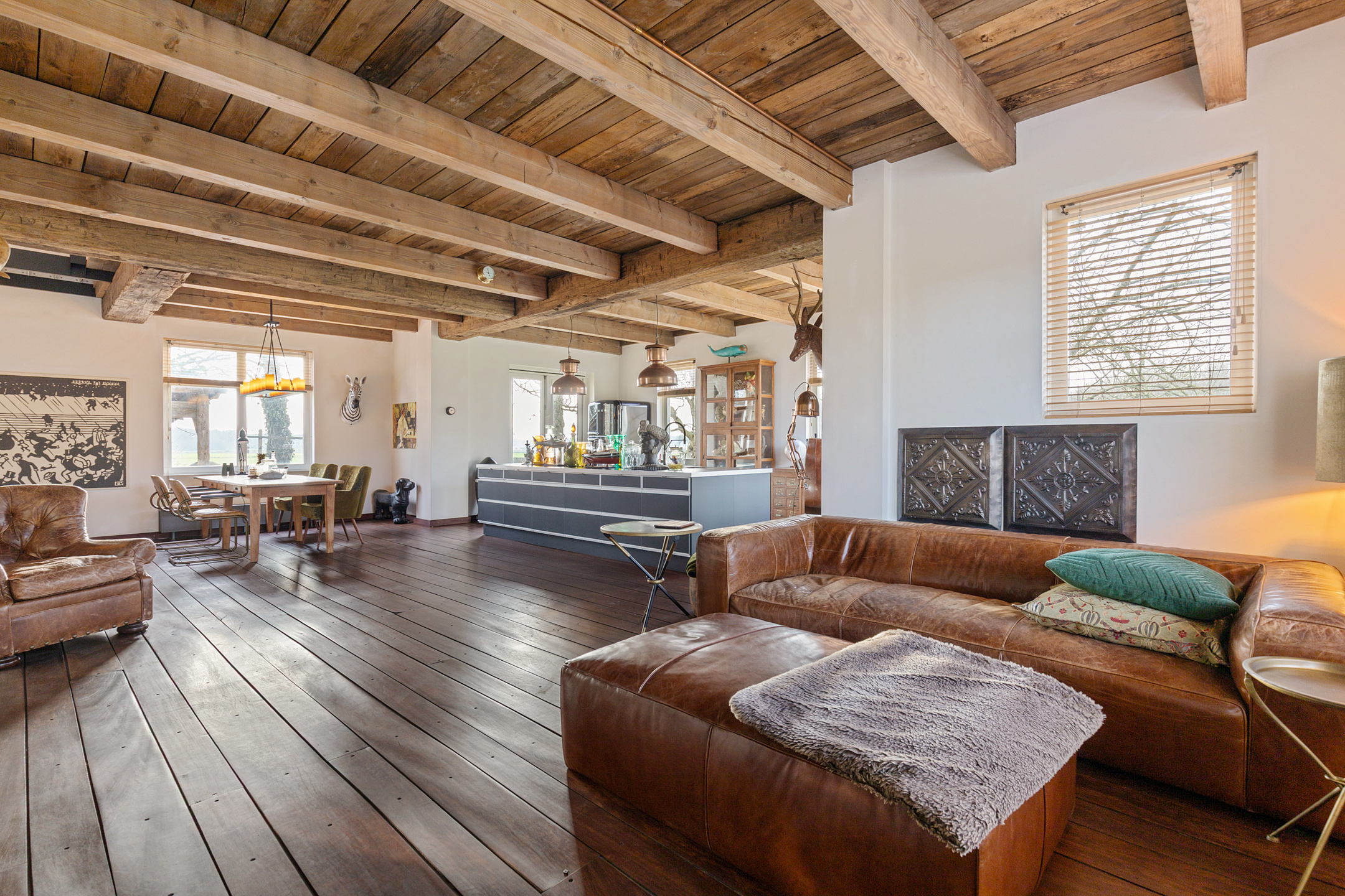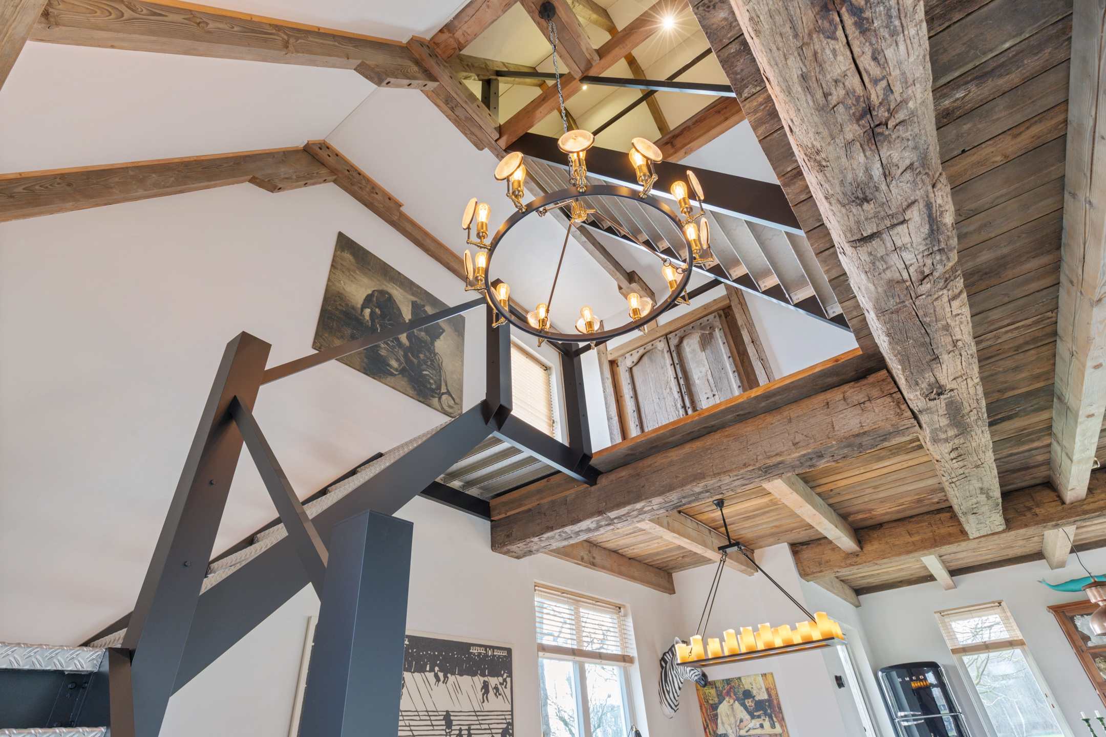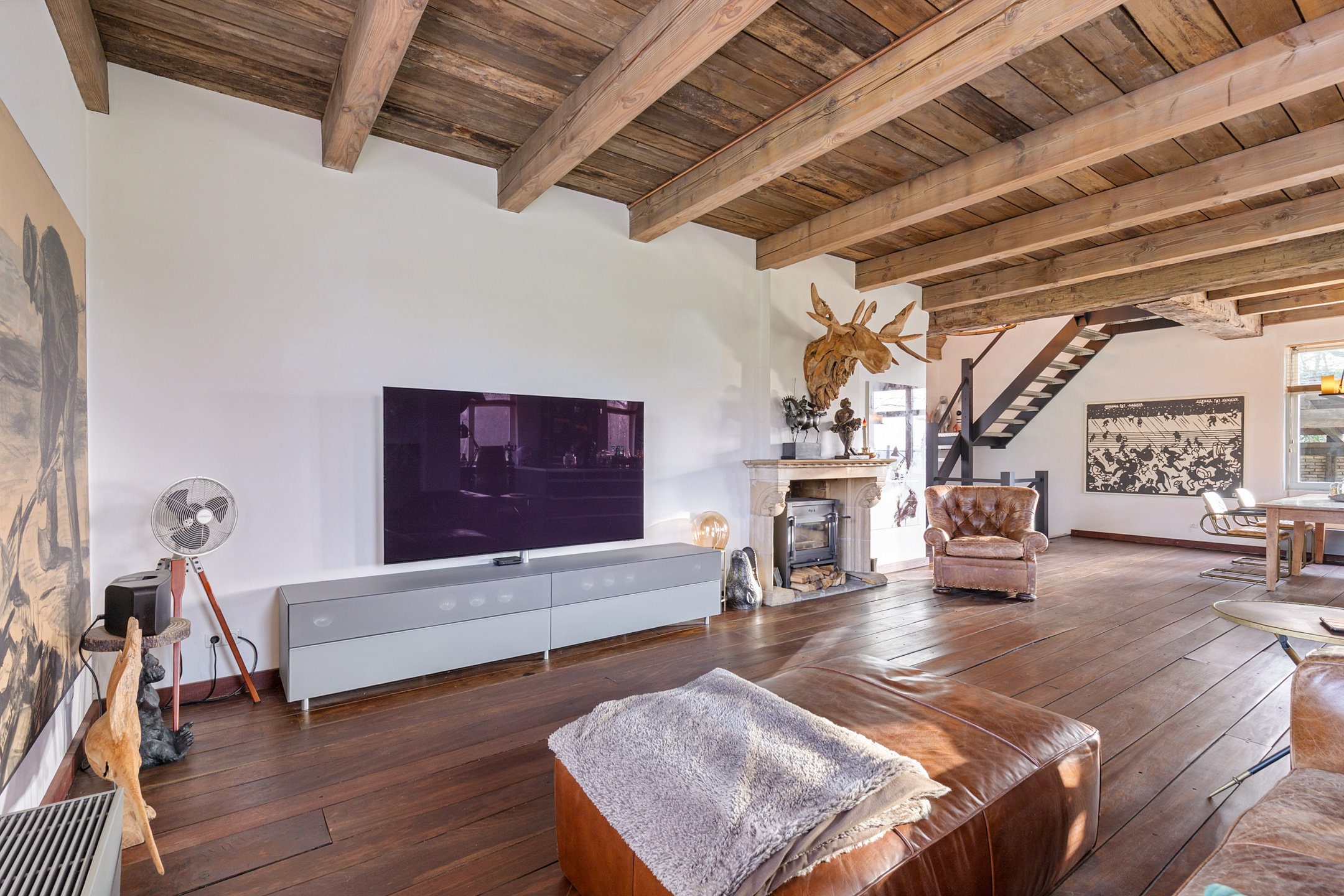 The spacious living room offers beautiful views of the Gaasterland natural landscape from virtually every window. Wherever you sit or stand, the surrounding nature becomes part of the interior experience. The atmosphere is defined by robust exposed beams, hardwood floors, a stylish fireplace with wood-burning stove and an impressive aluminium stair hall.