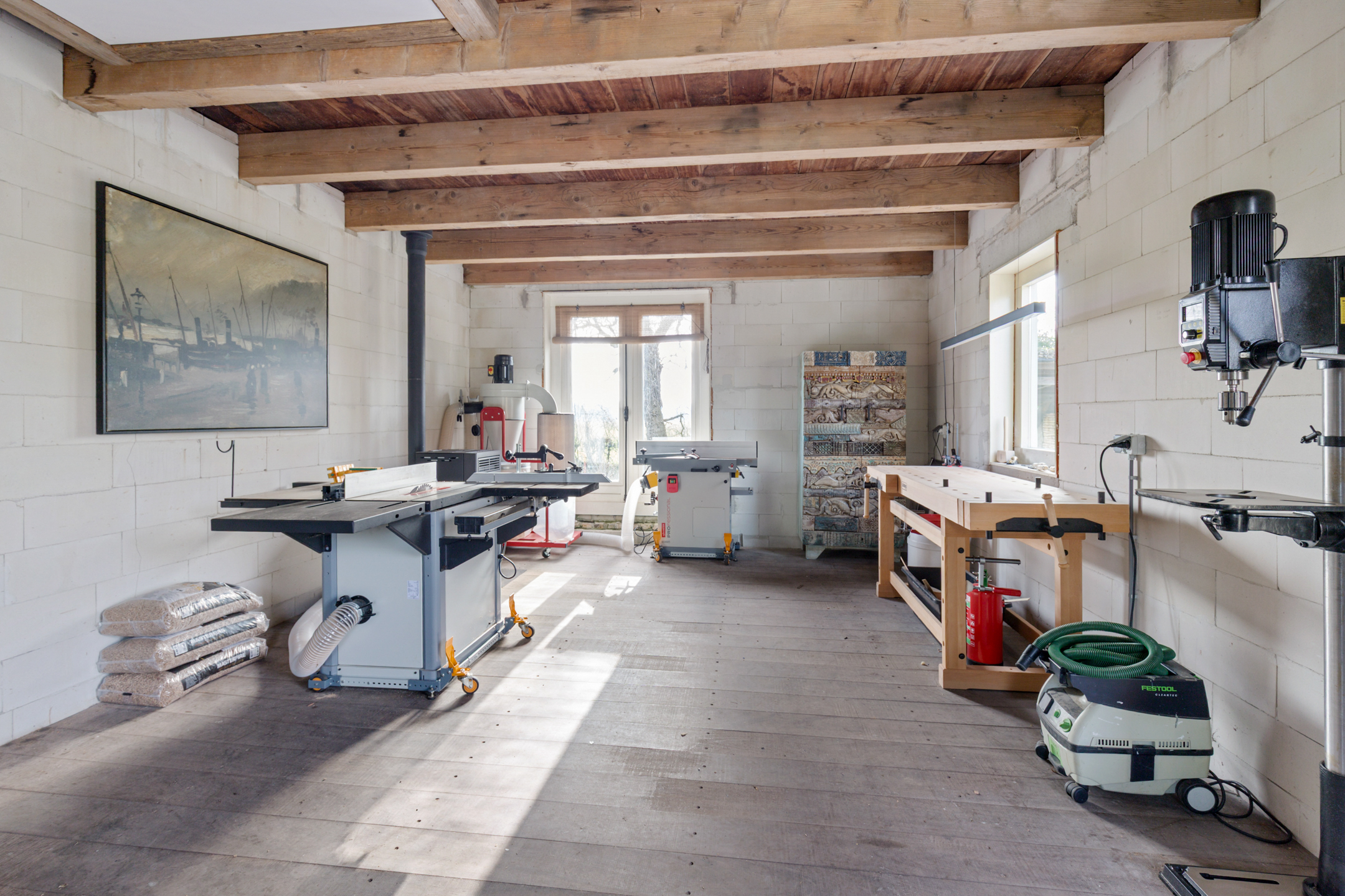 Currently it is used as a woodworking studio. The building is fully basemented and offers straightforward connection to the sewage system. Electricity and a new pellet stove are already installed, while a water connection can easily be realised via the existing PVC conduit to the main house.