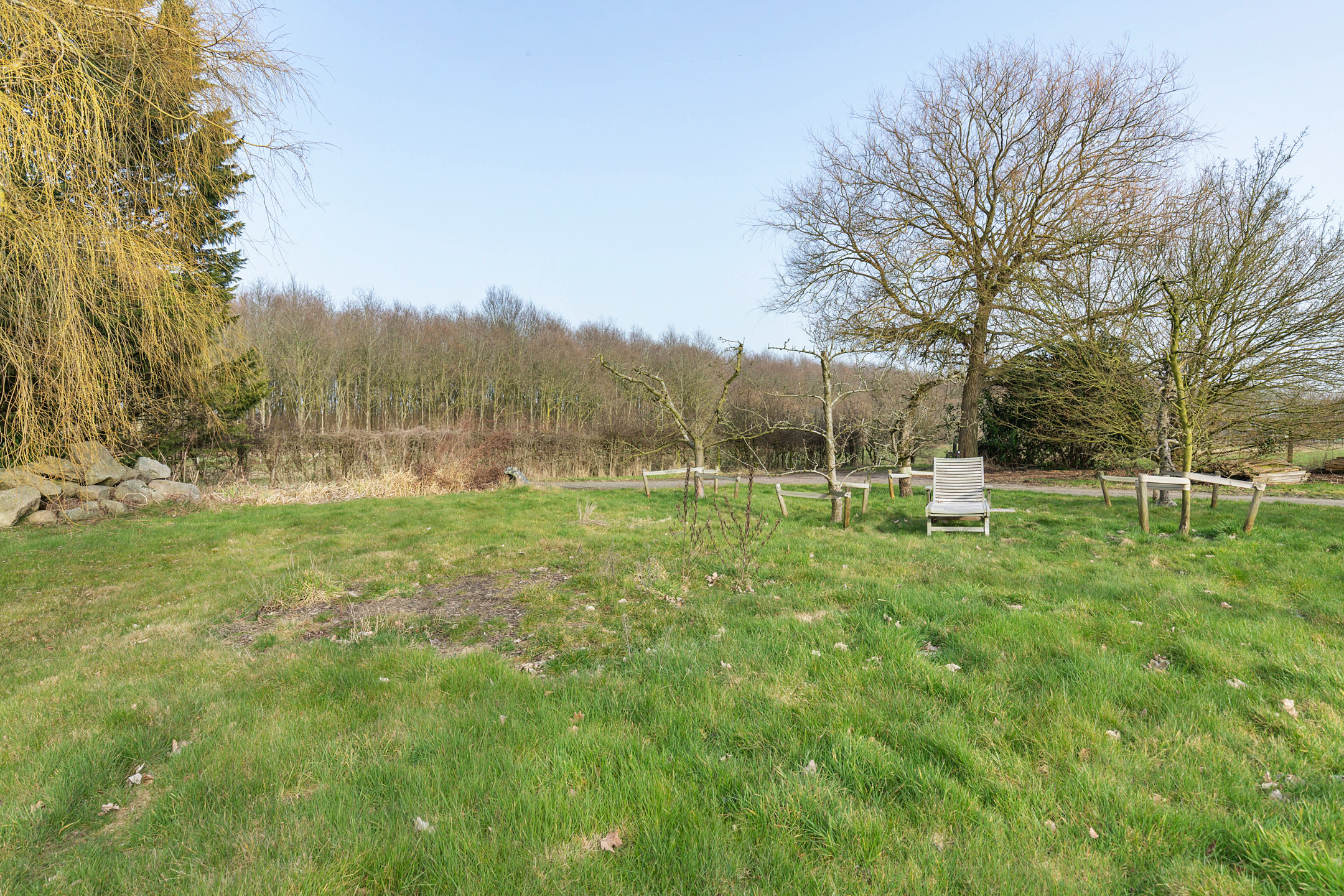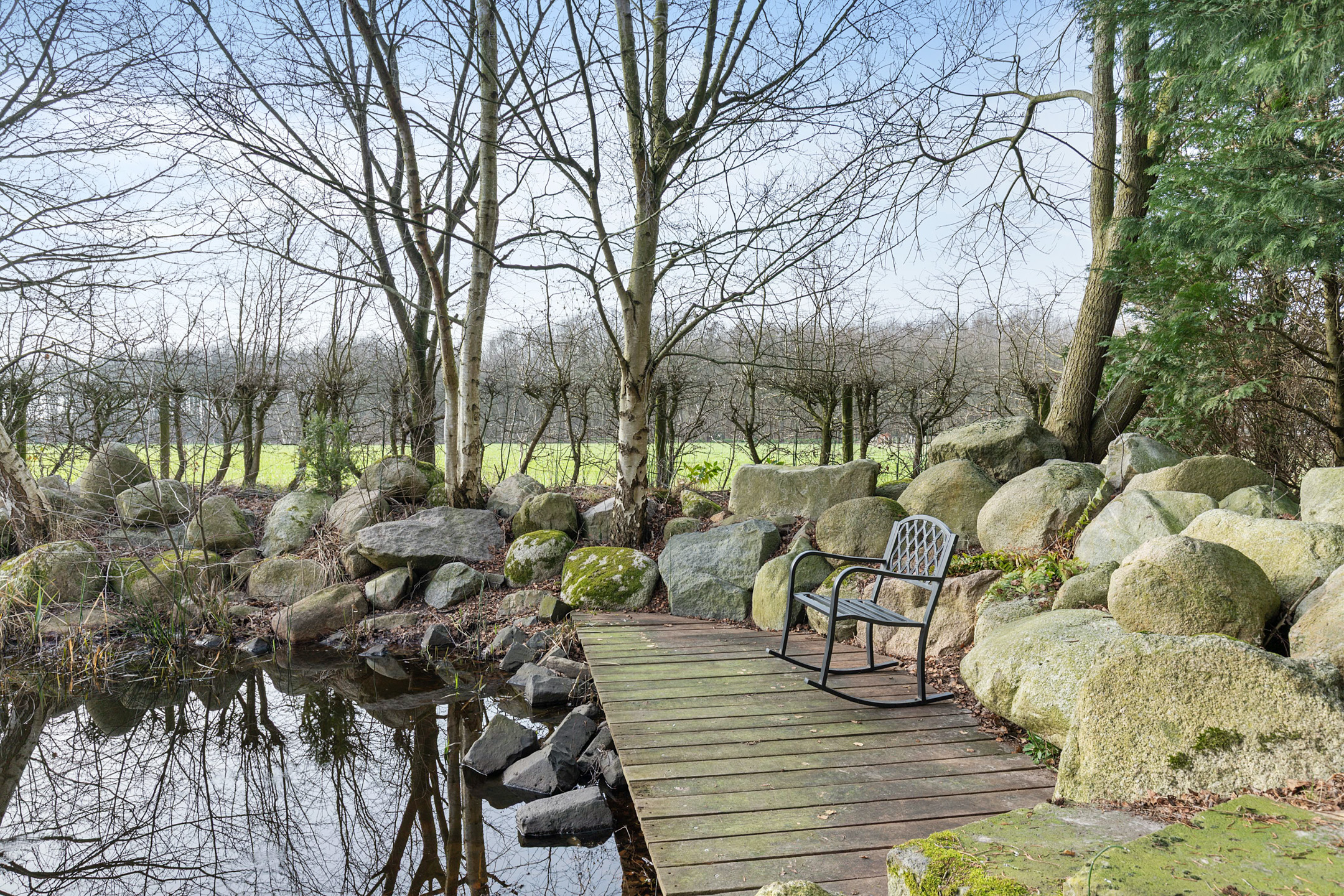 The garden is thoughtfully designed around the terp and blends harmoniously with the surrounding landscape. A long private driveway, guest parking area, carport with covered west-facing terrace, easy-to-maintain lawn, various planted borders, an orchard with traditional fruit varieties and a beautiful pond with sheltered decking terrace together create a true countryside oasis.