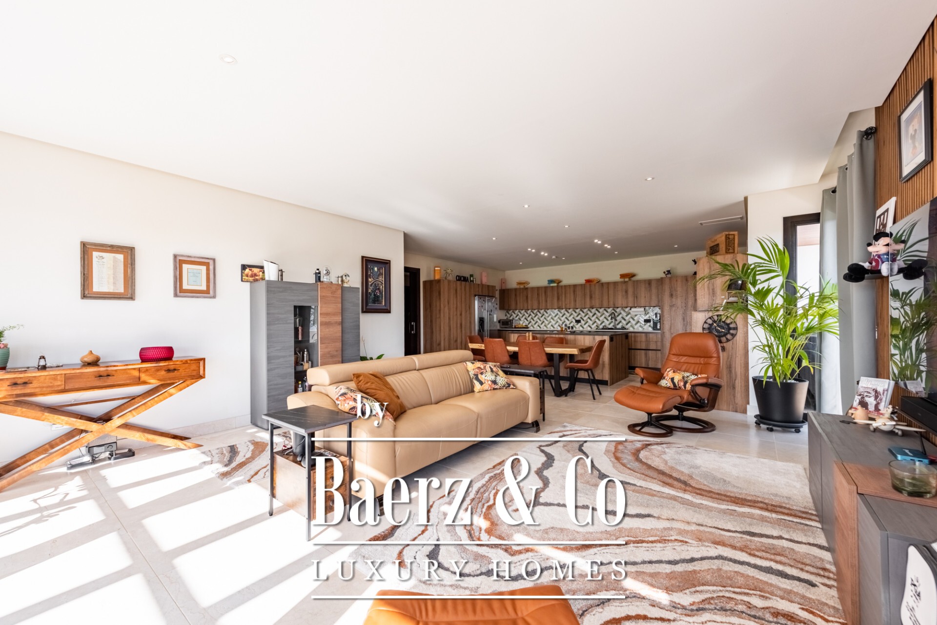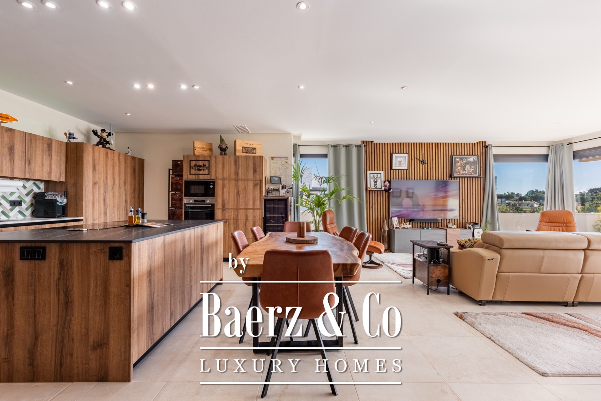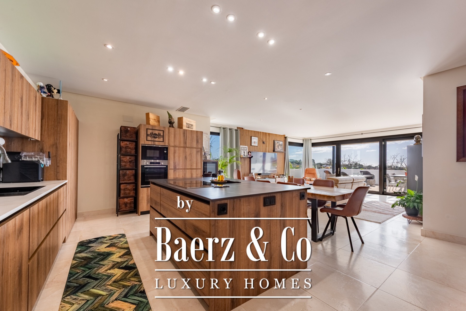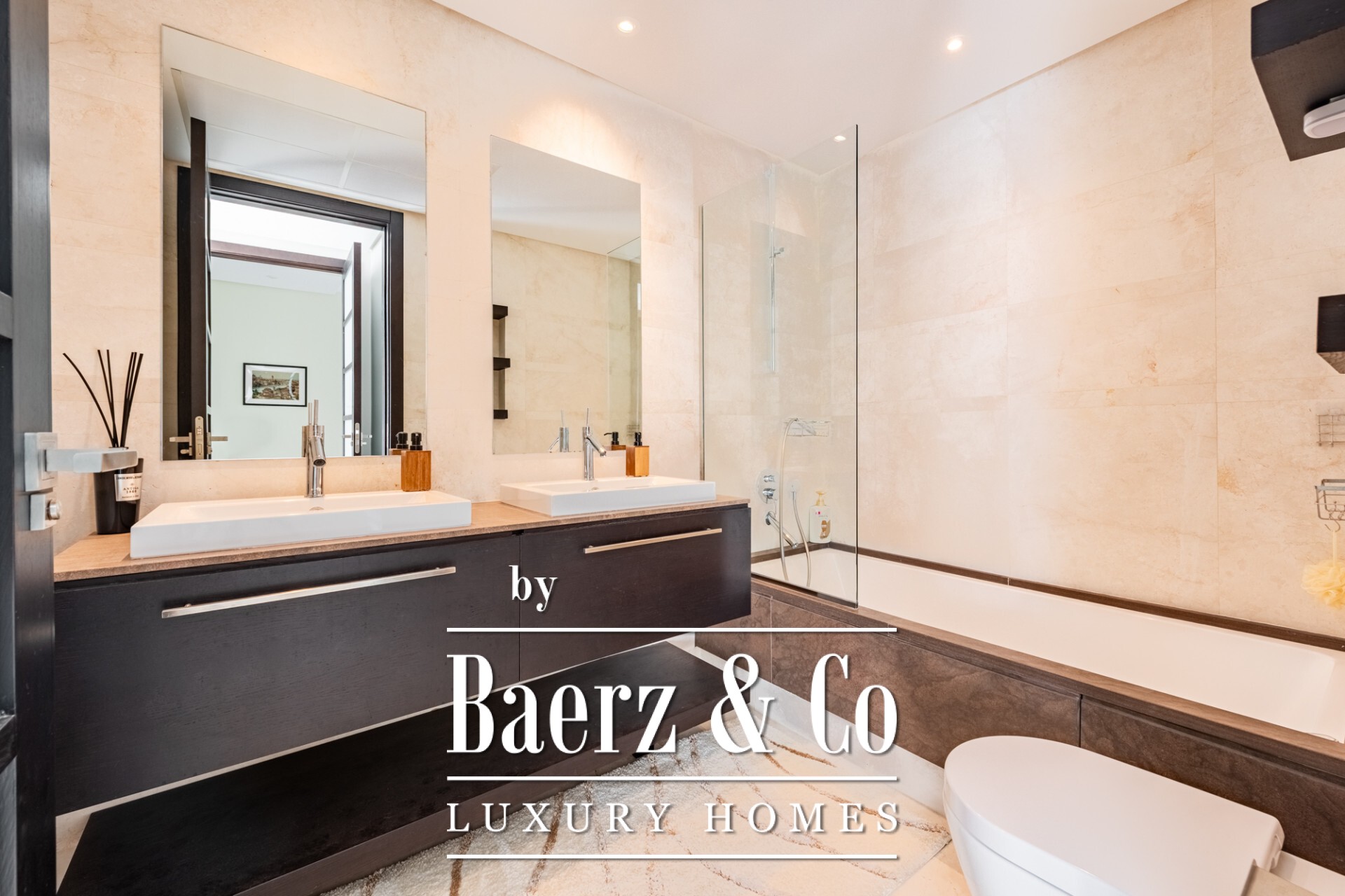 Throughout, marble floors and underfloor heating provide year-round comfort, complemented by air conditioning and double glazing. The main living areas open to south-facing terraces totaling 170 m², drawing in natural light and offering tranquil panoramic views over landscaped communal gardens.