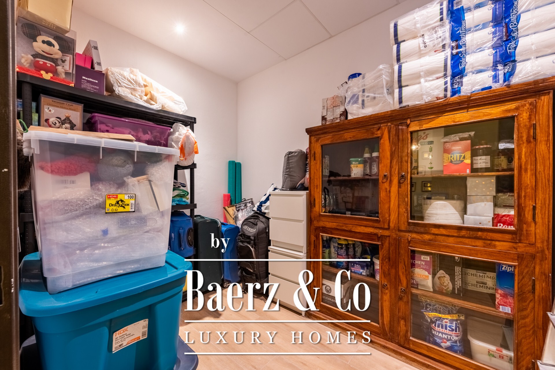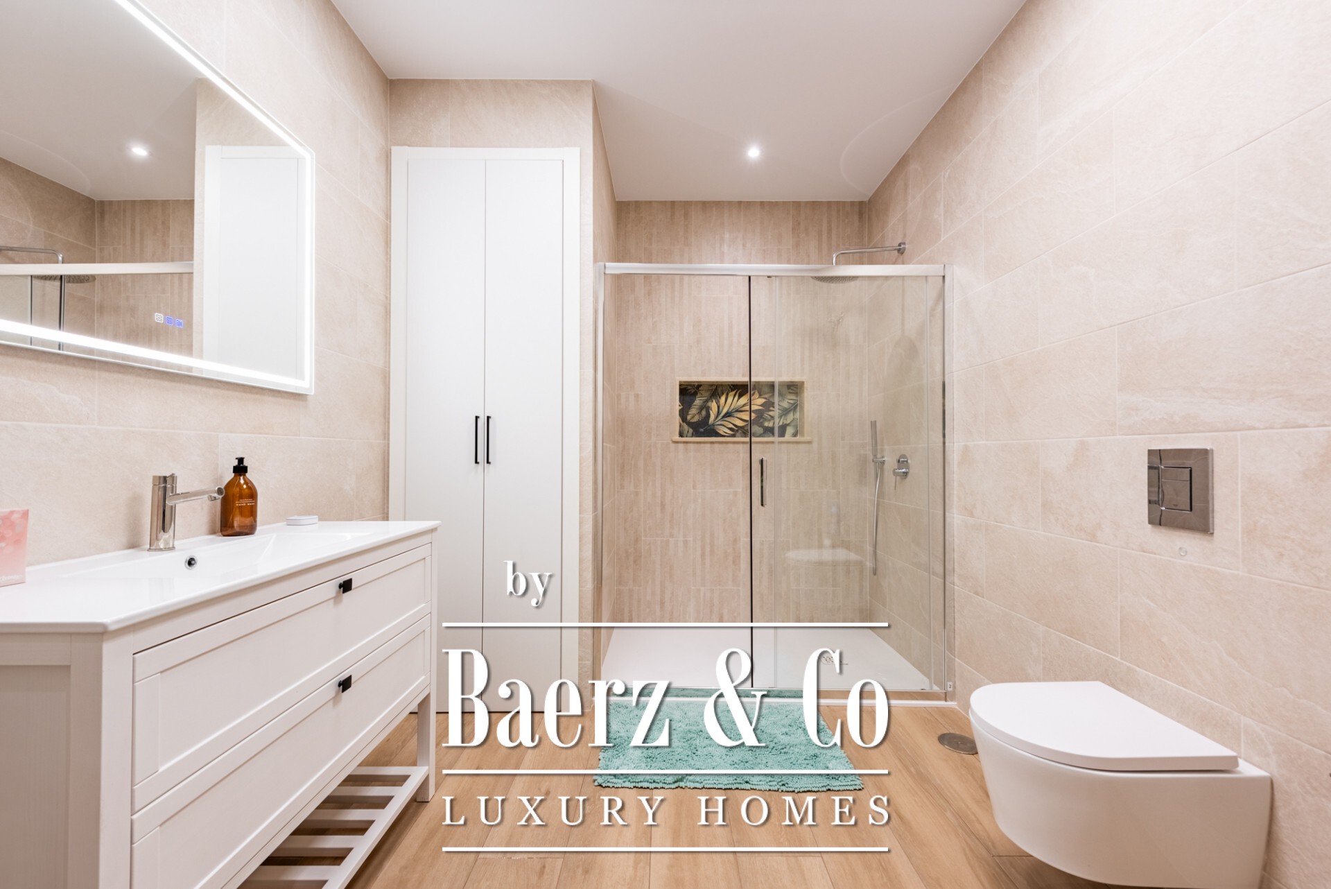 Spanning 548 m² across multiple levels connected by a private lift, this penthouse offers three bedrooms—two arranged as suites on the main and upper floors, and a particularly private en-suite room with direct lower-level access, generous storage, and a large private garage suitable for guests or staff.