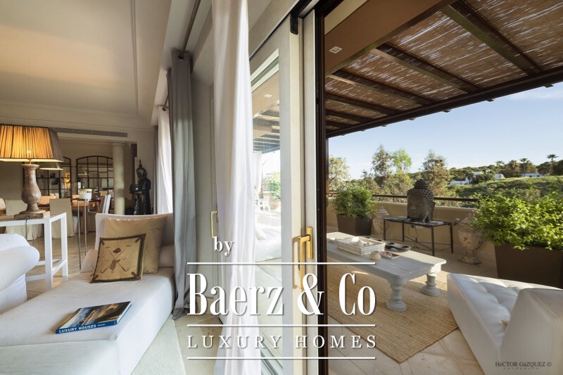 Penthouse Sotogrande in the esteemed Valgrande community enjoys a setting adjacent to the Real Club Valderrama, offering refined privacy within a renowned enclave. This residence spans 533 m² and is designed to accommodate four spacious en-suite bedrooms, ensuring personal comfort for family or guests. South-facing terraces of 193 m² invite the natural light inward, framing views across a tranquil gorge and beautifully landscaped gardens, with the outdoor areas ideal for extended dining or leisurely gatherings.