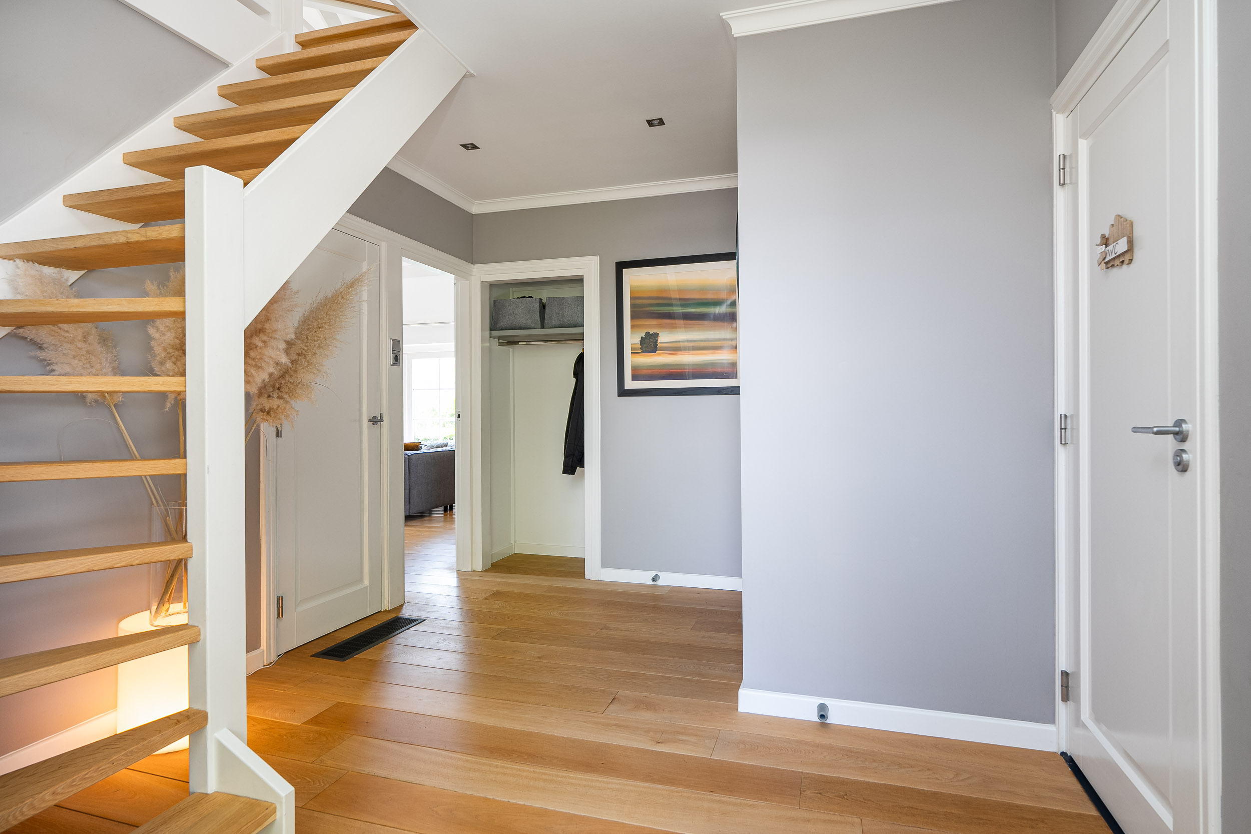 Upon entering, the sense of space in the hallway is immediately noticeable. The hallway provides access to the guest toilet, utility room, meter cupboard, and staircase.
