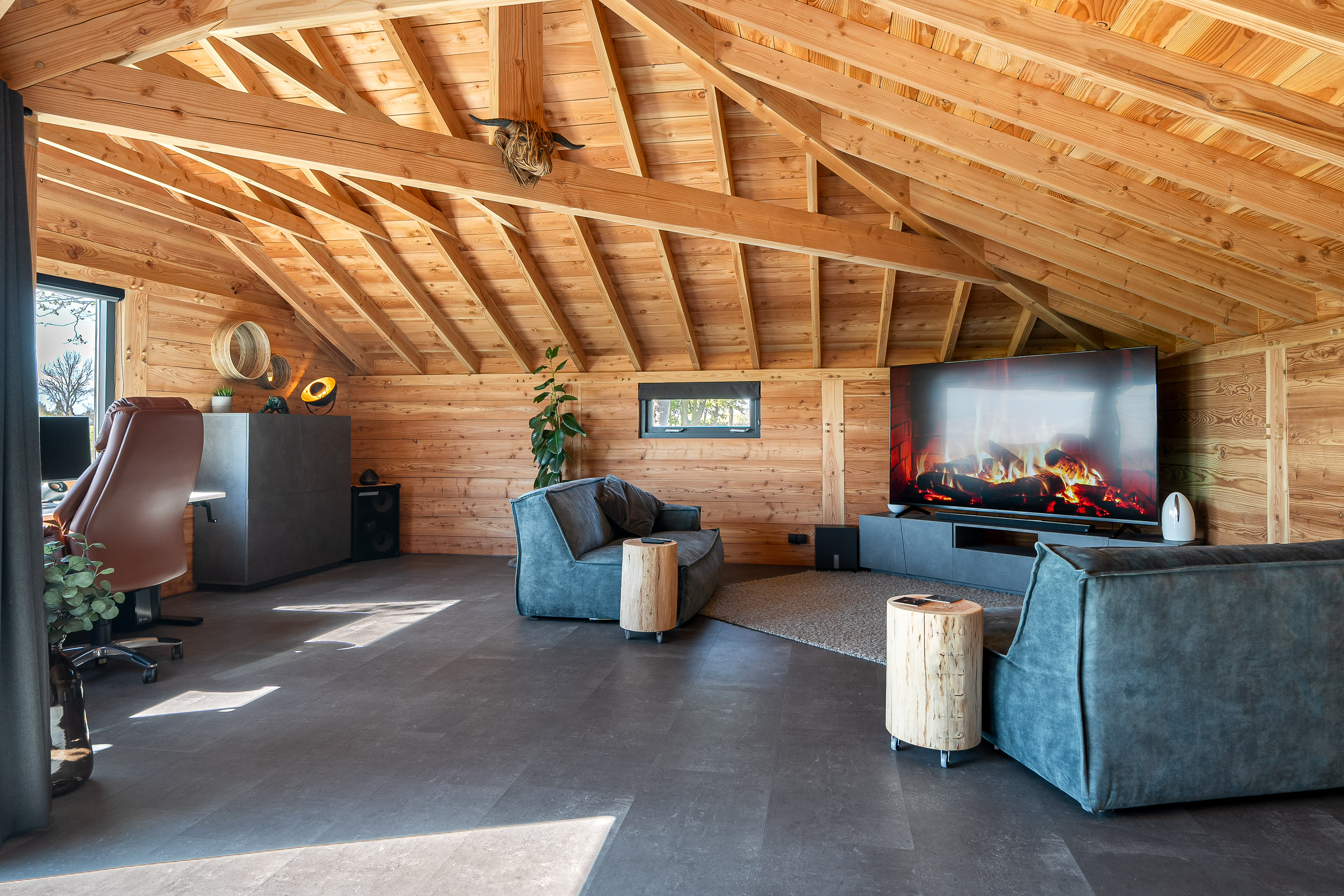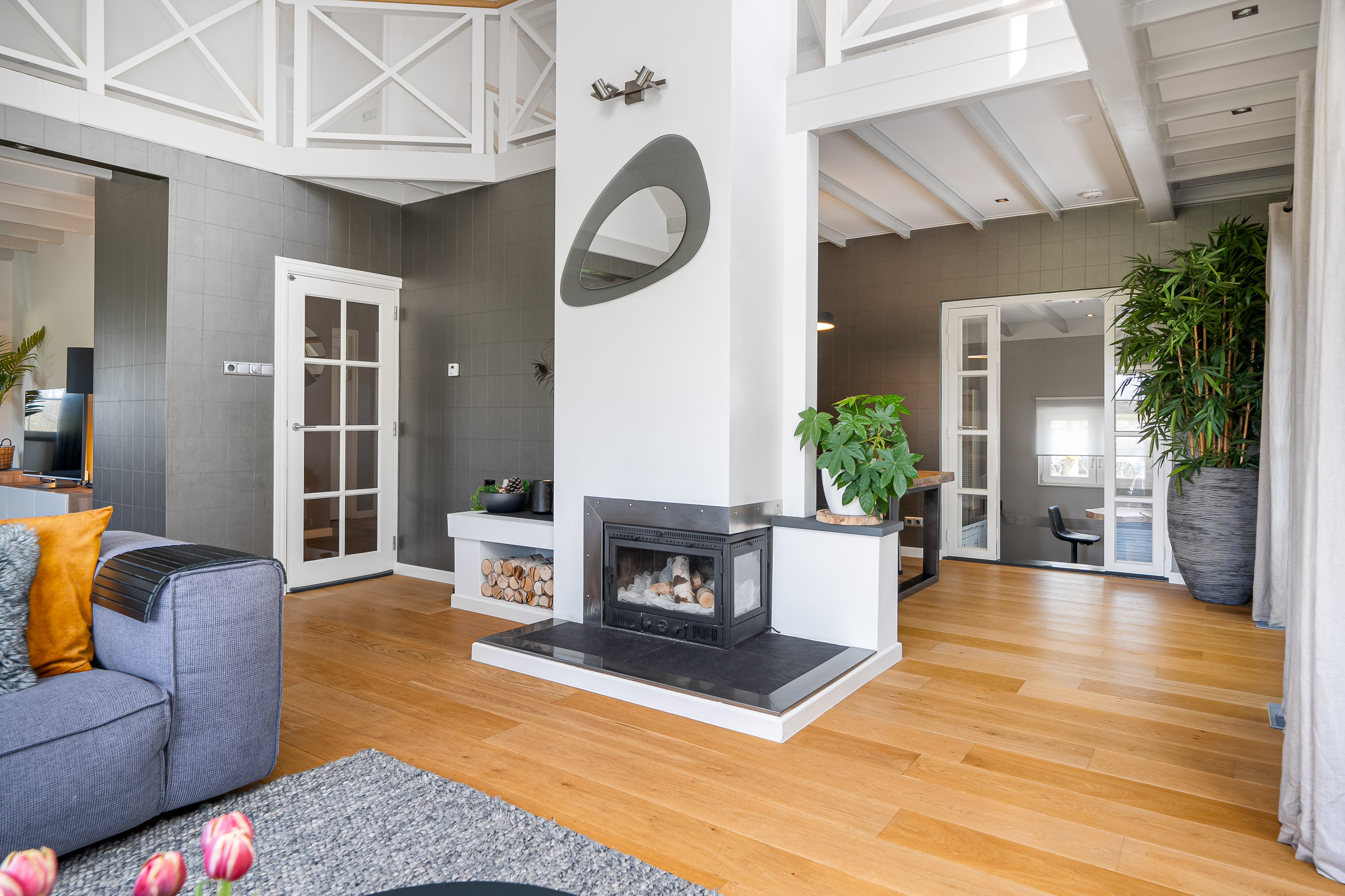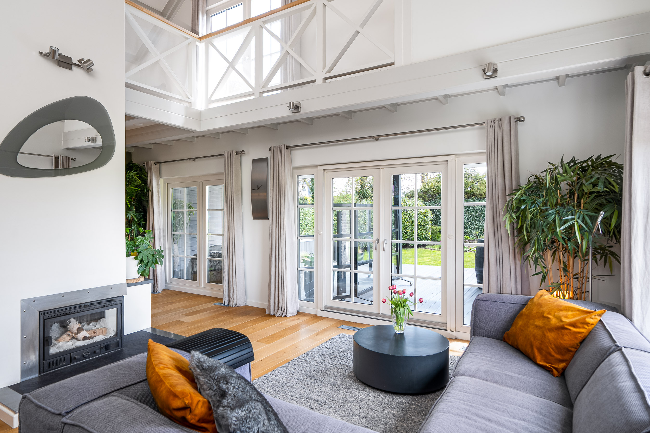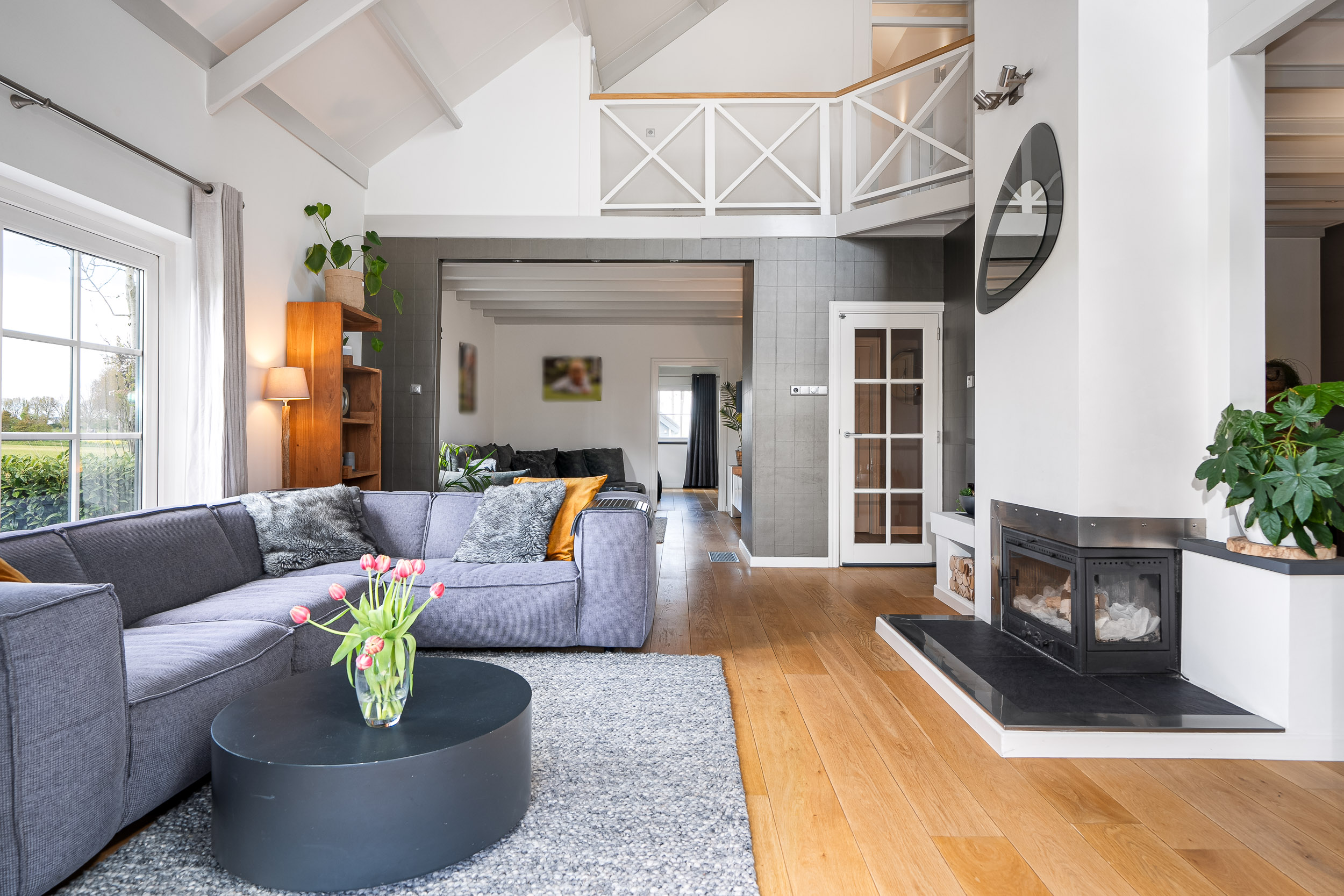 The living room is bathed in natural light due to the large windows and mezzanine, with each window offering views focused on the surrounding nature. The breathtaking panoramas never cease to amaze. The living room has various cozy corners, including a seating area around the wood-burning stove, an entertainment nook, and a dining area. A beautiful warm wooden floor with warm air heating runs throughout, and the French doors open directly onto the inviting veranda and terrace, which ensure complete privacy.