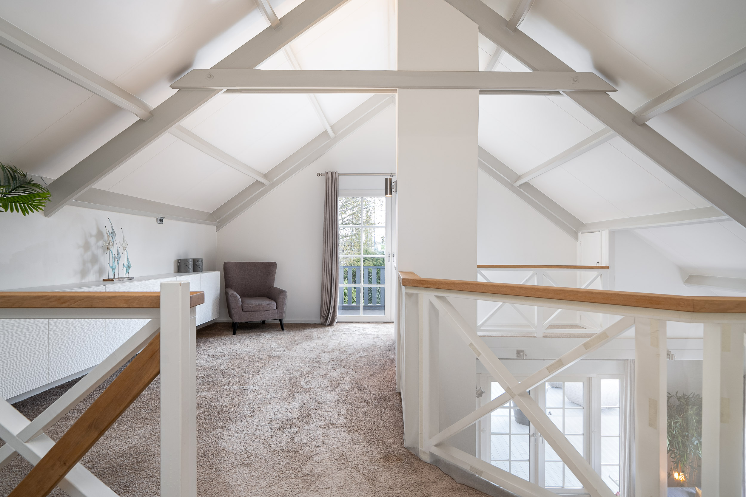 The mezzanine landing overlooks the living room and has double doors leading to a spacious south-facing sun terrace. This is a perfect place to experience the most beautiful sunrises and sunsets. The privacy here is complete due to the natural screening of the garden. The mezzanine area offers ample space for a cozy play area, workspace, or home library.