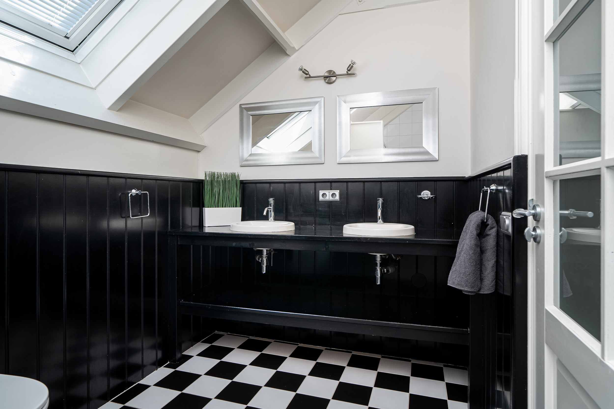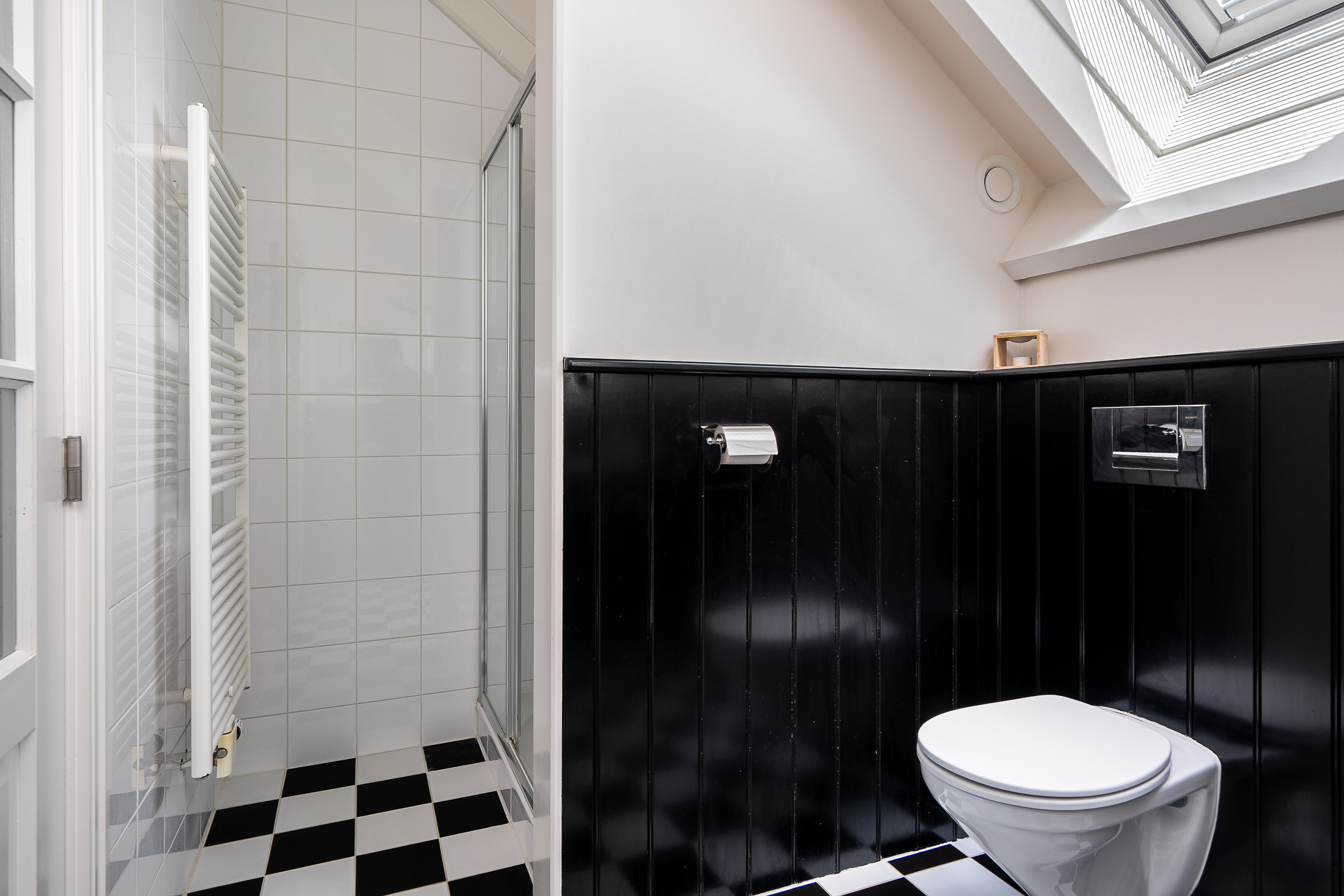 A door separates the landing from the bedrooms and bathroom. There are three generously sized bedrooms on this floor and a second spacious bathroom with underfloor heating, a double sink vanity, a walk-in shower, and a toilet. There is ample built-in storage in all rooms and along the sloped ceilings of the landing. Heating is provided through a warm air system.