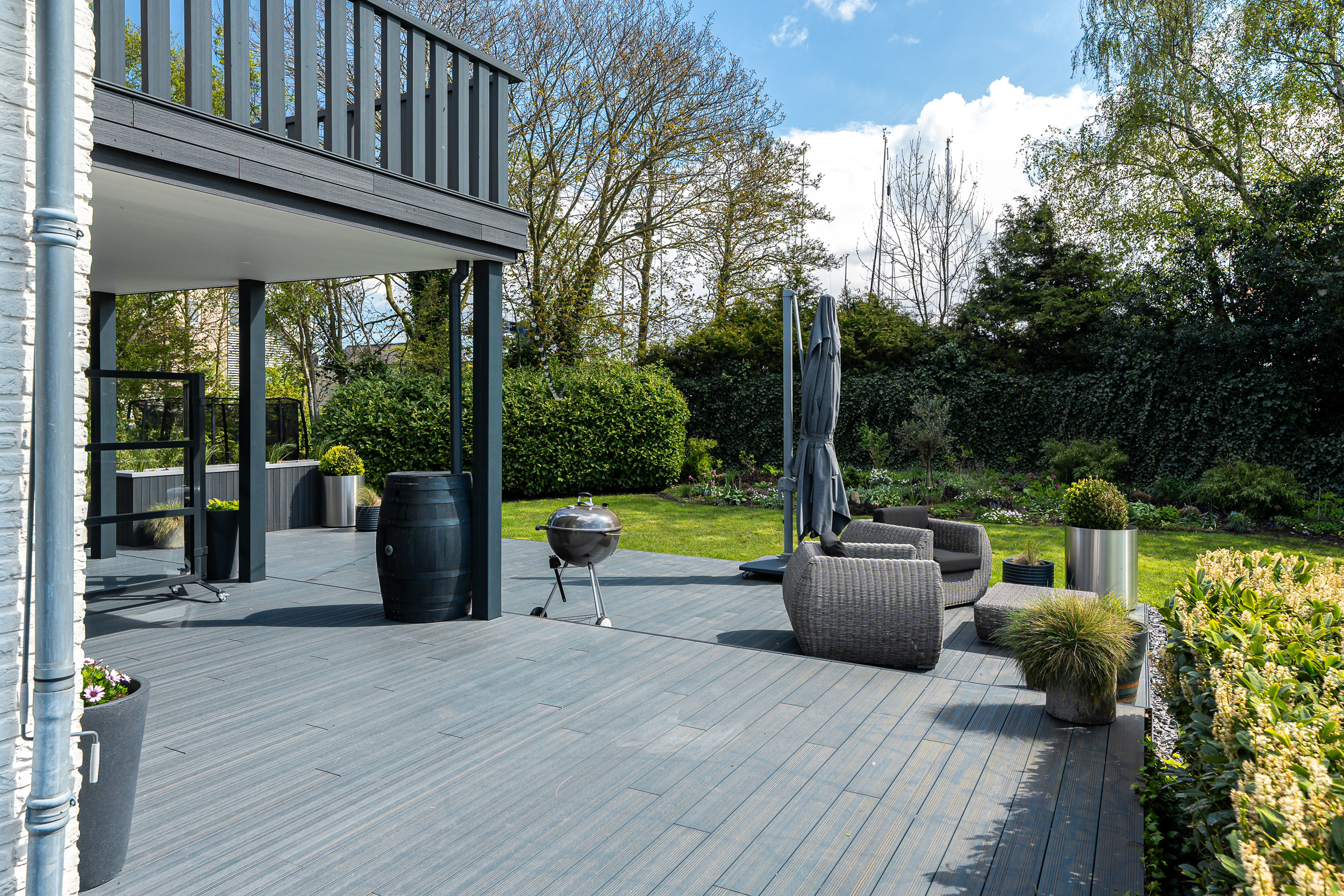 The architecturally designed garden, maintained by a robotic lawn mower, is easy to care for and features various fruit trees, hedges, and reed-lined waterways. The stylishly paved driveway and entrance gate mark the transition to the lush green surroundings.