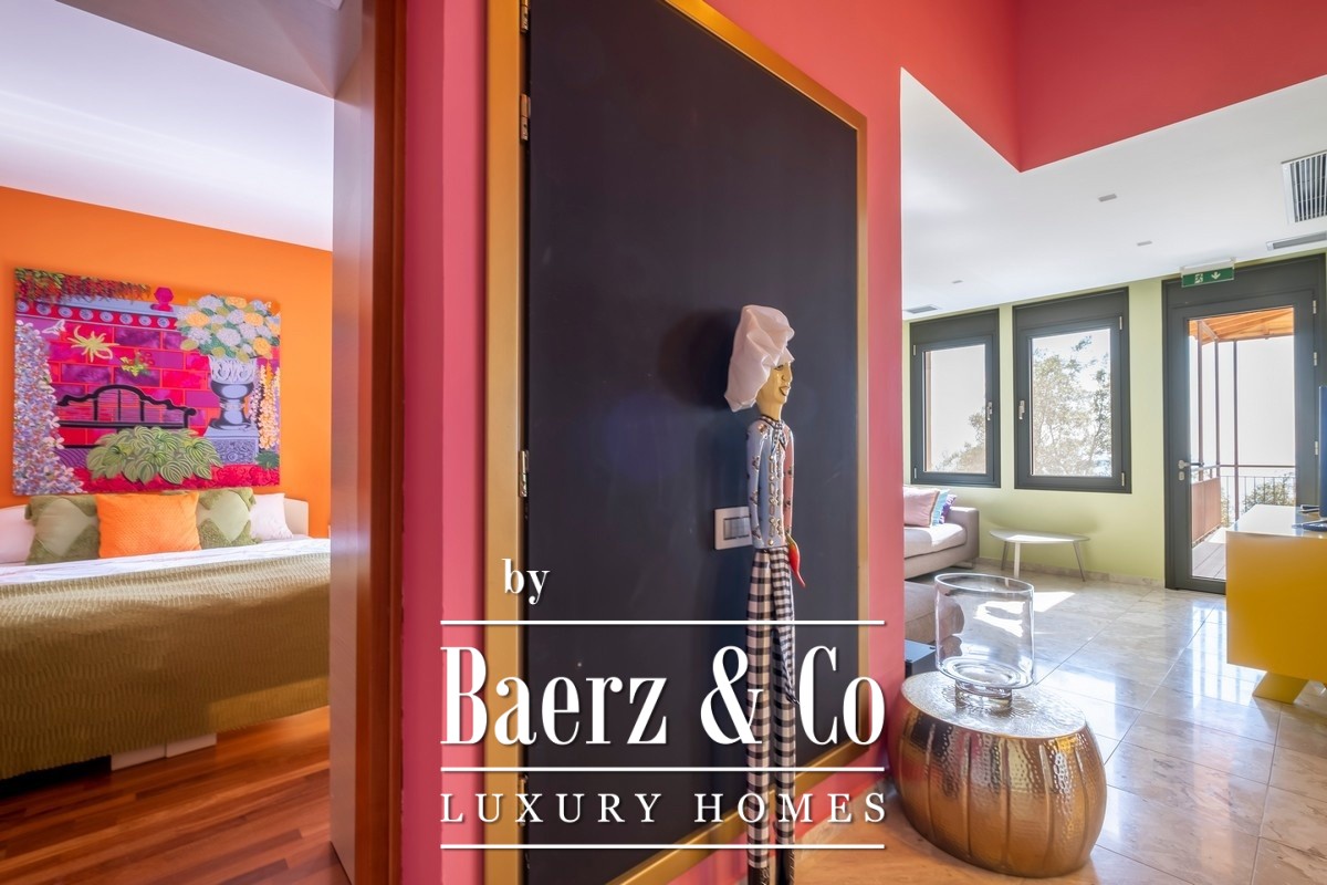 The interior design, guided by the current owners, balances form and function with a fully equipped Miele kitchen, pantry, dining area, indoor entertainment space, and a separate TV room. Comfort is maintained throughout by underfloor heating, central air conditioning, and a heat pump aligned with solar panels. Double-glazed windows and modern insulation ensure year-round efficiency, complemented by a security system, camera network, and LED lighting. The property’s technology extends to three dishwashers, three fridges, Wi-Fi coverage, automatic watering systems and a generator for continuity.