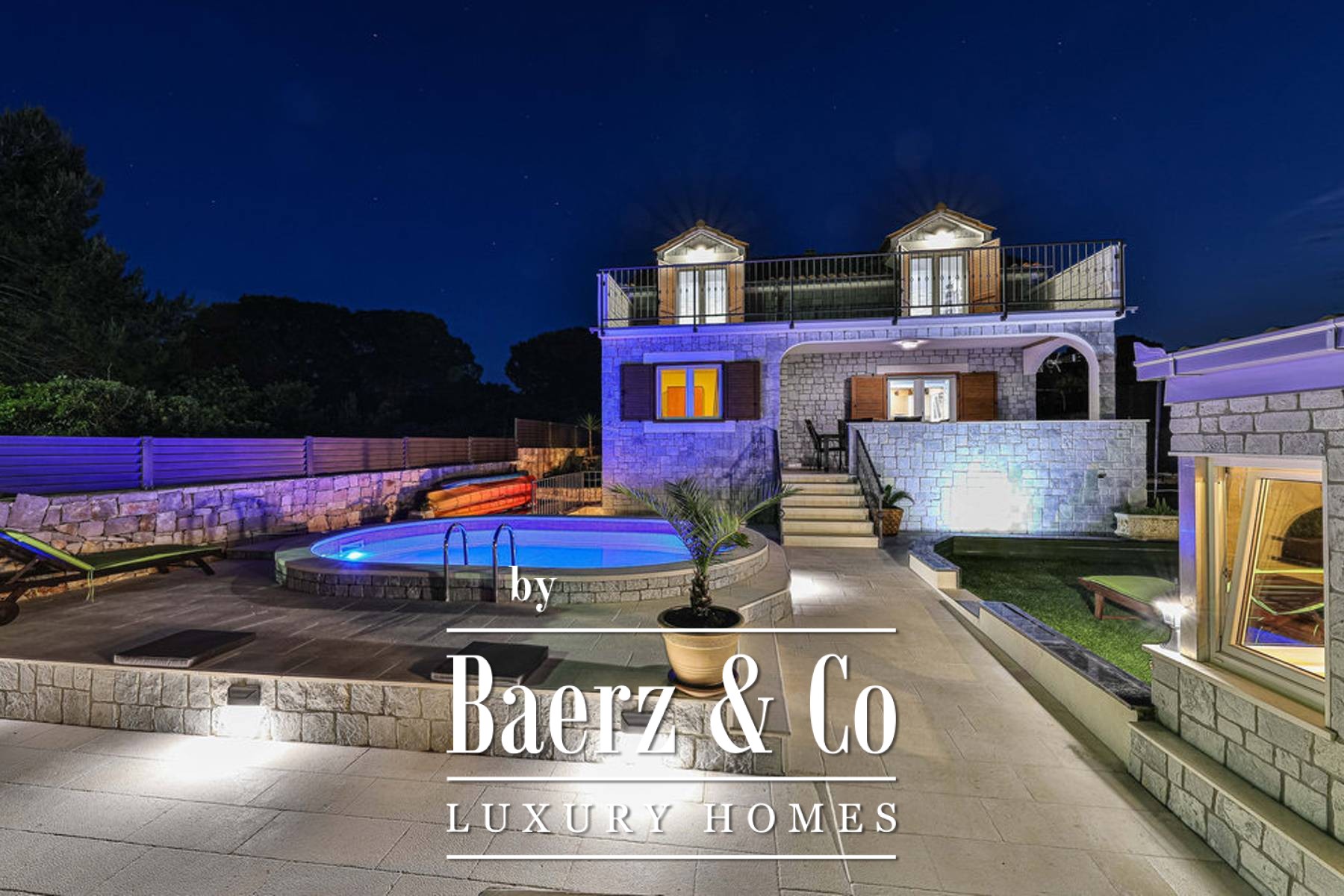 Enclosed by high stone walls and fencing, the villa ensures complete privacy. The grounds include a landscaped yard, a 50 m² indoor football field, and a mature Mediterranean garden, all set in a tranquil part of Drvenik Island near a celebrated beach. The villa invites those seeking a retreat rooted in authenticity, light, and peace—while keeping the vibrancy of Trogir close at hand. For investors or those seeking a luxury villa for sale in Trogir Okolica, the property delivers an enduring sense of place beside the Adriatic.