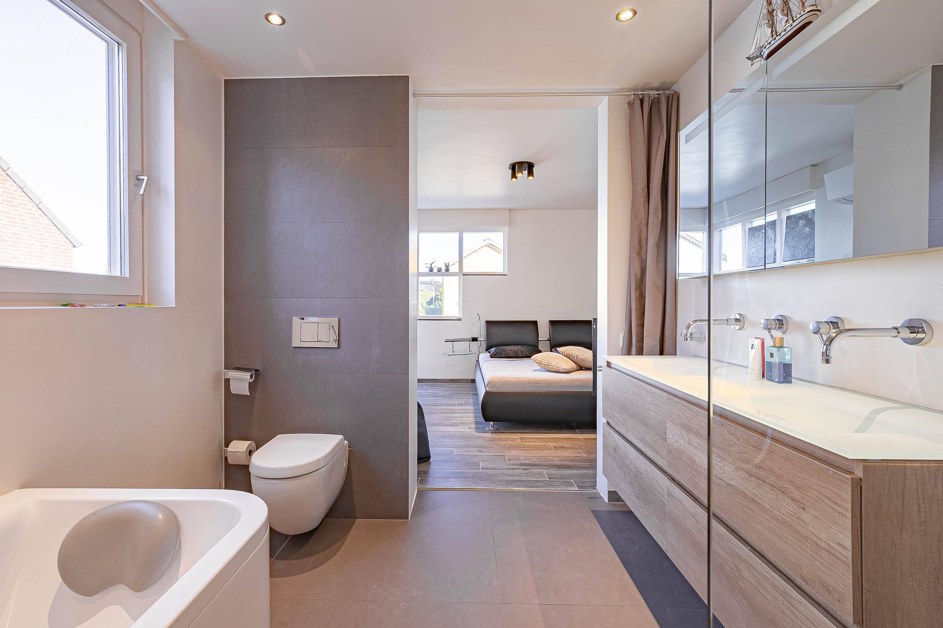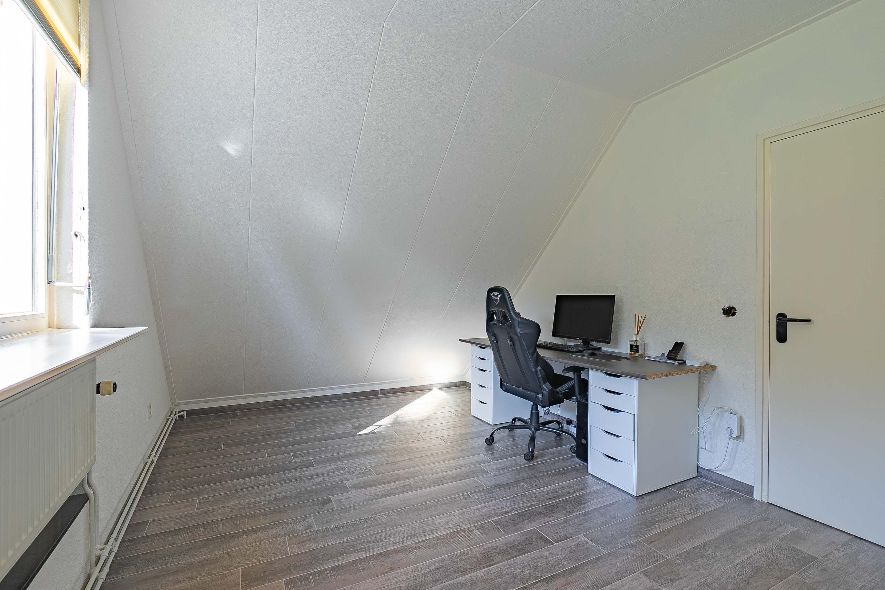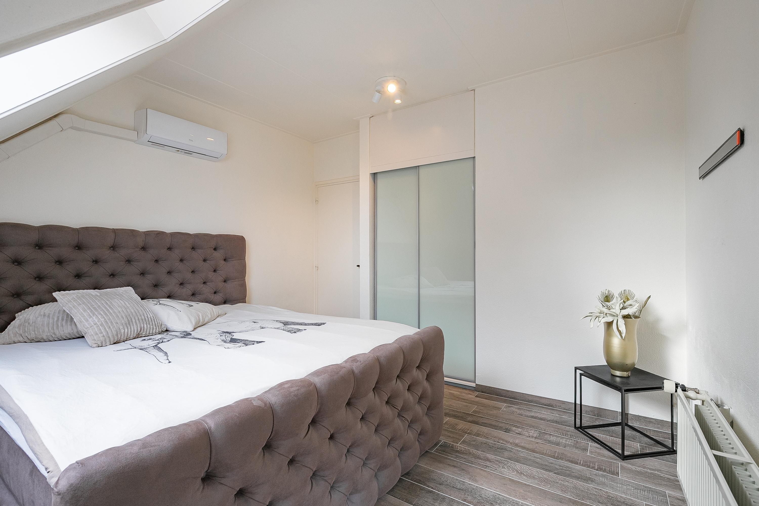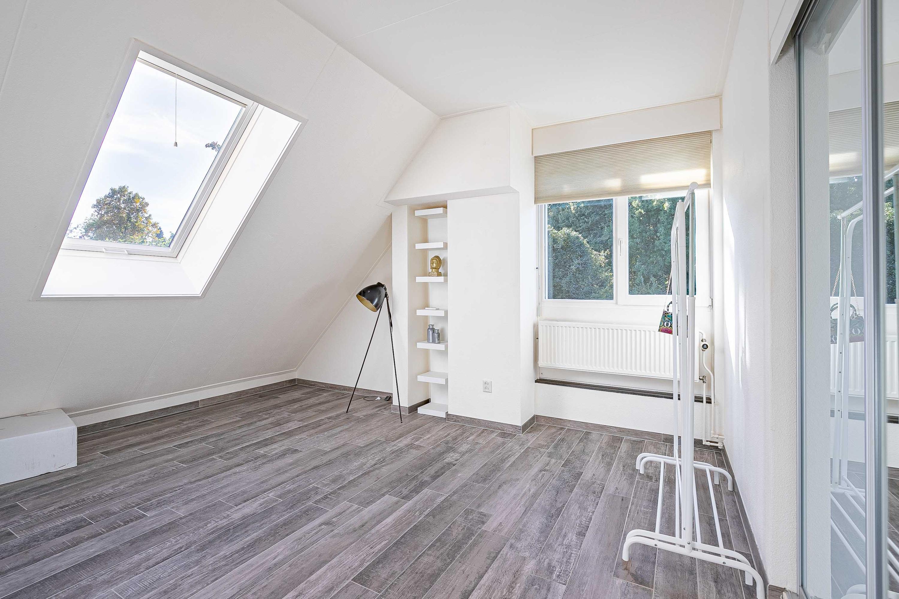 Overloop met lichtkoepel. Drie slaapkamers (ca. 12m², 10m², 9m²), waarvan twéé slaapkamers voorzien van zonneschermen. Badkamer (ca. 4m²) met douche en vaste wastafel. Ook bevindt zich op deze verdieping een separaat toilet. De gehele eerste verdieping is voorzien van houten kozijnen, dubbel glas en een keramische vloer. De eerste verdieping heeft een hoogte van 2,45m met uitzondering van de oppervlaktes onder het dakschuin.