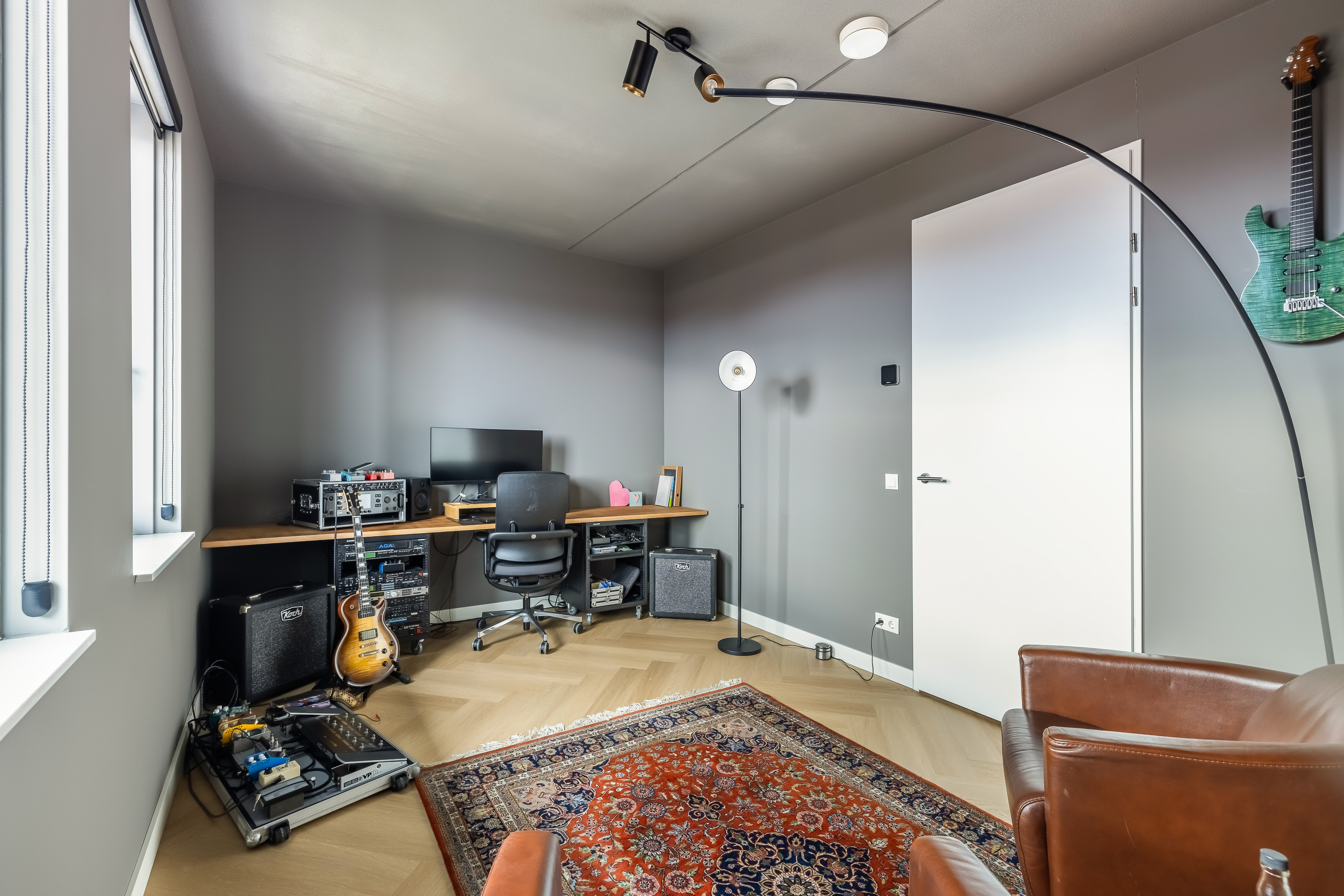 Landing and technical room. At the front is the master bedroom with a beautiful built-in wardrobe. At the rear is currently a large man cave, but this space can also serve as an additional large bedroom. The home is so well insulated that even playing the guitar won’t disturb the neighbours — how perfect is that?