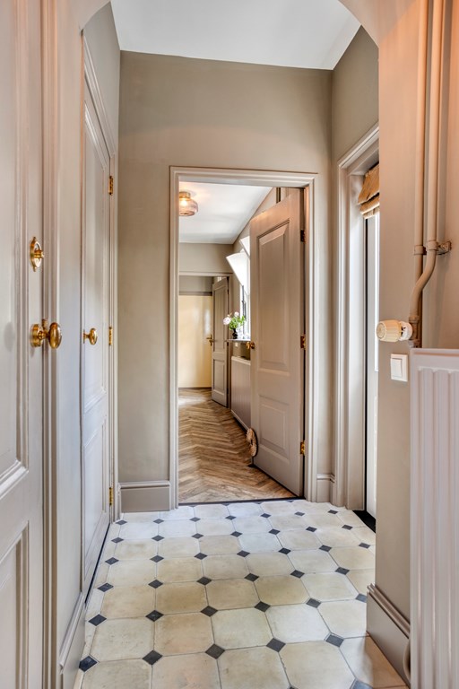 The generous hallway sets the tone right away: high ceiling, a combination of classic tiles and sleek walls, elegant staircase, panelled doors, and an authentic feel. From here you access various rooms, including the living room, dining room, WC with washbasin, and the kitchen.