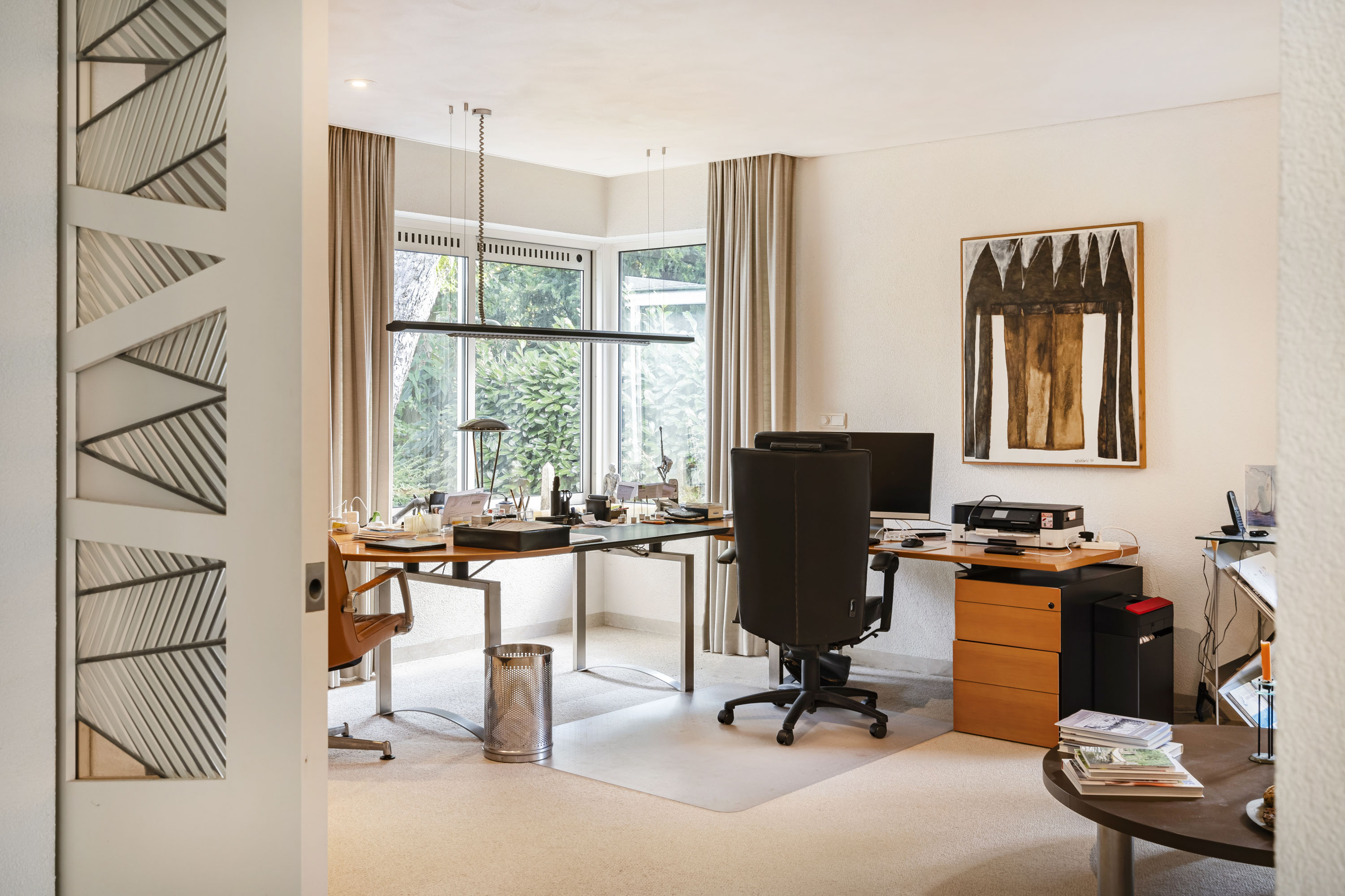 Moving further into the home, you enter the exceptionally large living area. The lounge features a full-width glass façade, offering breathtaking views of the garden. The open-plan kitchen is connected to a utility room, which includes a dumbwaiter from the basement. The dining room is located on the garden side, and in between lies a spacious study. All of these areas flow openly into each other, while the study and kitchen can be closed off with elegant sliding doors. The large covered terrace, accessible from the living room through sliding doors, features an electric retractable roof and sunshade.
