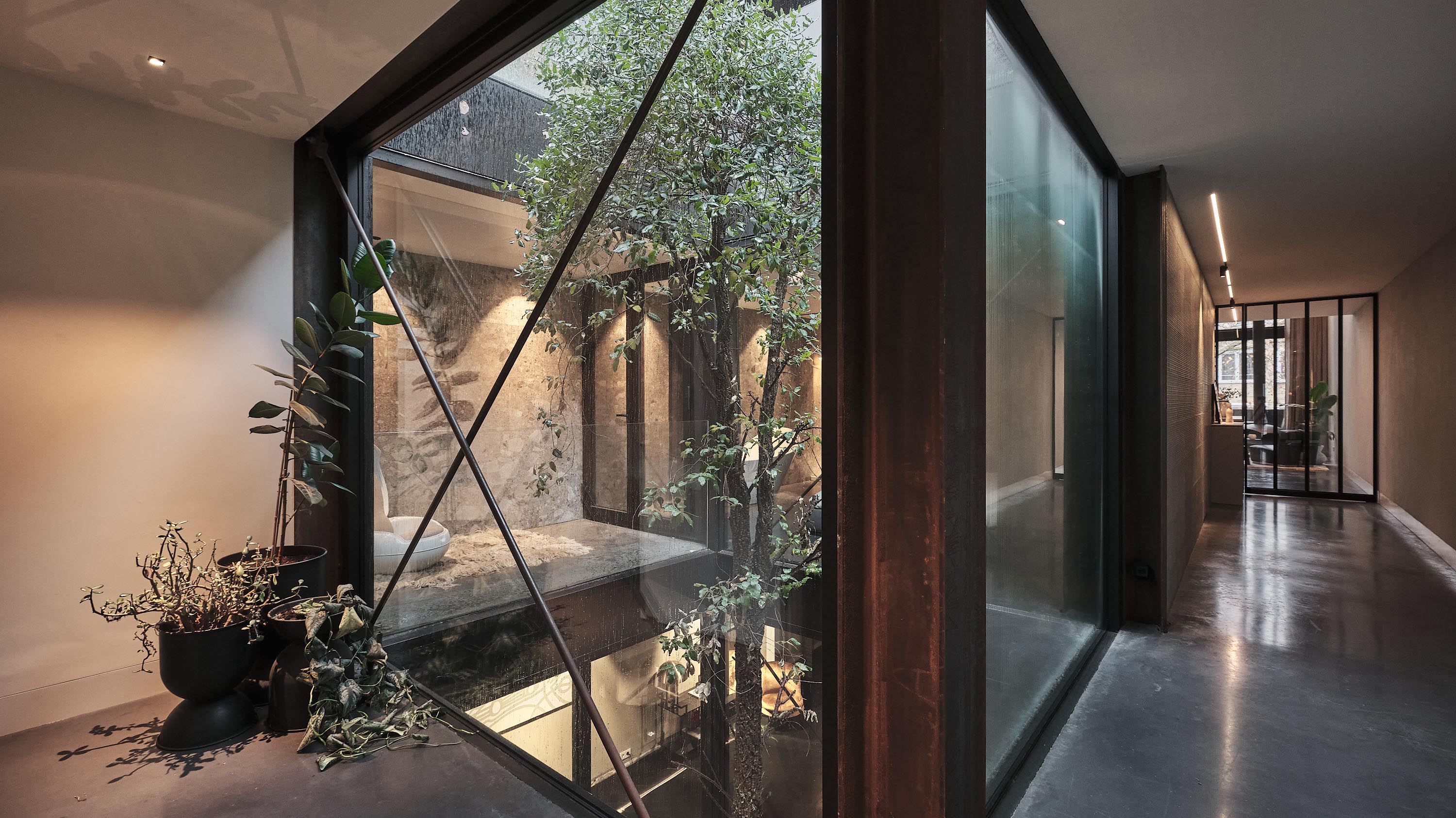 The residence at Cedron forms a serene oasis featuring high-quality materials and an iconic vertical glass shaft with a Tuscan cork oak as a living sculpture. The presentation space on Nieuwstraat, by contrast, is a restrained and thoughtfully designed workspace where clarity, focus, and creativity take centre stage.