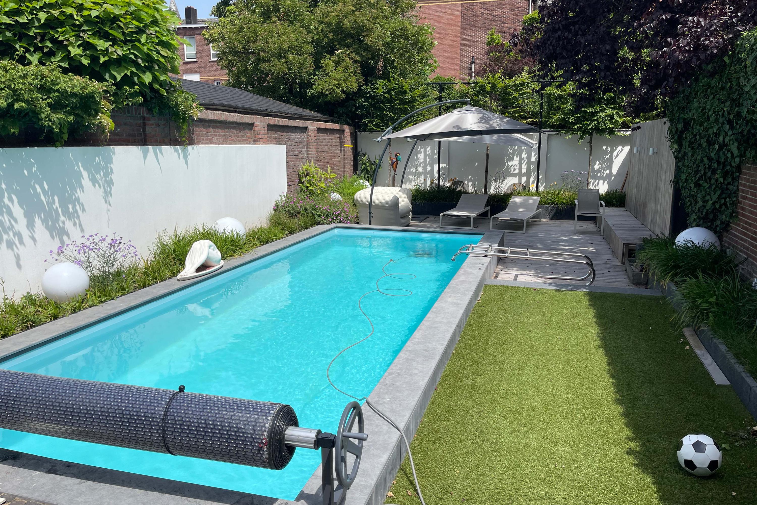 De onder architectuur aangelegde achtertuin is heerlijk diep en biedt door verschillende niveaus extra privacy. De tuin is o.a. voorzien van een bestraat terras, kunstgras en padouk houten vlonders. De tuin is volledig ommuurd. Je geniet hier van veel rust ondanks dat je je op steenworp afstand van het centrum van Venlo bevindt. Het is een grote tuin met zwembad (met warmtepomp), elektra en buitenverlichting.