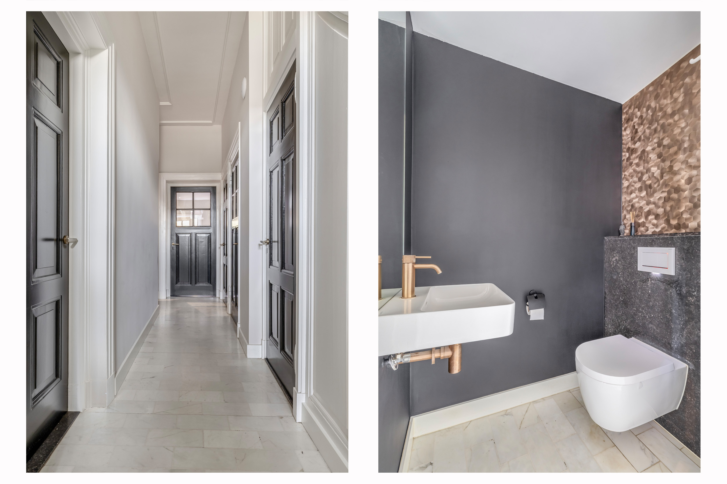 The deep and wide living room is fitted with extra-wide French oak herringbone parquet flooring. The impressive high ceiling features original ornaments and cornices with integrated dimmable lighting. At the front, you enjoy unobstructed views of the Rosarium. A gas fireplace adds extra ambience, while the air conditioning provides both cooling and heating. Due to the raised position of the windows relative to the pavement, there is no visibility from outside. At the rear, French doors open directly onto the garden.