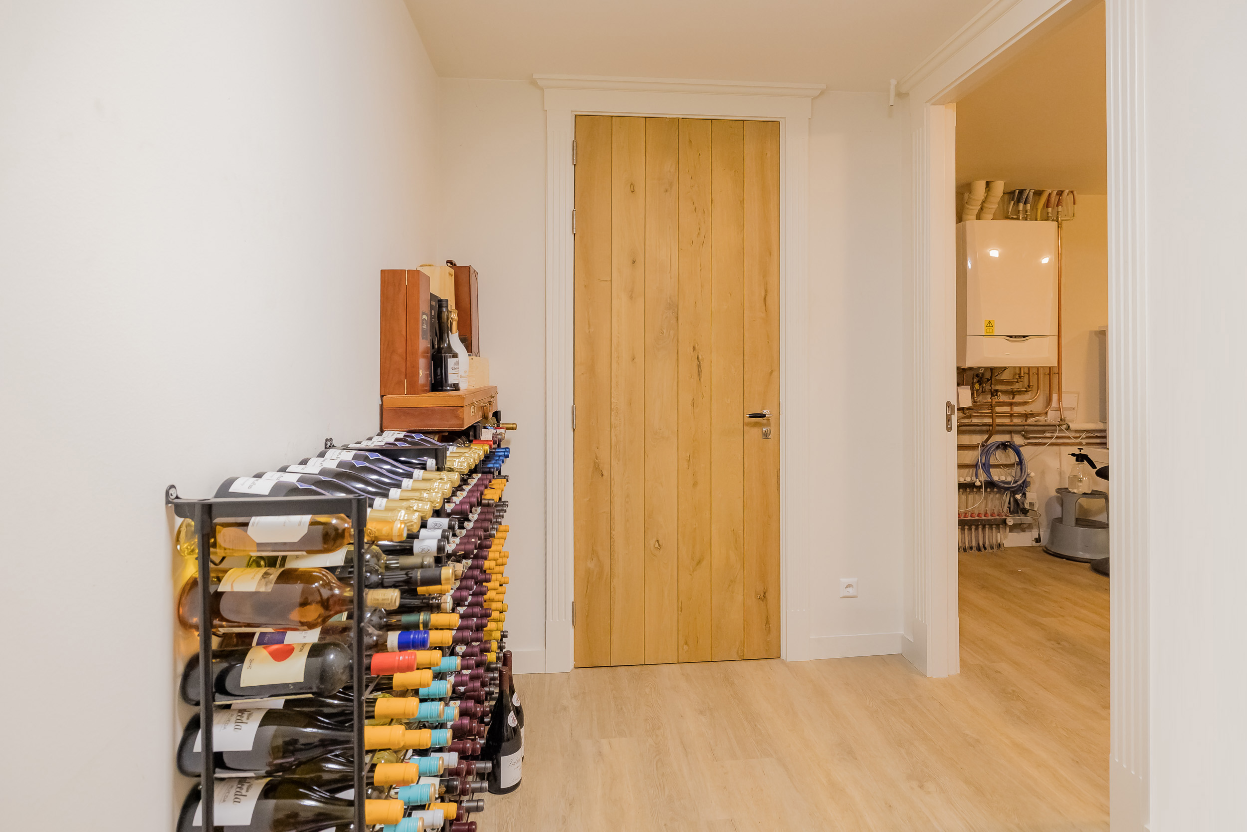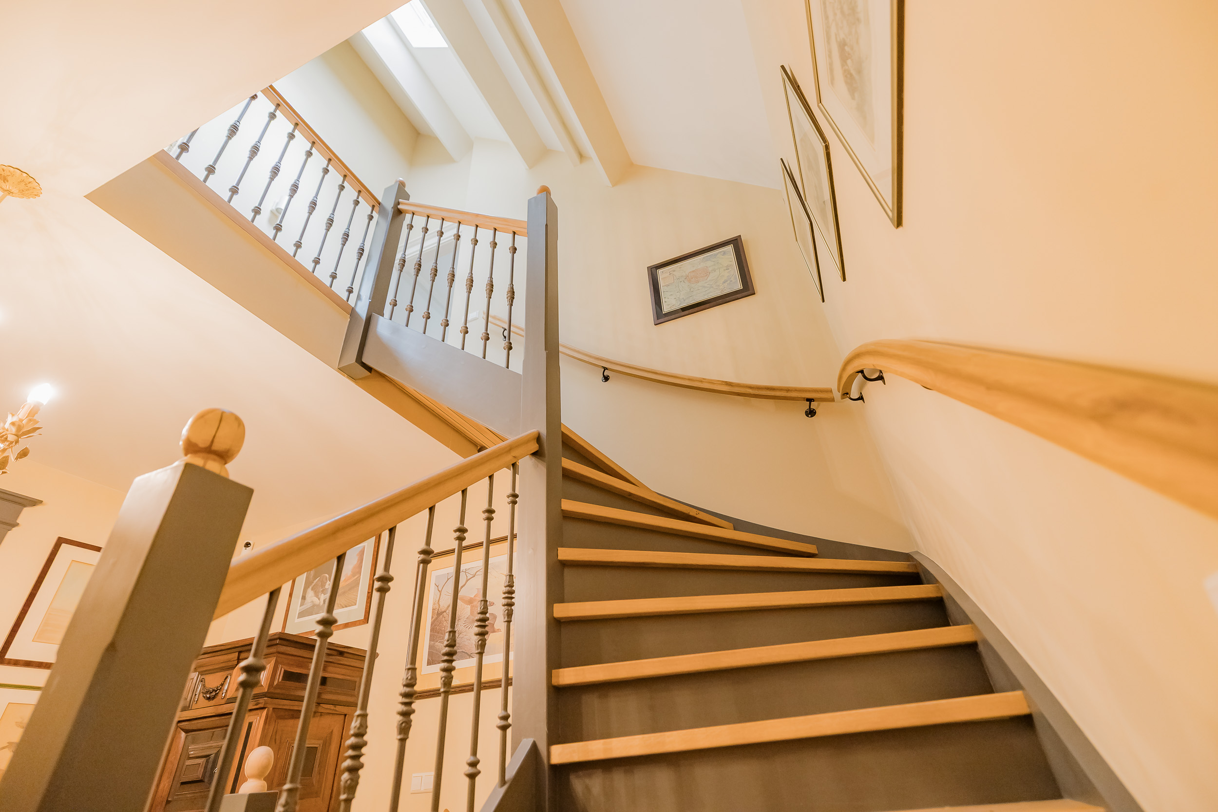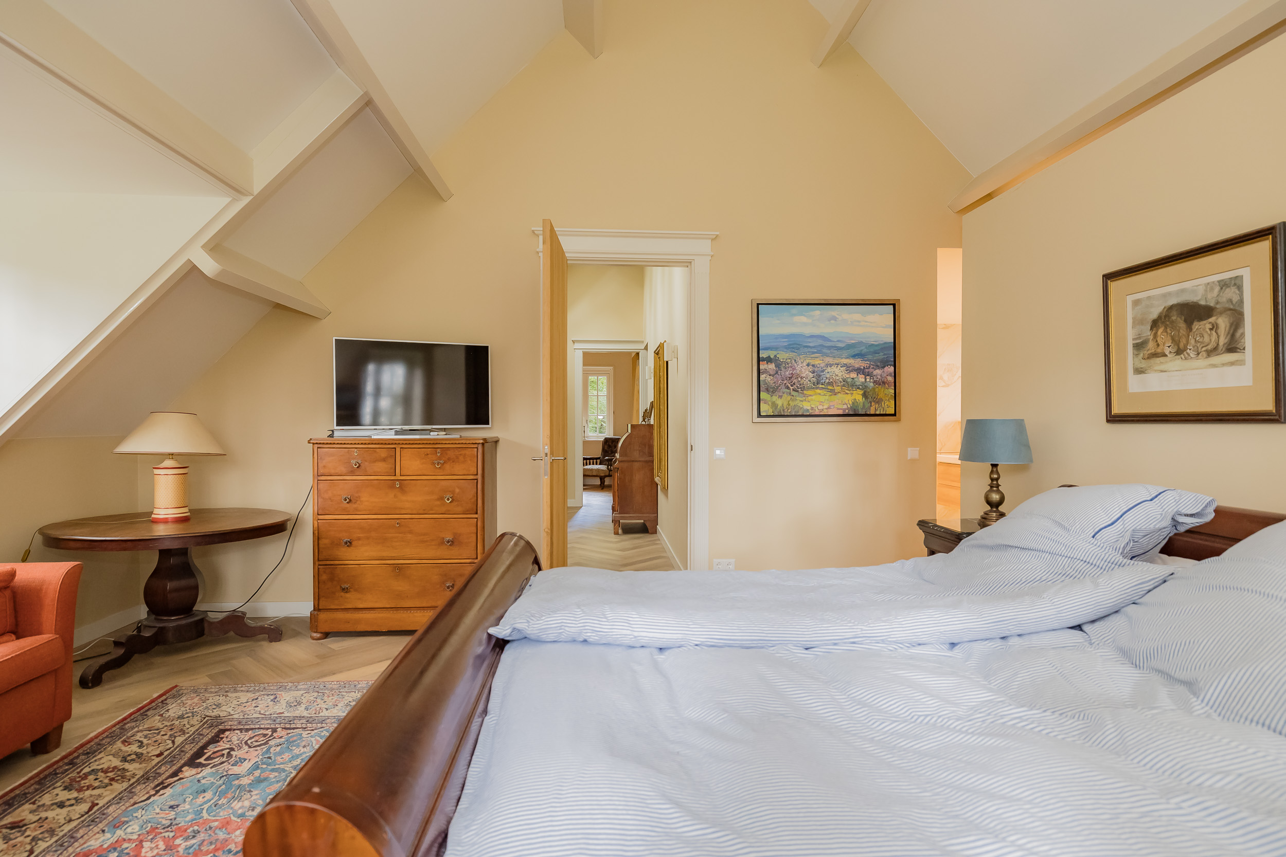 All rooms are accessible via the impressive central hall with its beautiful staircase and elevator. The bright living room is a wonderfully spacious place to enjoy the peace and quiet and the view, and offers direct access to the veranda. The fireplace and underfloor heating add to the atmosphere and comfort. At the front of the house is a cozy drawing room (or dining room) with a view of the forest. Between these rooms is a spacious workspace.