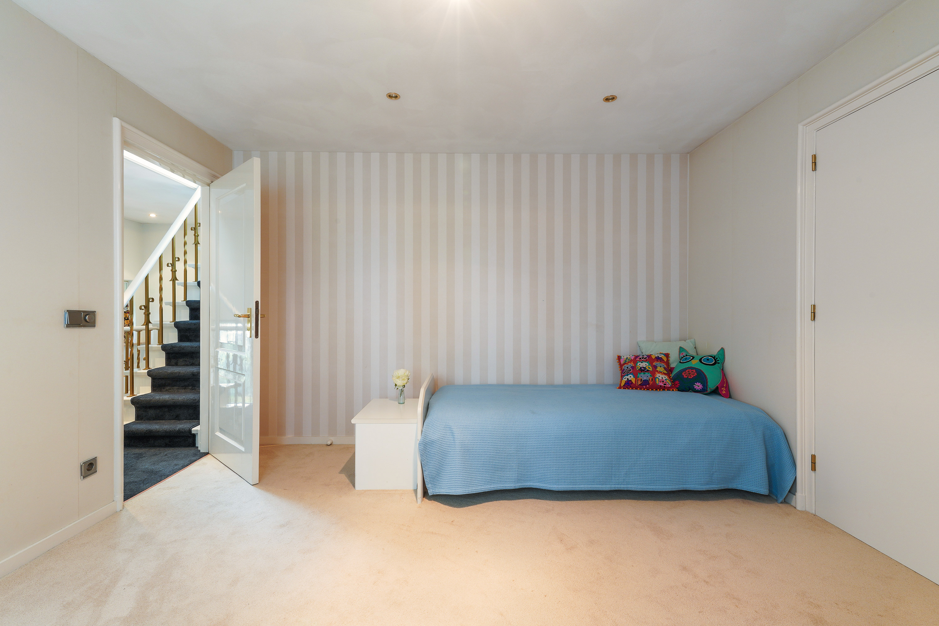 On the first floor, there are two very spacious bedrooms. The rear bedroom serves as a true master suite, complete with air conditioning, a built-in wardrobe, a balcony overlooking the back garden, and direct open access to the luxurious bathroom featuring a bathtub, shower, toilet and double washbasin with vanity unit. The second bedroom, located at the front, includes convenient built-in storage under the eaves. This floor also offers a second bathroom with a shower and washbasin, as well as a separate toilet on the landing.