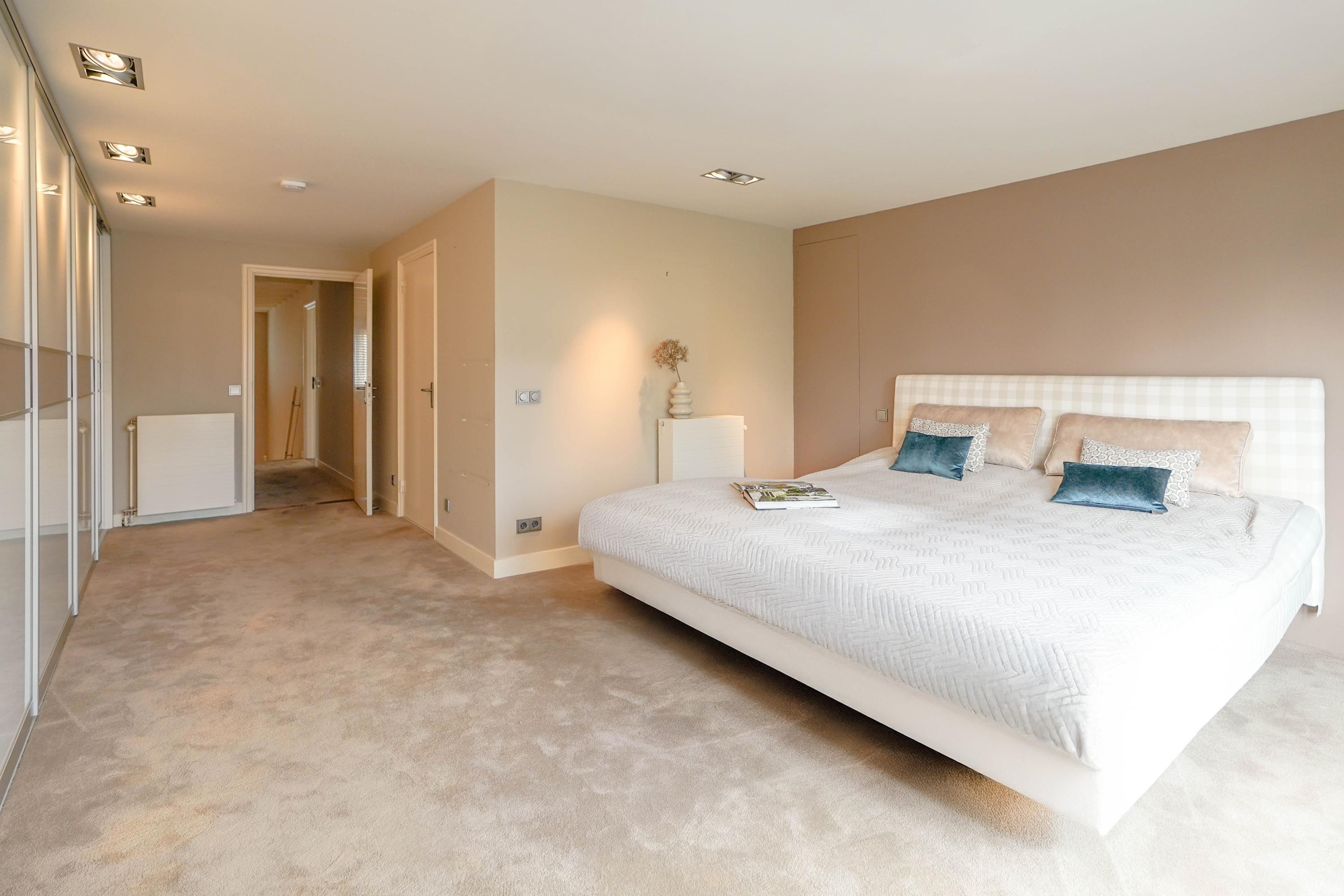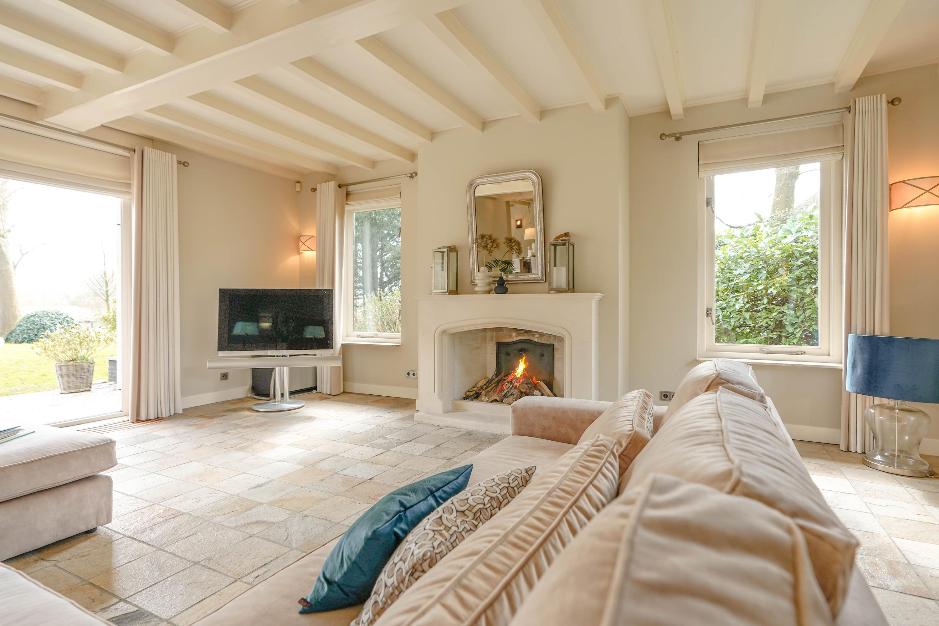 Beyond the formal entrance, the ground floor is arranged for natural light and easy flow, with an elegant living room featuring a sandstone fireplace and direct access to sunlit terraces. A spacious kitchen, utility room, and conservatory—facing the garden, water, and reserve—anchor daily life in a calm rhythm. The ground floor benefits from underfloor heating, and the conservatory is cooled by air conditioning. The villa includes a double garage, several parking spaces, and a certified alarm system.