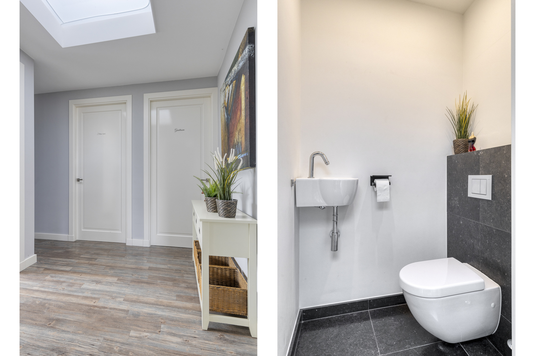 The ground floor also includes a home office or study, a practical utility room and a large multifunctional wing. This wing can serve as an office, salon or practice space, or – in combination with the garage with a full upper floor – as a comfortable guest or in-law suite. A private toilet and kitchenette are already present.