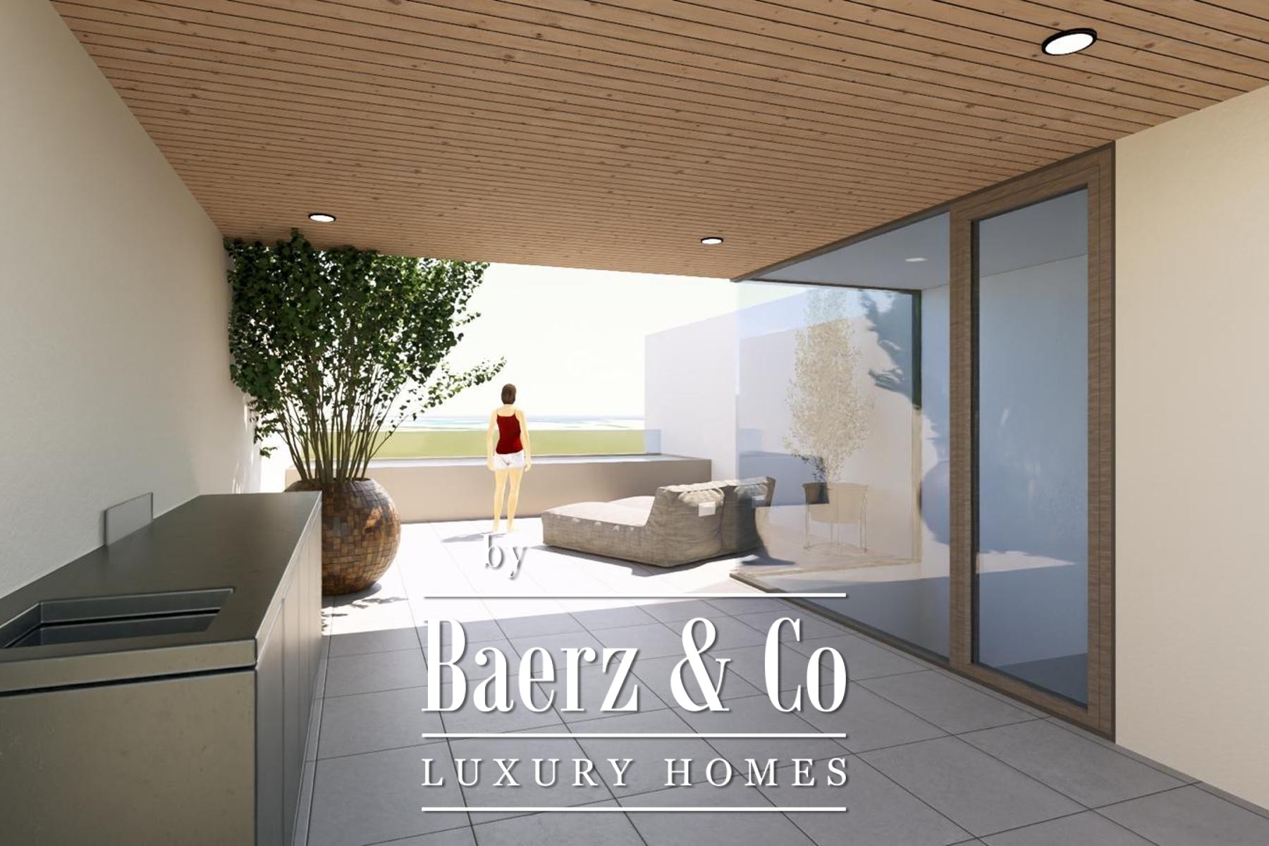 The apartment’s rhythm unfolds through an entrance hall leading to a luminous living area, dining space, and kitchen, all unified by high-quality oak chevron parquet. Frameless glass walls provide transitions between inside and out, opening to terraces and a private pool on the upper level. The core floor plan places the main bedroom with two additional children’s rooms, complemented by three bathrooms for fluid daily living.
