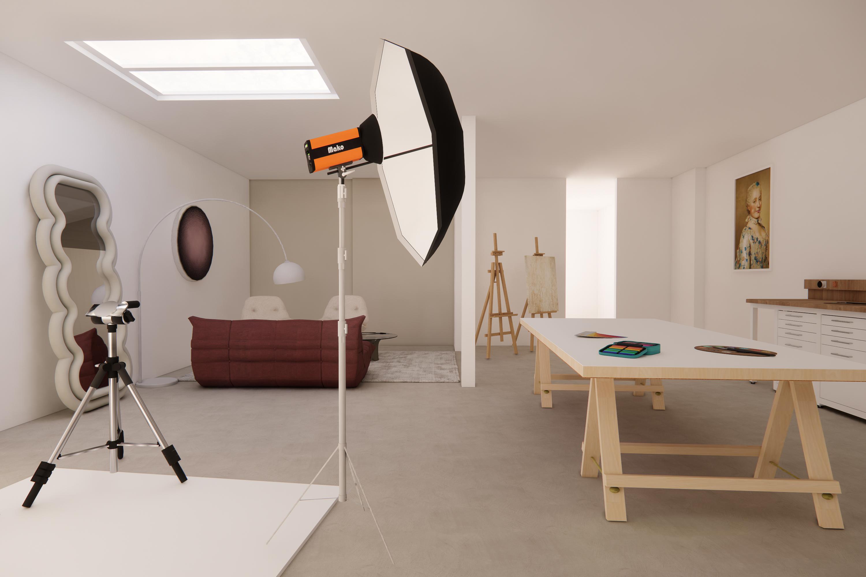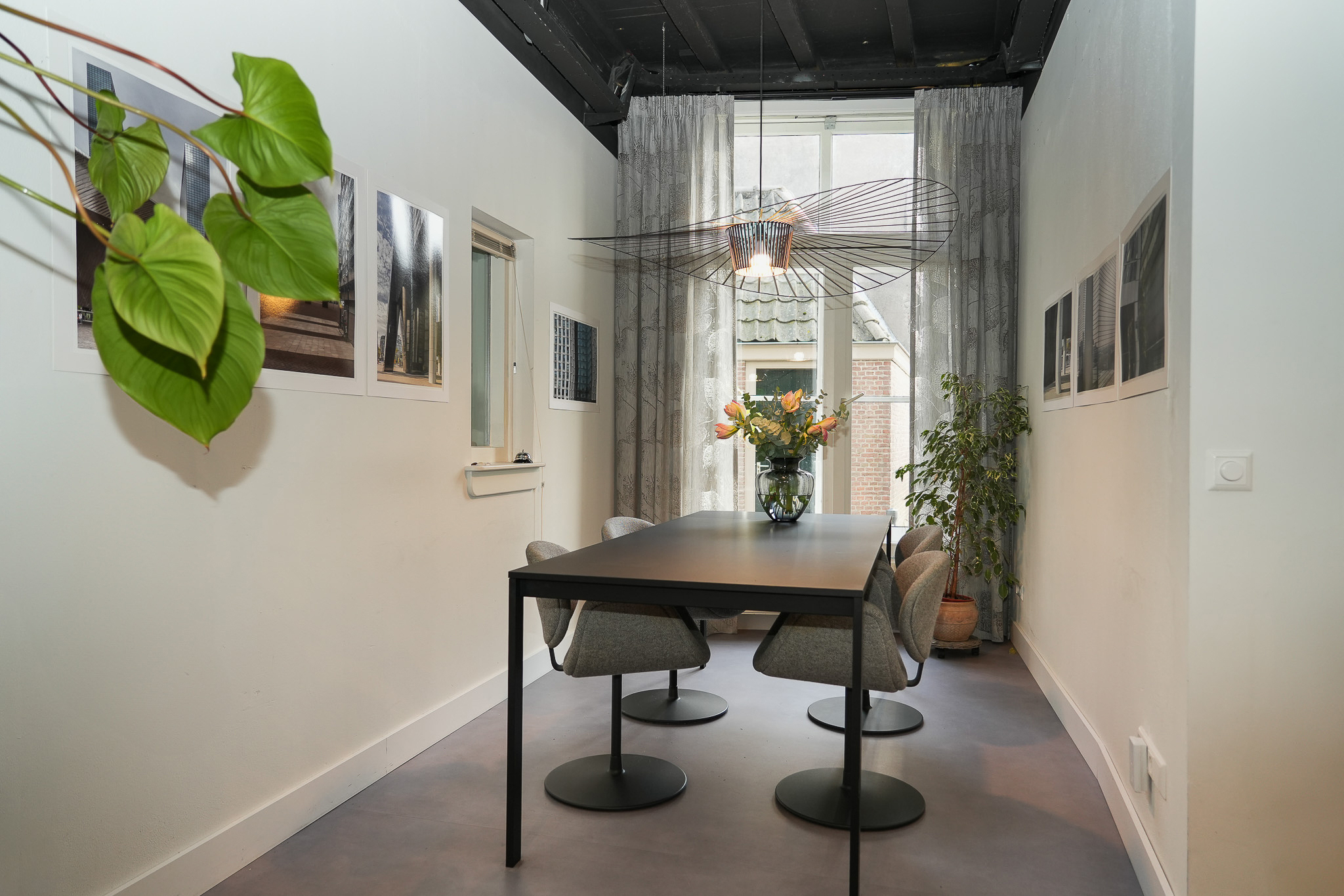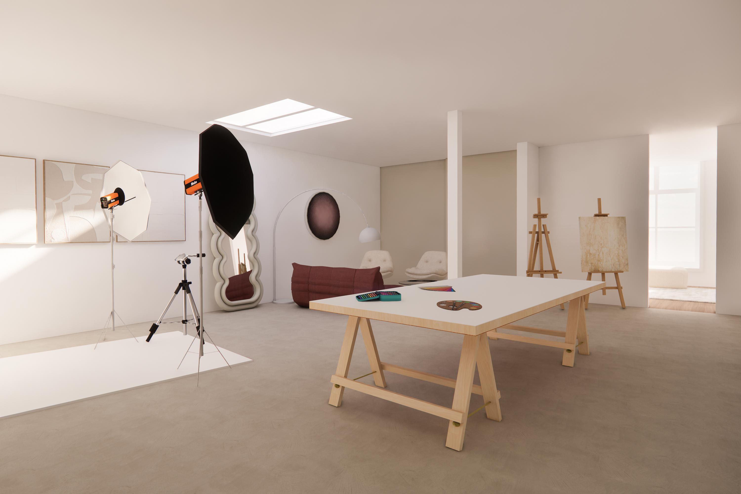 A spacious entrance leads into the kitchen and dining room. The impressive 17th-century beamed ceiling immediately sets the tone, while a high south-facing window floods the space with natural light. The kitchen (2020) features a large island and various built-in appliances and serves as the heart of this true live–work property. Adjoining the kitchen is a multifunctional studio of approx. 65 m², currently used as a photography and music studio.