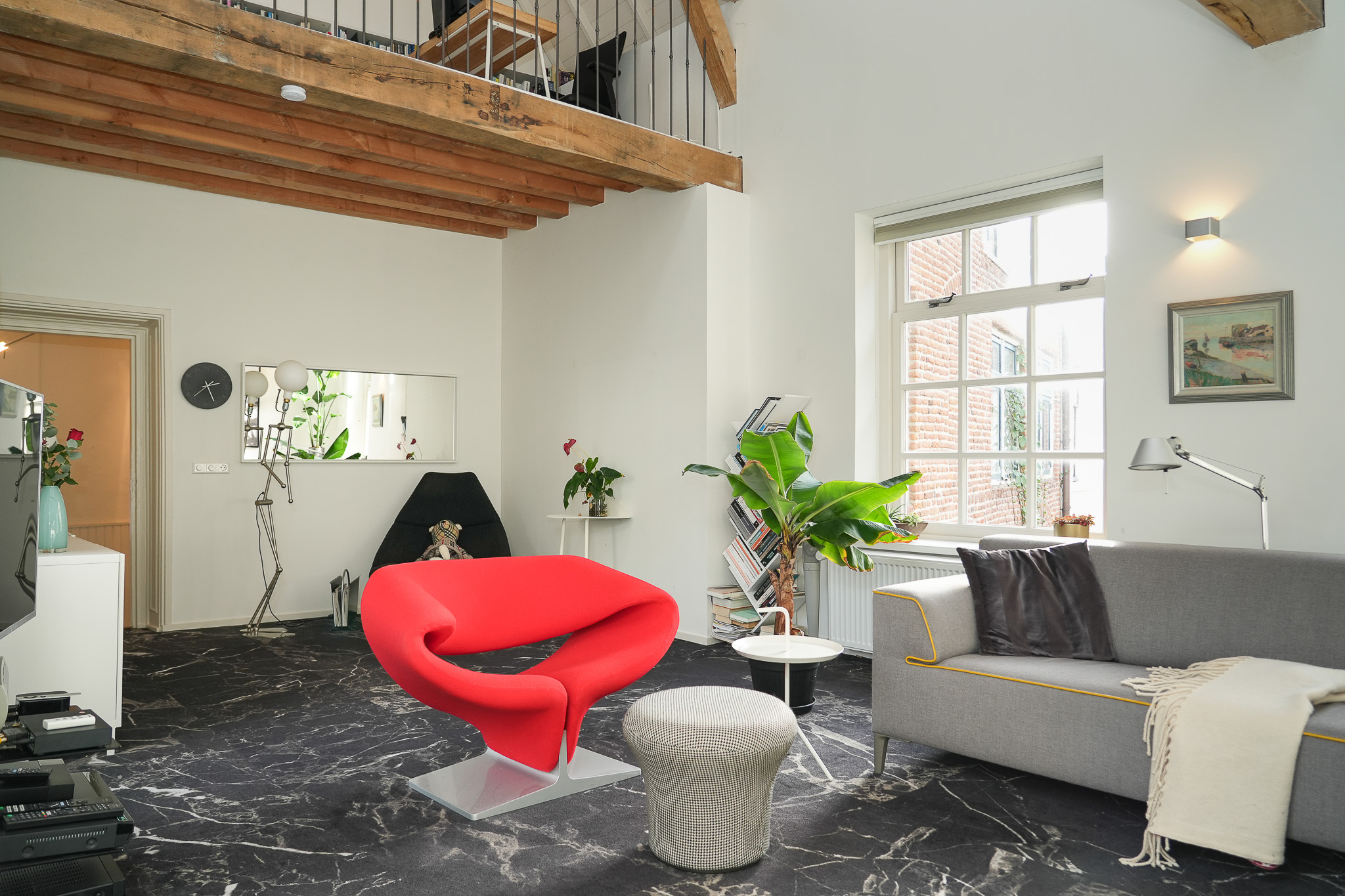 This attic room is ideal as a guest bedroom. Through a characteristic archway, a mezzanine workspace with views of the living room is reached — currently used as a reading room, beautifully lit by a roof window catching the morning sun.
