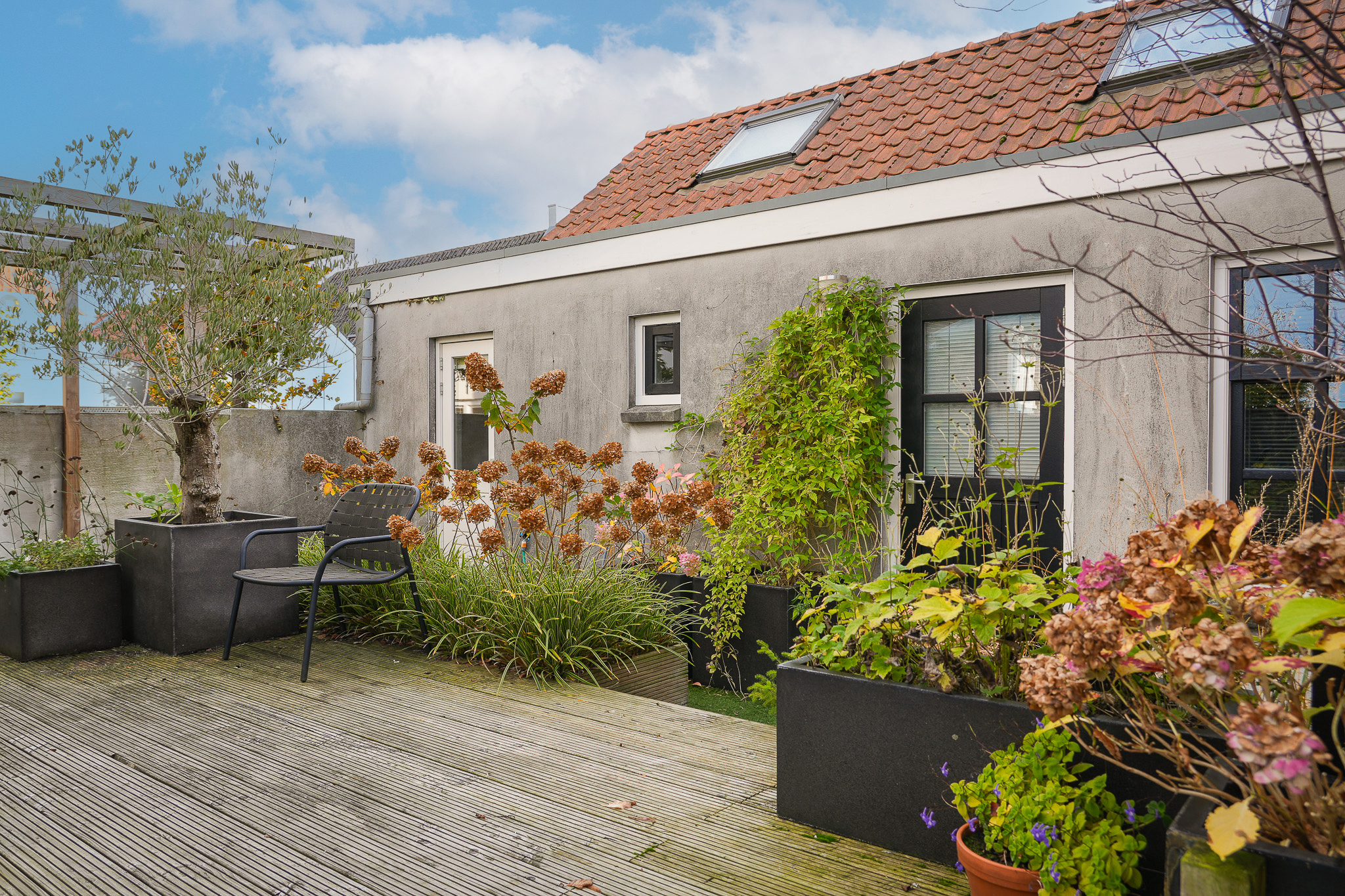The sunny, private roof terrace (45 m²) was designed under the supervision of a landscape architect. It offers a wonderfully relaxed atmosphere, complete with olive trees, a pergola and carefully chosen planting. Thanks to its sheltered position, there is always a comfortable spot to enjoy the sun or start the day with a cappuccino while gazing towards the river.