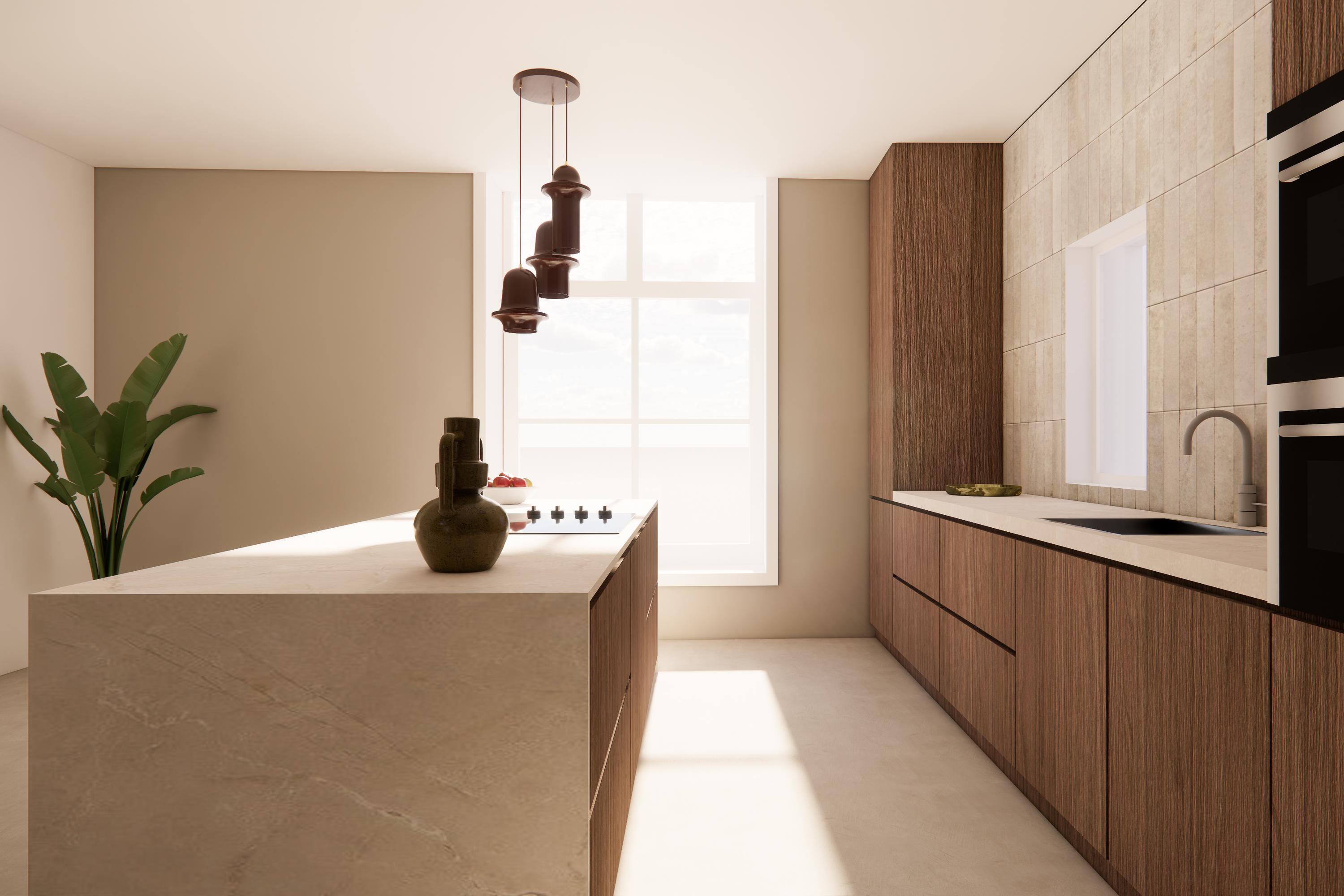 A straight staircase leads to the landing, giving access to a separate WC, compact kitchen, bedroom and bathroom. The kitchen occupies a favourable position directly beside the roof terrace. The bathroom includes a bathtub, walk-in shower and washbasin.