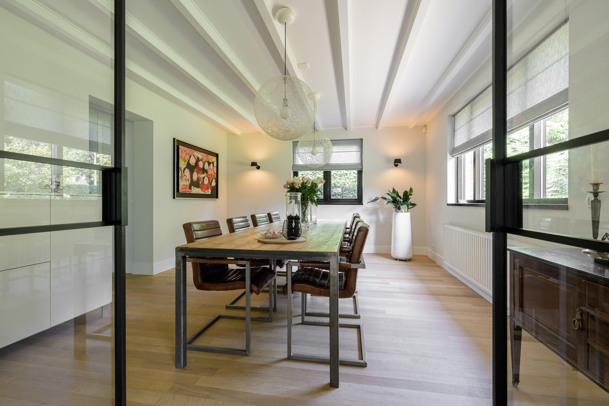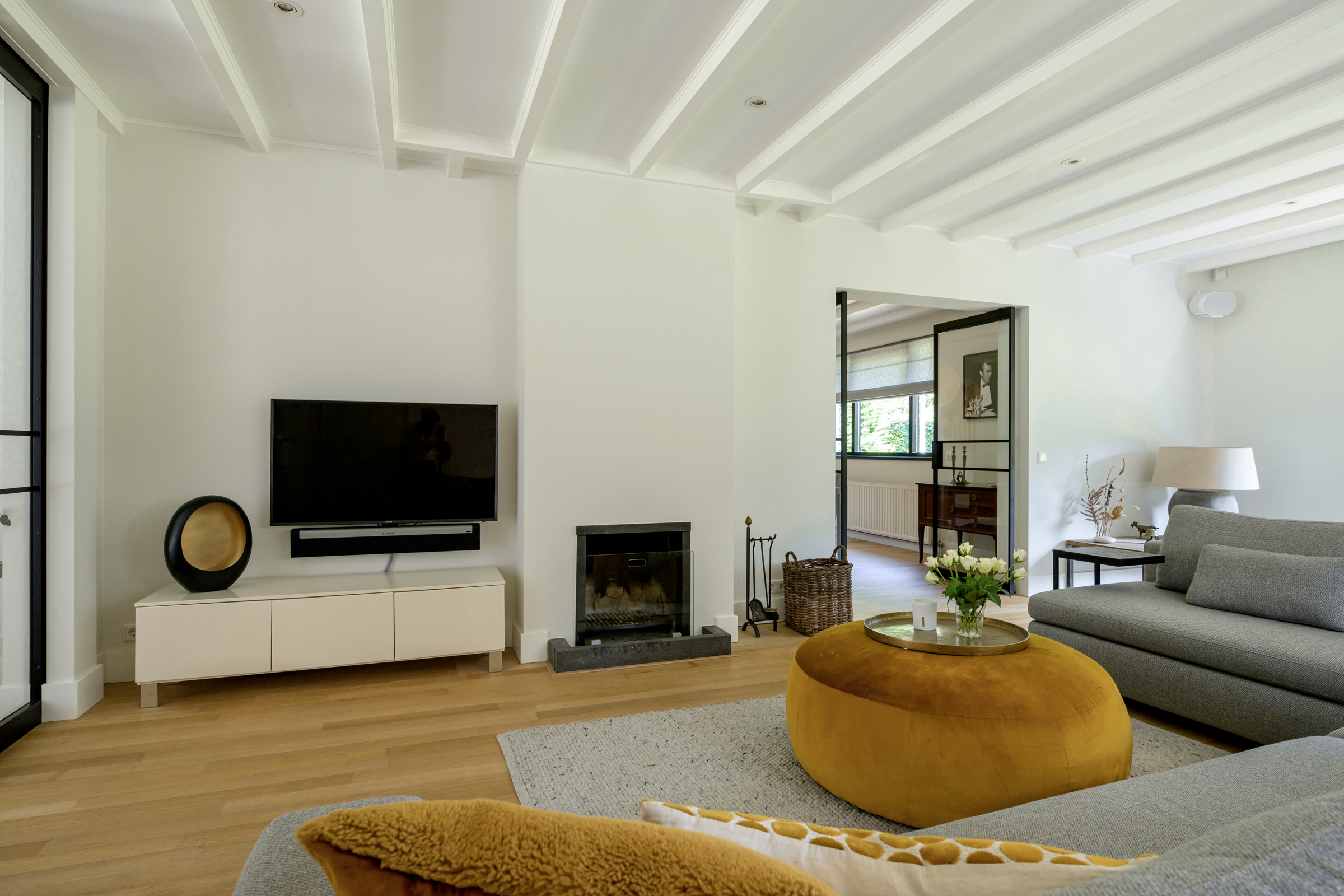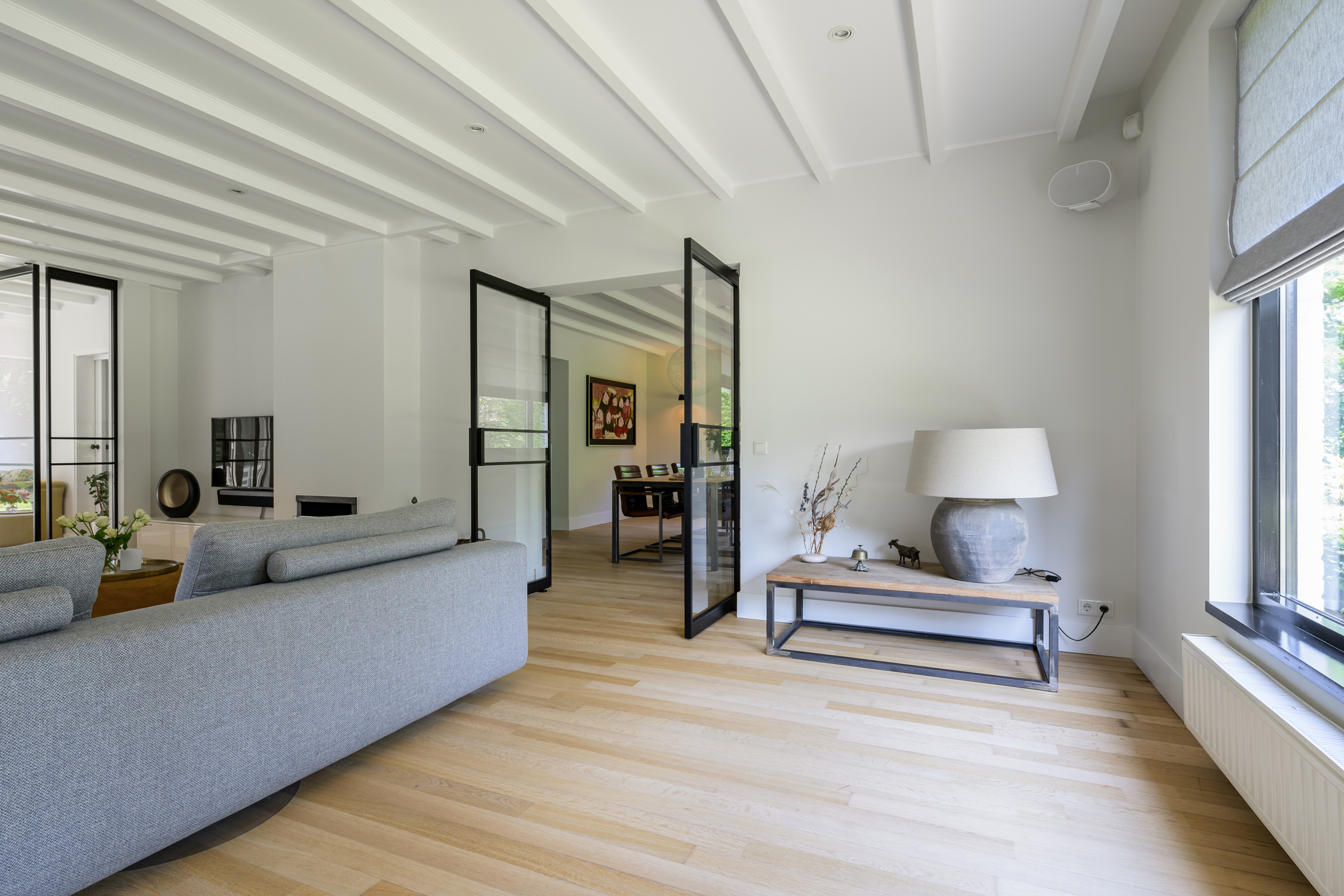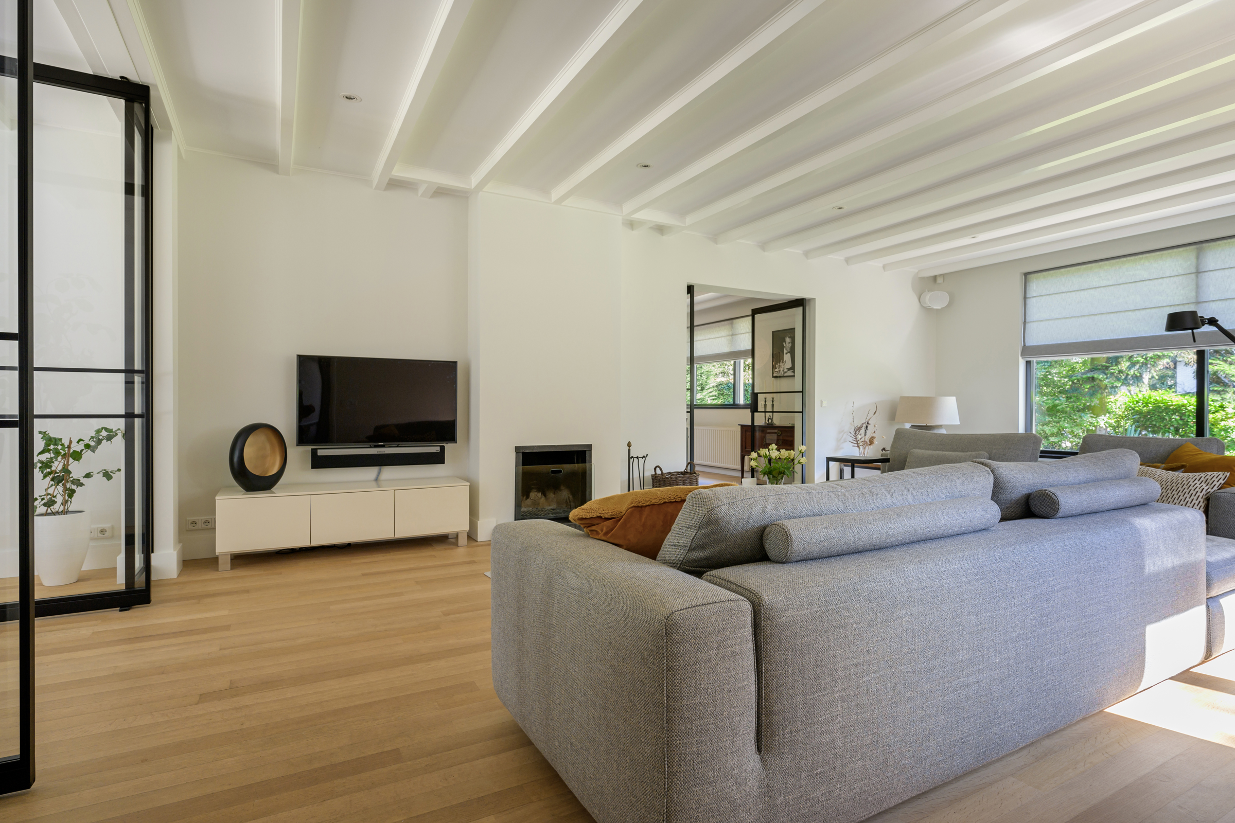 La vivienda integra criterios de sostenibilidad práctica, como aislamiento en suelos y techos, acristalamiento HR++, 18 paneles solares y calefacción moderna, creando así un entorno eficiente y sereno. Grandes baldosas de pizarra, parquet y suelos de madera maciza acentúan el carácter discreto de la casa, mientras las vigas vistas y la iluminación empotrada evocan un ritmo singular. Las zonas de estar fluyen desde un salón con chimenea, atravesando puertas acristaladas hacia el jardín, y se conectan de manera fluida con el comedor independiente y la cocina totalmente equipada con espacio auxiliar.