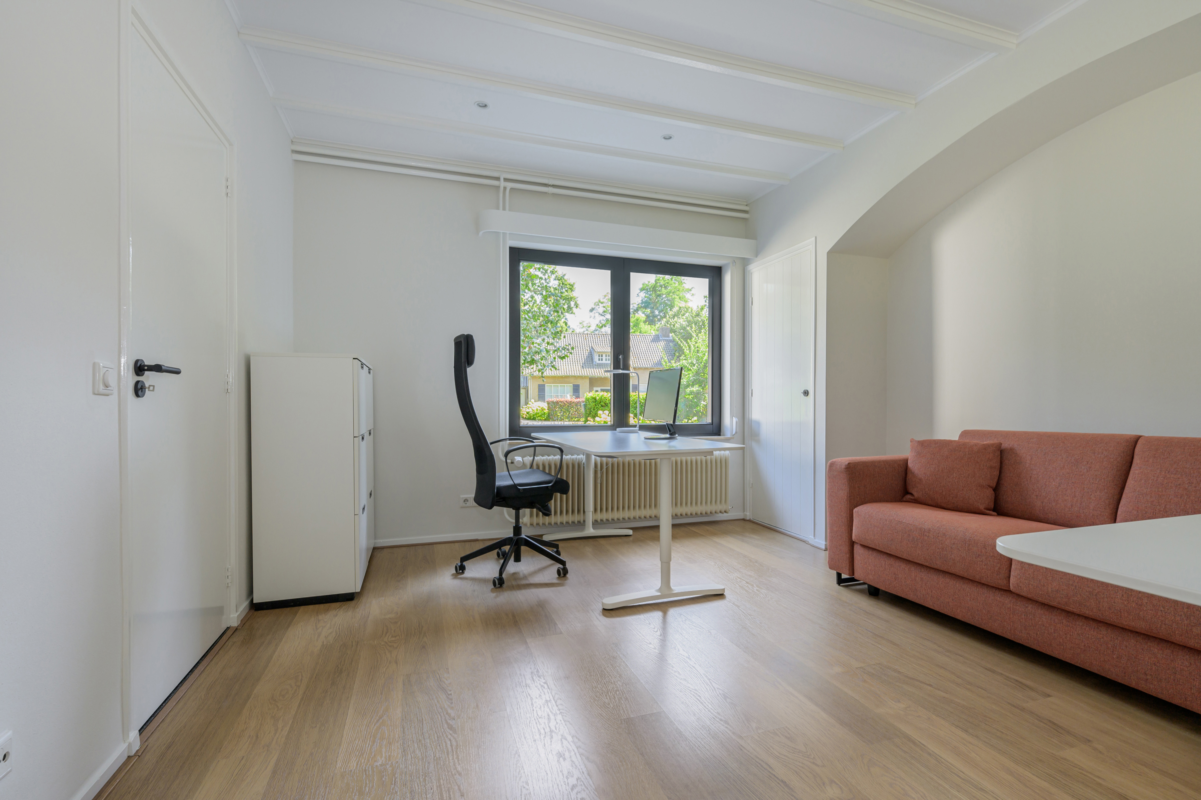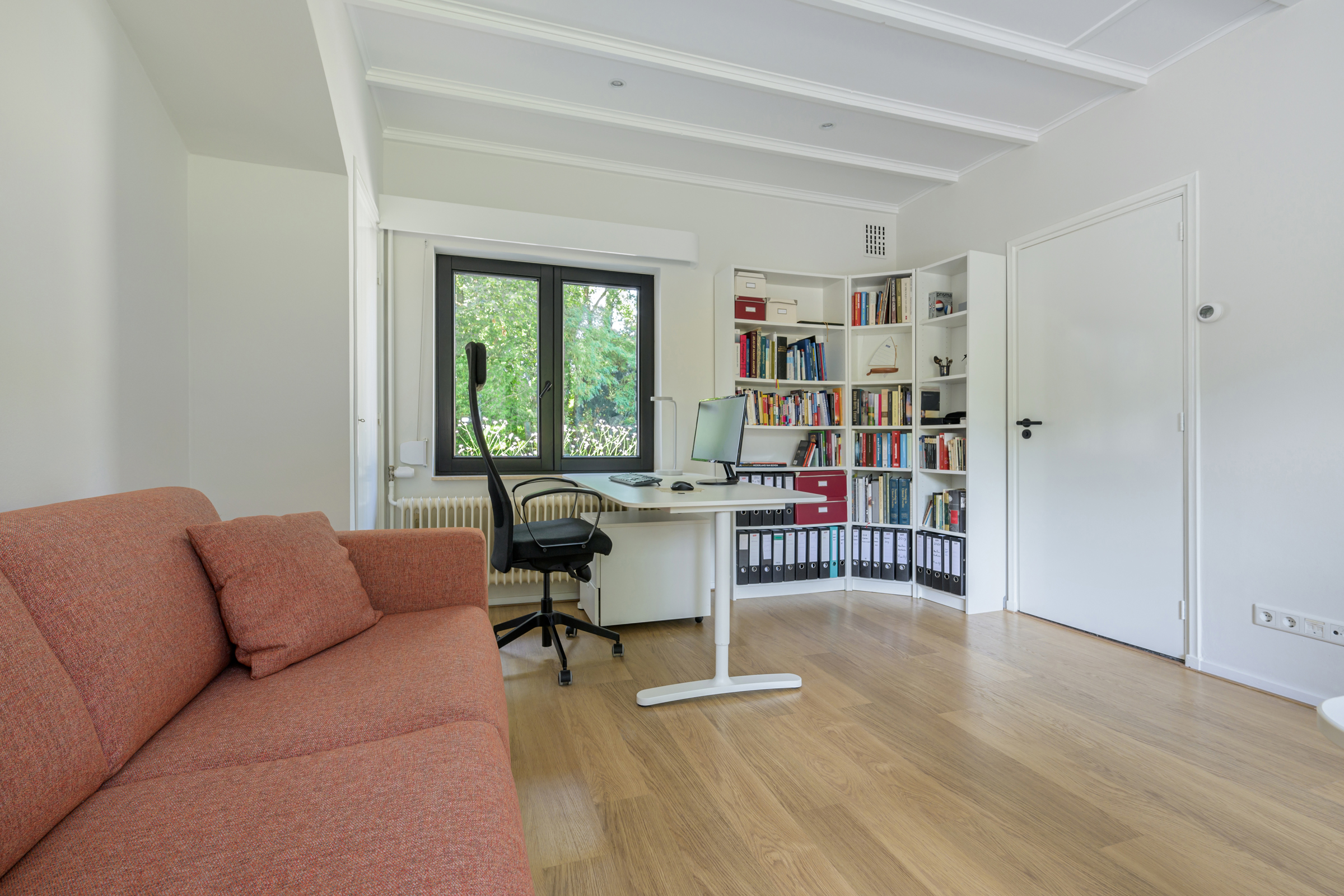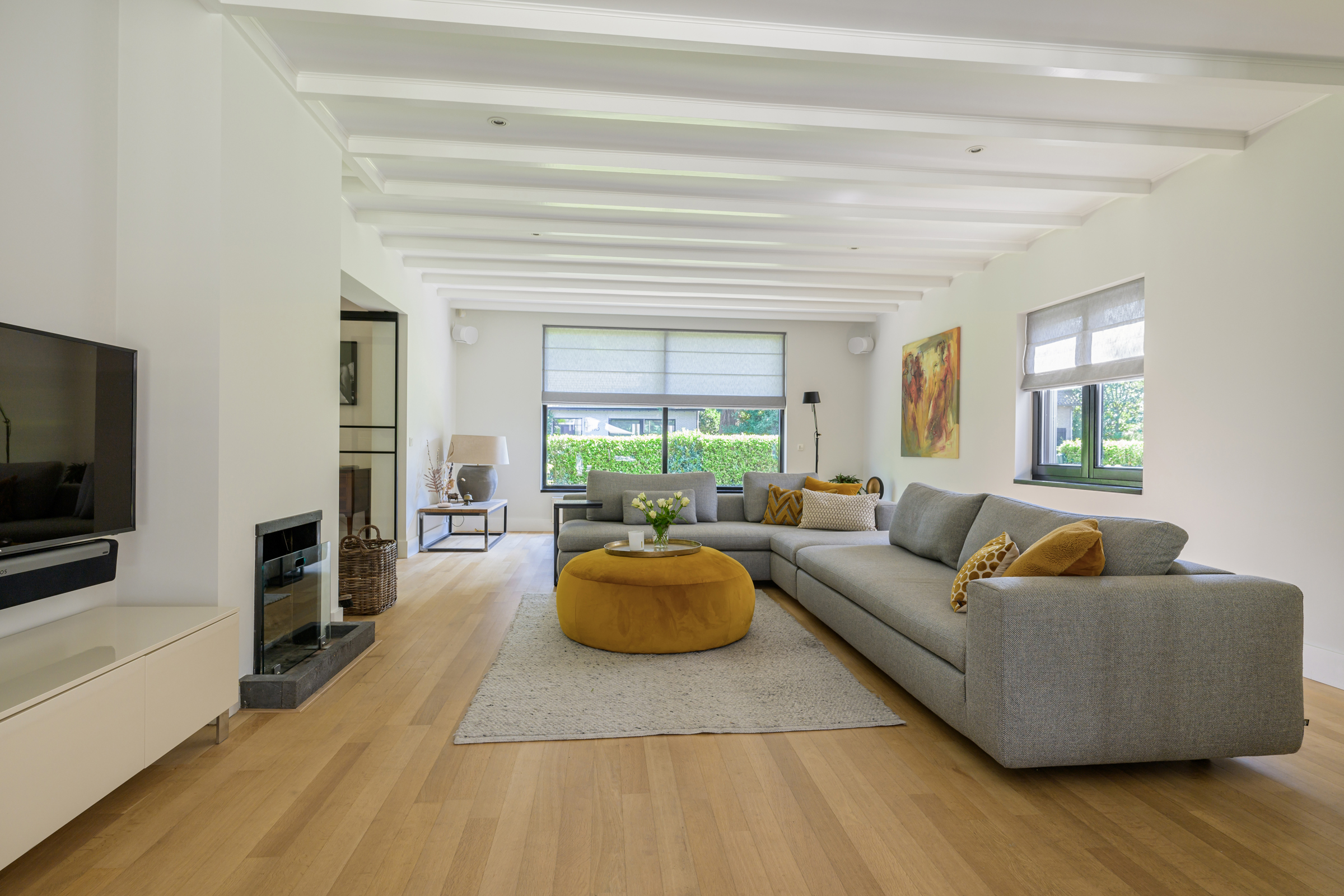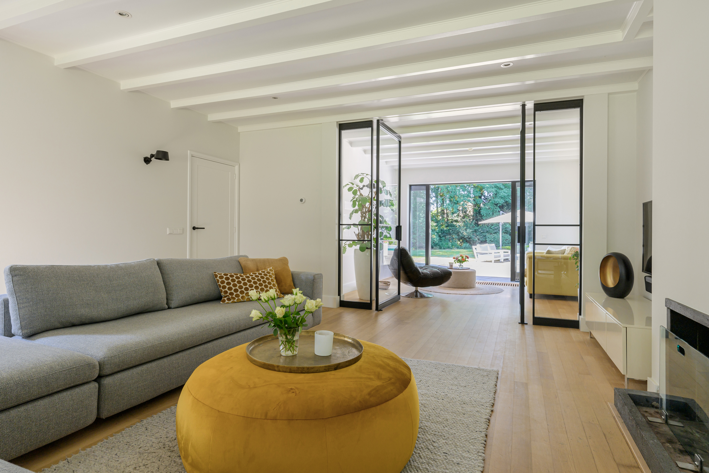 La vivienda integra criterios de sostenibilidad práctica, como aislamiento en suelos y techos, acristalamiento HR++, 18 paneles solares y calefacción moderna, creando así un entorno eficiente y sereno. Grandes baldosas de pizarra, parquet y suelos de madera maciza acentúan el carácter discreto de la casa, mientras las vigas vistas y la iluminación empotrada evocan un ritmo singular. Las zonas de estar fluyen desde un salón con chimenea, atravesando puertas acristaladas hacia el jardín, y se conectan de manera fluida con el comedor independiente y la cocina totalmente equipada con espacio auxiliar.