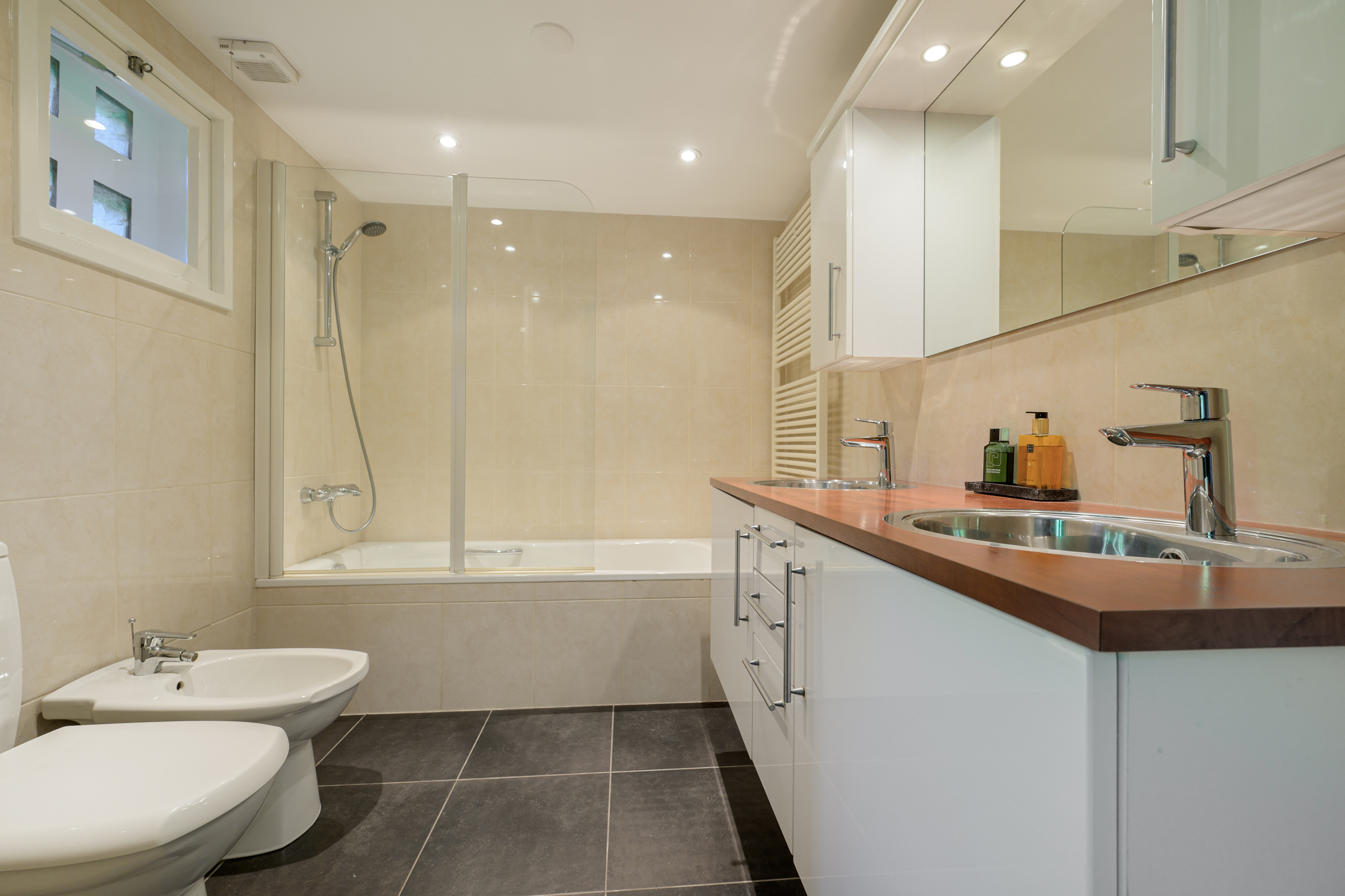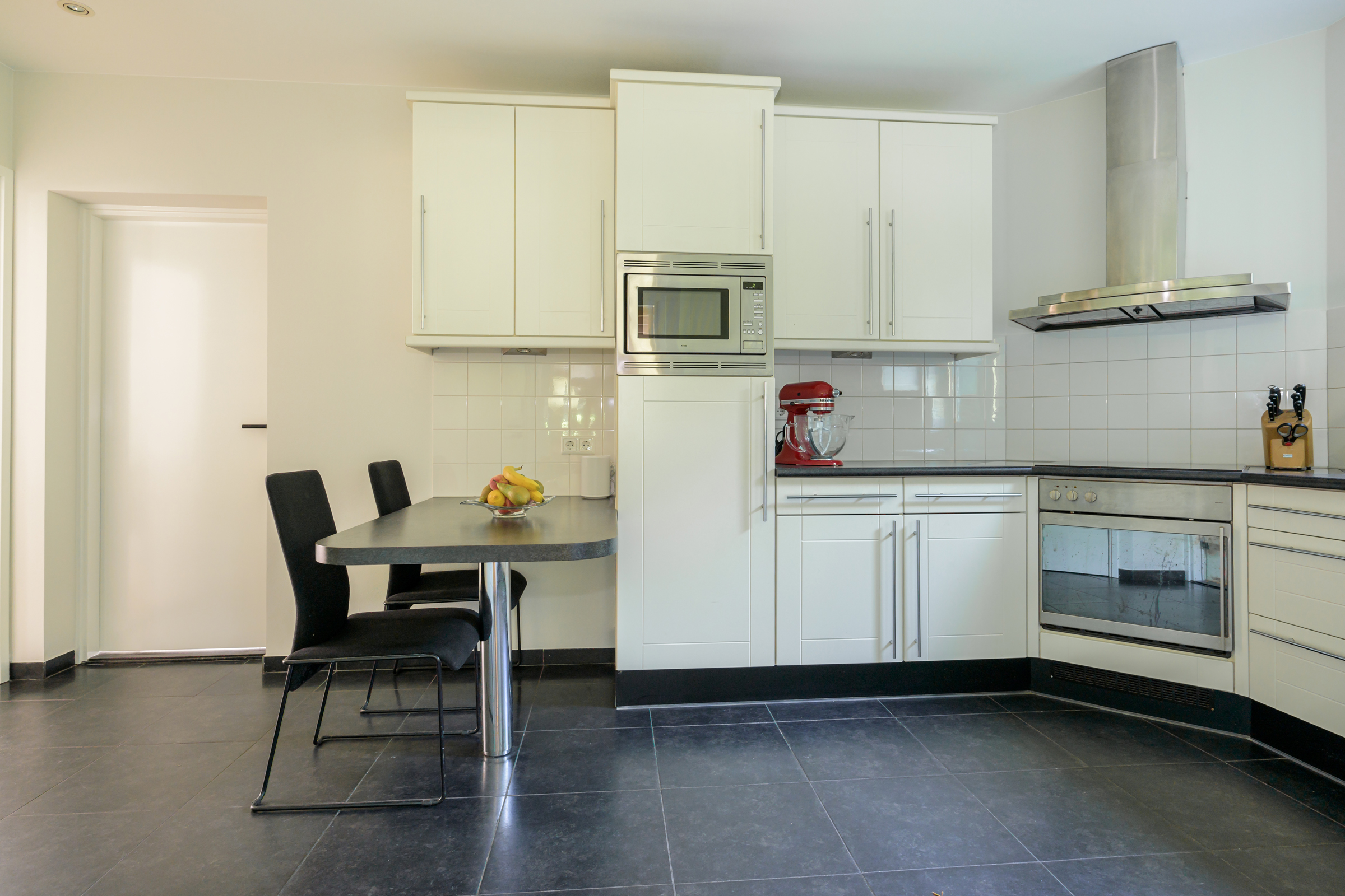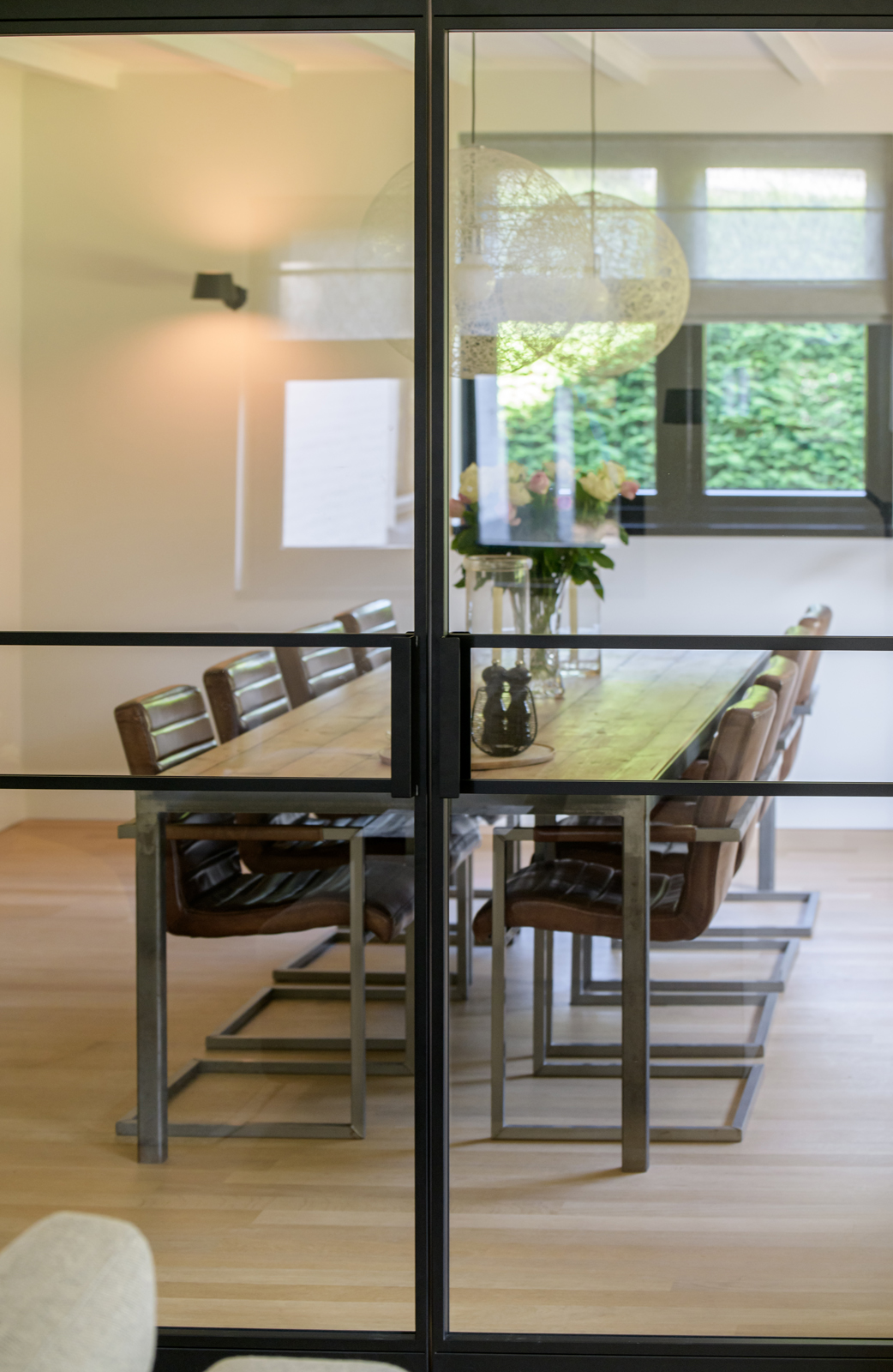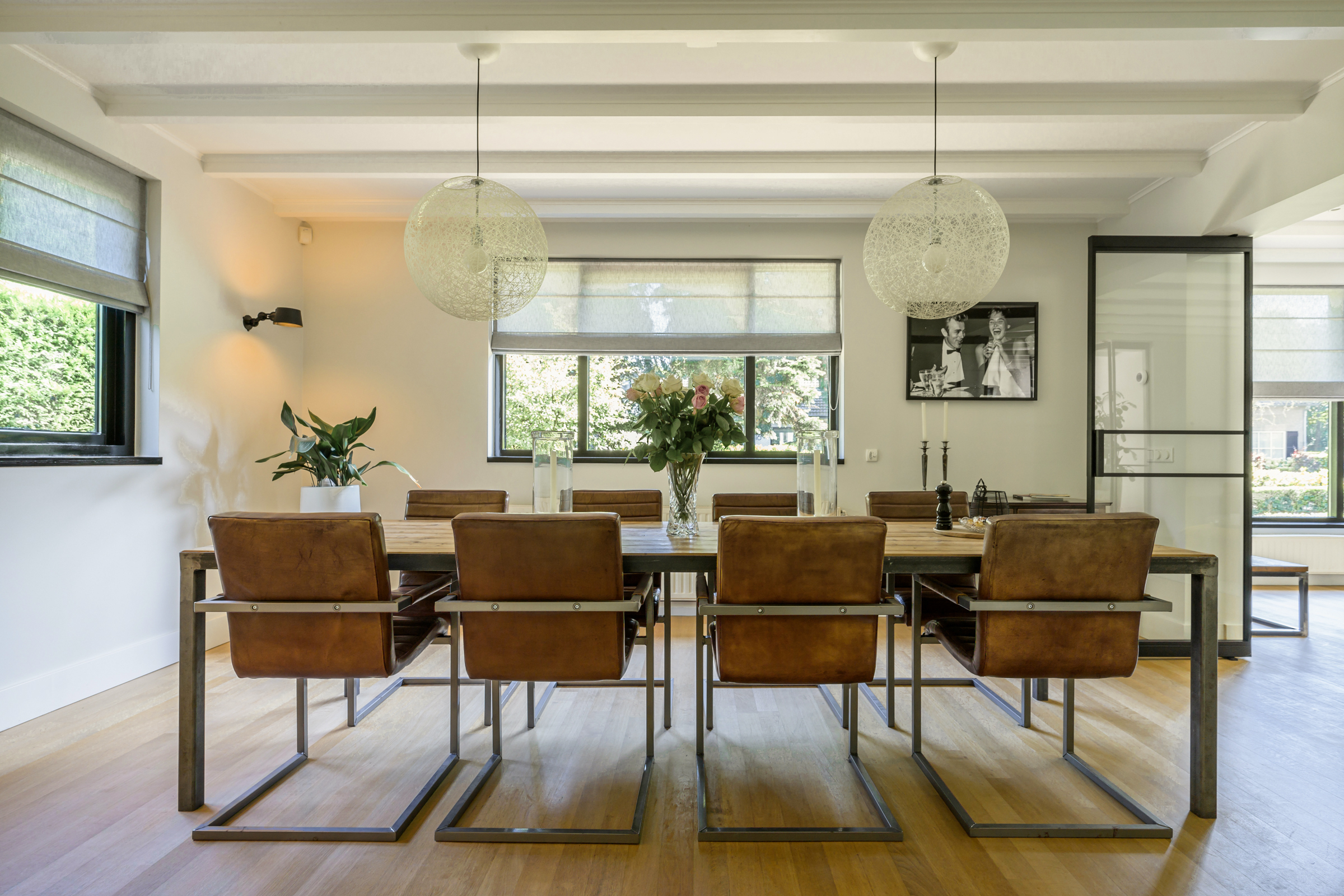 La vivienda integra criterios de sostenibilidad práctica, como aislamiento en suelos y techos, acristalamiento HR++, 18 paneles solares y calefacción moderna, creando así un entorno eficiente y sereno. Grandes baldosas de pizarra, parquet y suelos de madera maciza acentúan el carácter discreto de la casa, mientras las vigas vistas y la iluminación empotrada evocan un ritmo singular. Las zonas de estar fluyen desde un salón con chimenea, atravesando puertas acristaladas hacia el jardín, y se conectan de manera fluida con el comedor independiente y la cocina totalmente equipada con espacio auxiliar.