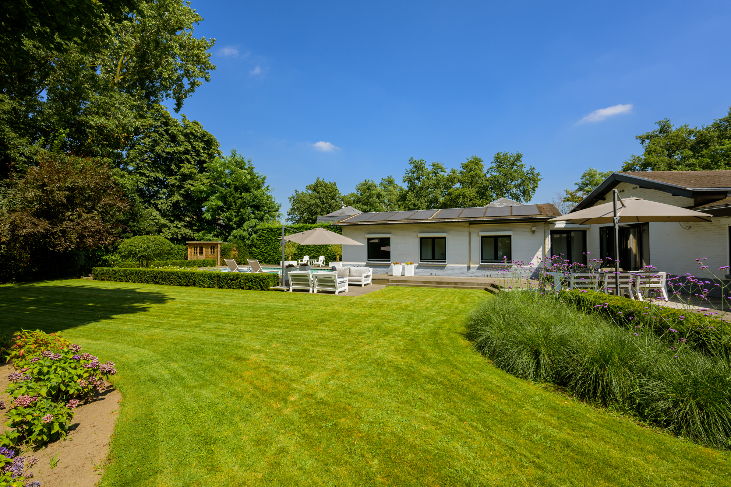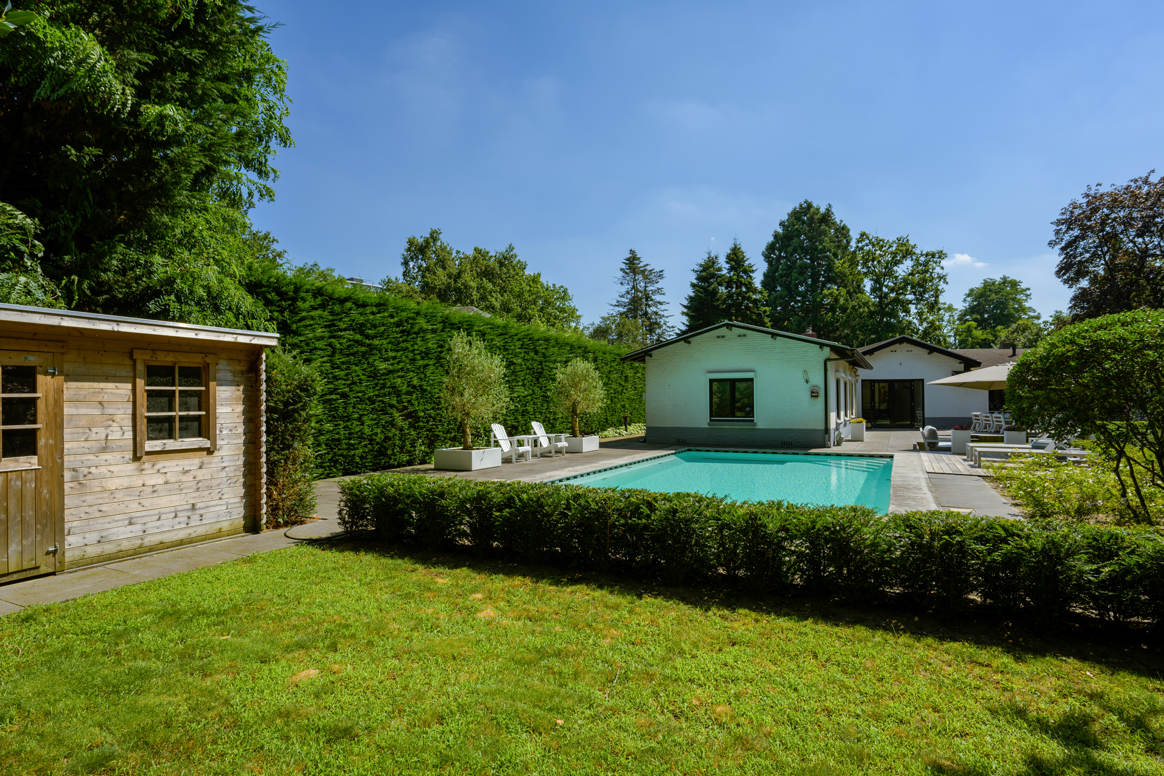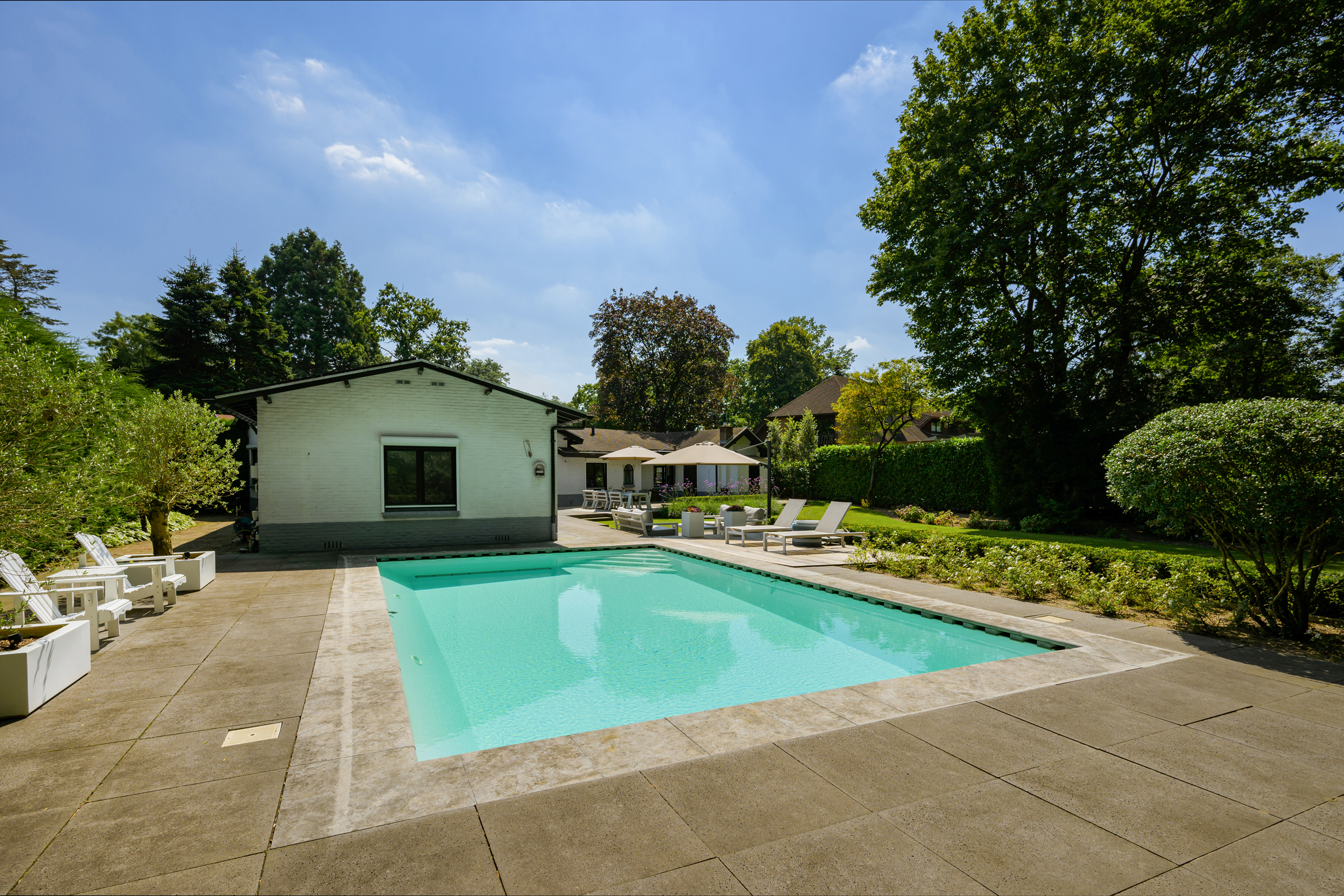 El amplio y ajardinado jardín es un retiro privado con extensos céspedes, varias terrazas, árboles maduros, vegetación variada y una piscina climatizada de 6 x 9,5 metros. Un espacioso garaje, trastero seguro y tecnología discreta como alarma, persianas, climatización de piscina y riego reflejan una atención cuidadosa tanto al confort como a la privacidad.