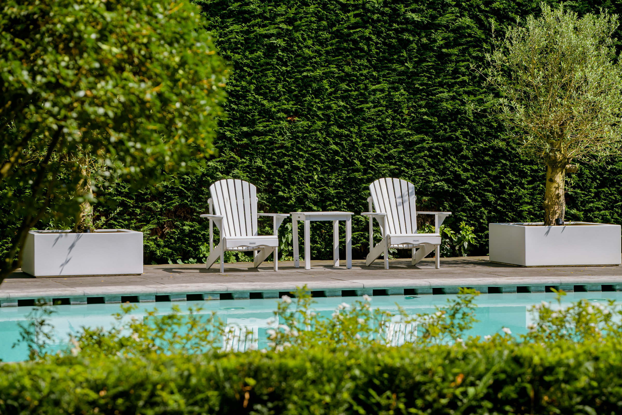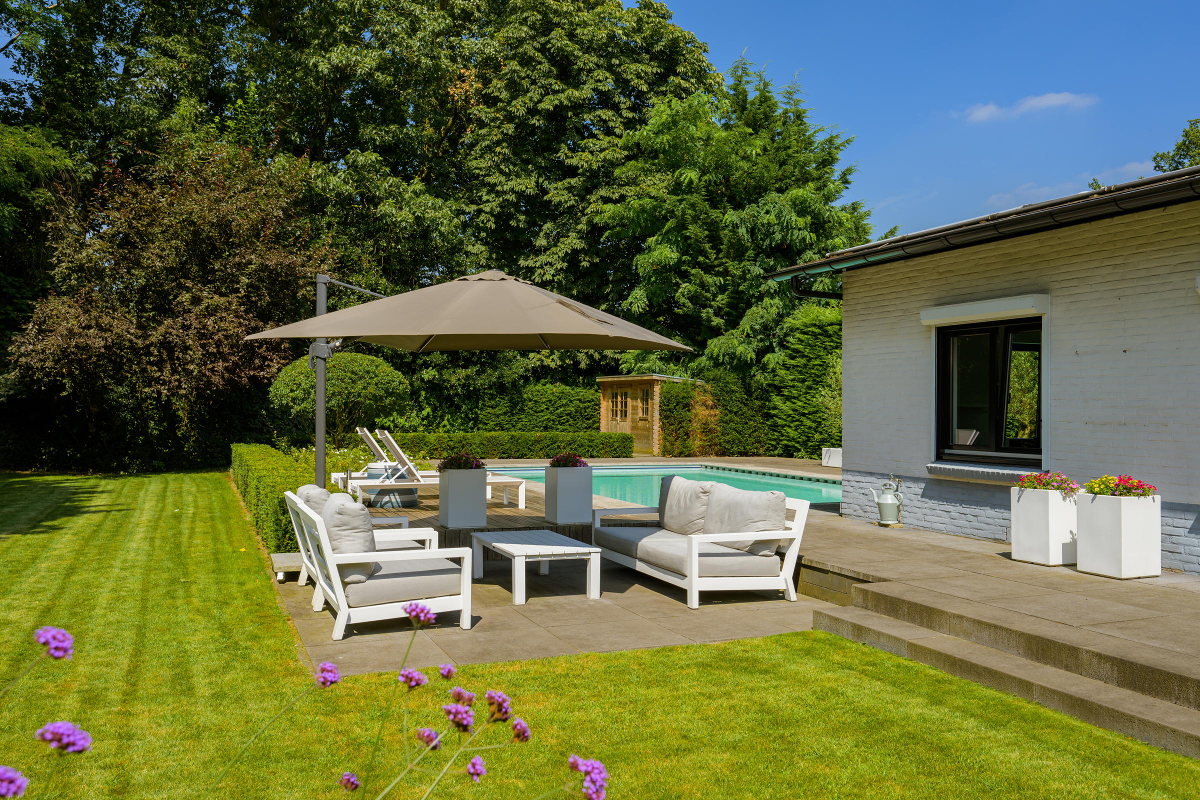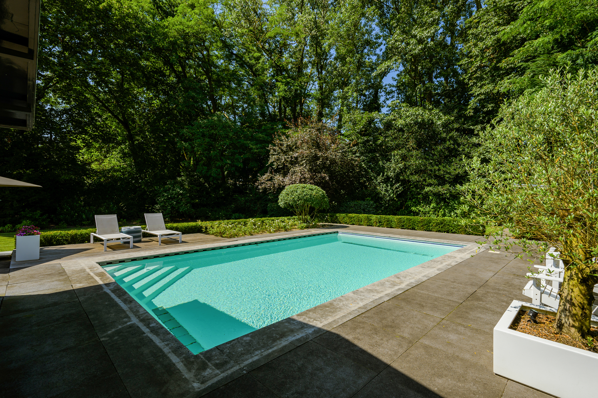 El amplio y ajardinado jardín es un retiro privado con extensos céspedes, varias terrazas, árboles maduros, vegetación variada y una piscina climatizada de 6 x 9,5 metros. Un espacioso garaje, trastero seguro y tecnología discreta como alarma, persianas, climatización de piscina y riego reflejan una atención cuidadosa tanto al confort como a la privacidad.
