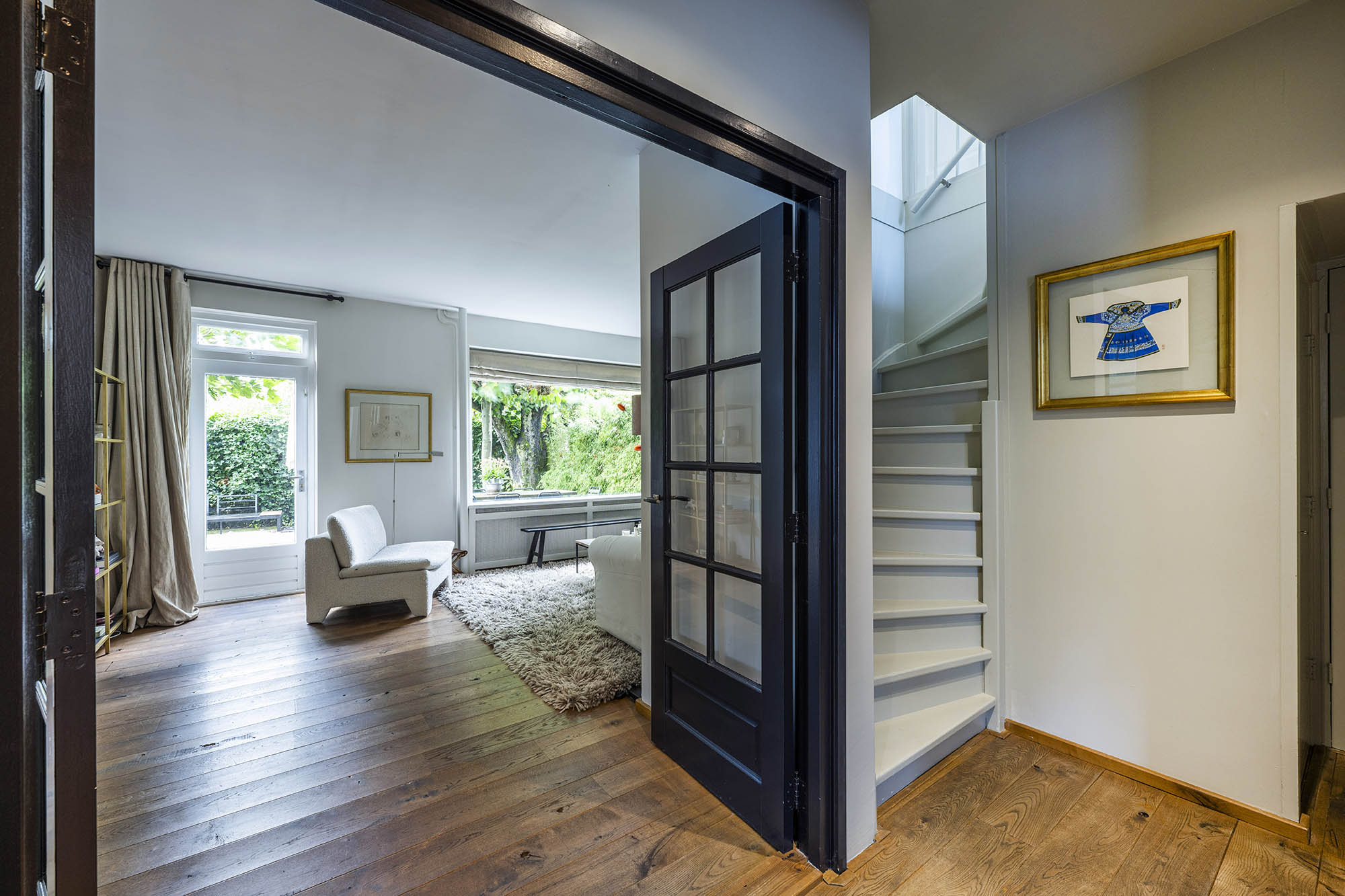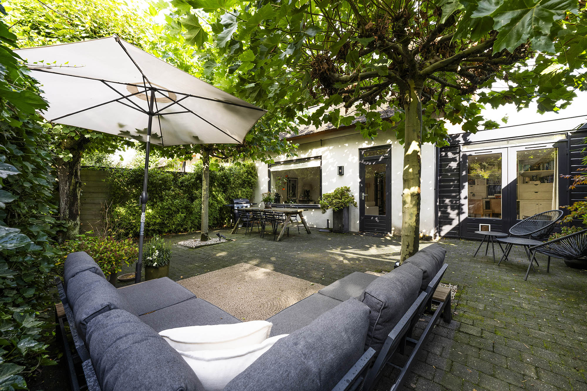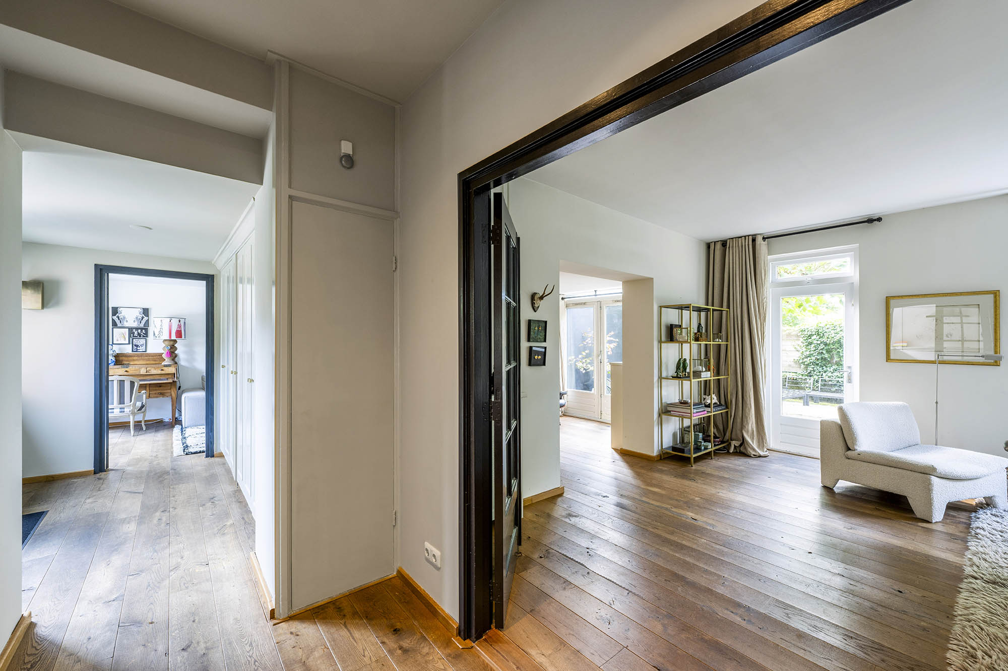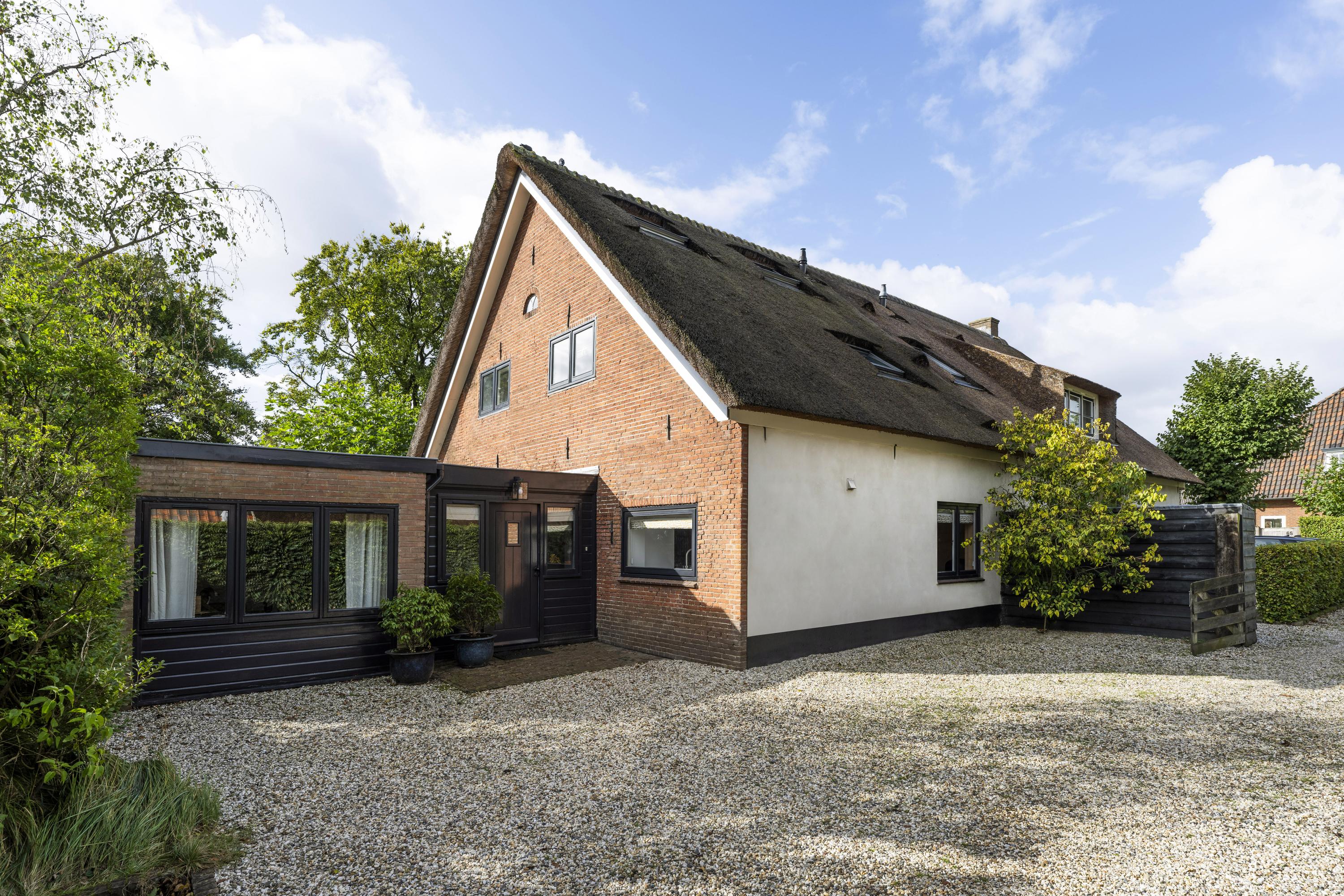La vivienda familiar en Laren se encuentra discretamente situada detrás de la fachada de una casa de campo con tejado de paja, revelándose solo a través de un modesto sendero de grava. Este entorno apartado ofrece un equilibrio entre privacidad y comodidad, con amplio aparcamiento en la propiedad y acceso inmediato al centro del pueblo. Desde el primer paso al interior, se percibe una sensación de amplitud poco habitual en una ubicación como esta. El salón, que abarca todo el ancho de la casa, se inunda de luz natural gracias a las puertas francesas, generando una conexión armoniosa con el soleado jardín sombreado por plátanos maduros. Una chimenea define el ambiente, mientras que un rincón destinado al trabajo potencia tanto la funcionalidad como la comodidad. La moderna y bien equipada cocina con comedor y la sala de televisión independiente facilitan la vida diaria con total comodidad. En la planta superior, tres dormitorios están cuidadosamente distribuidos, incluyendo una habitación adaptada como lavandería, junto a un baño elegante con bañera, lavabo y aseo. Una escalera fija conduce a la planta superior, donde la suite principal dispone de armarios a medida y baño privado, constituyendo un refugio exclusivo. La flexibilidad es el pilar de esta propiedad: su amplio diseño permite opciones de dormitorio en la planta baja, haciéndola apta para todas las generaciones. La casa cuenta con 157 m² de superficie habitable en una parcela de 310 m², ventilación natural, aislamiento en tejado y suelos, acristalamiento doble parcial y confort con certificación energética clase C. Todas las comodidades del pueblo están a su alcance, mientras que los bosques y el campo abierto están a un corto paseo en bicicleta. Para quienes buscan una residencia versátil y acogedora en el corazón de Laren, este hogar familiar ofrece discreción y lujo sosegado.