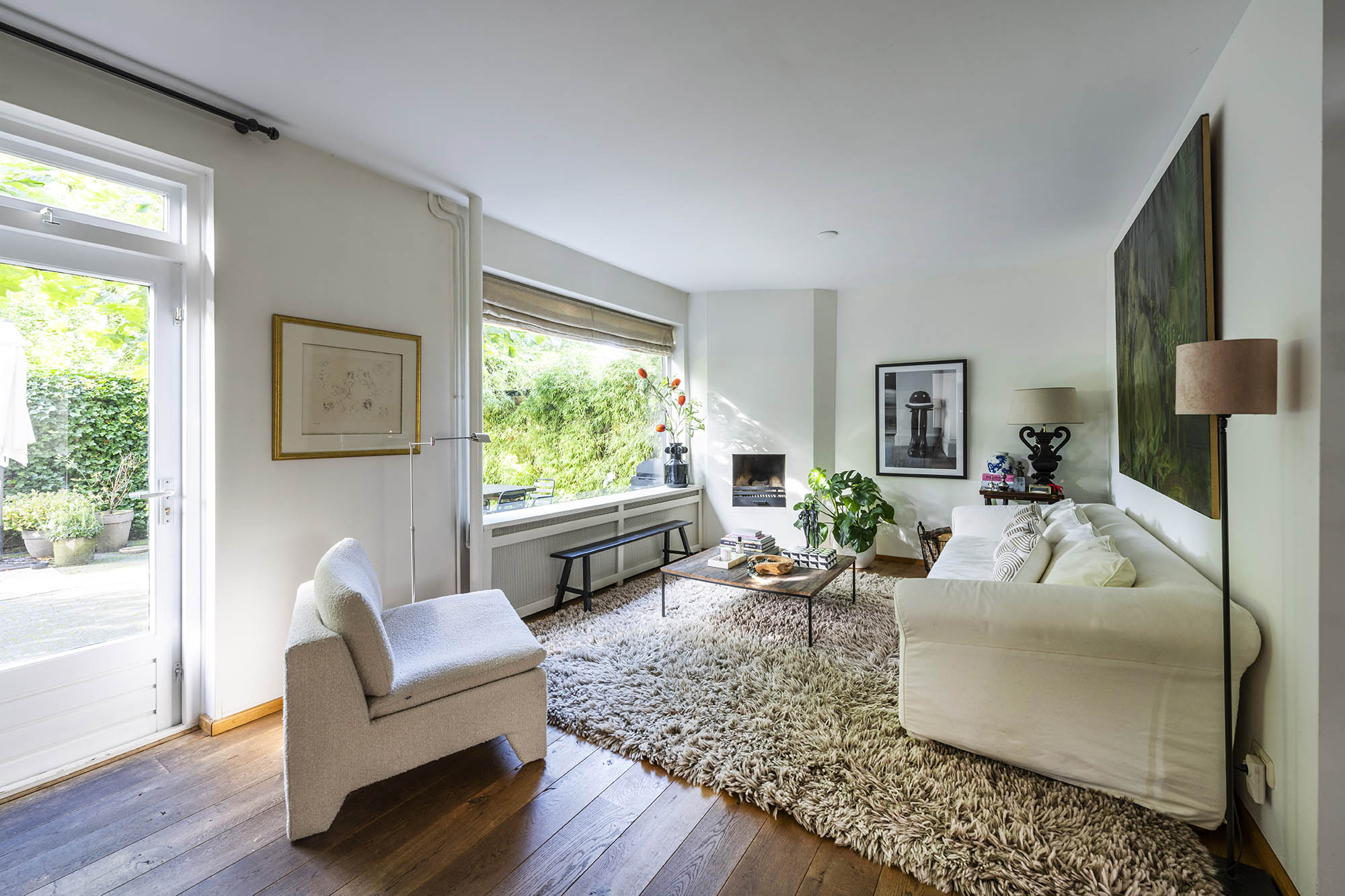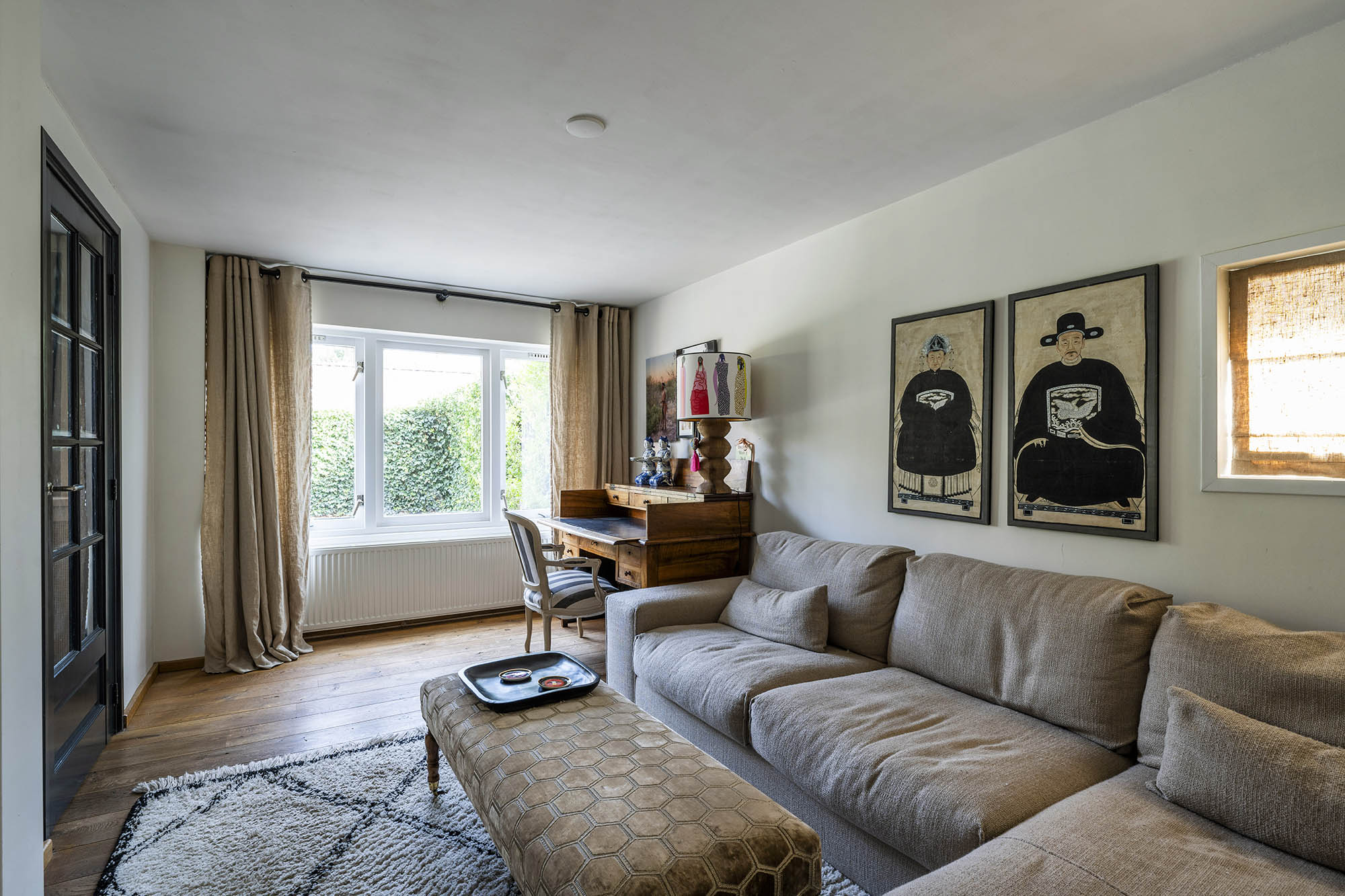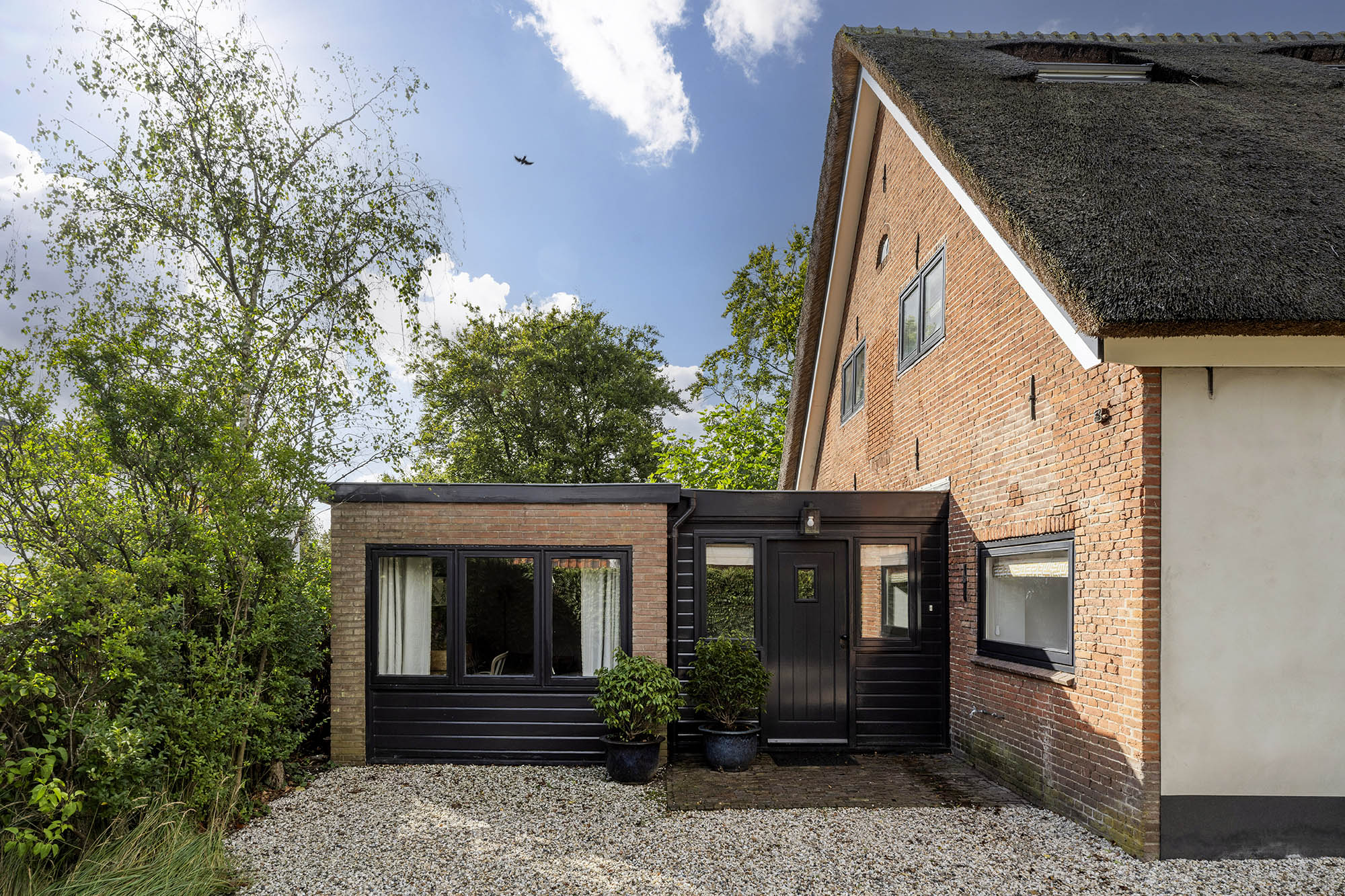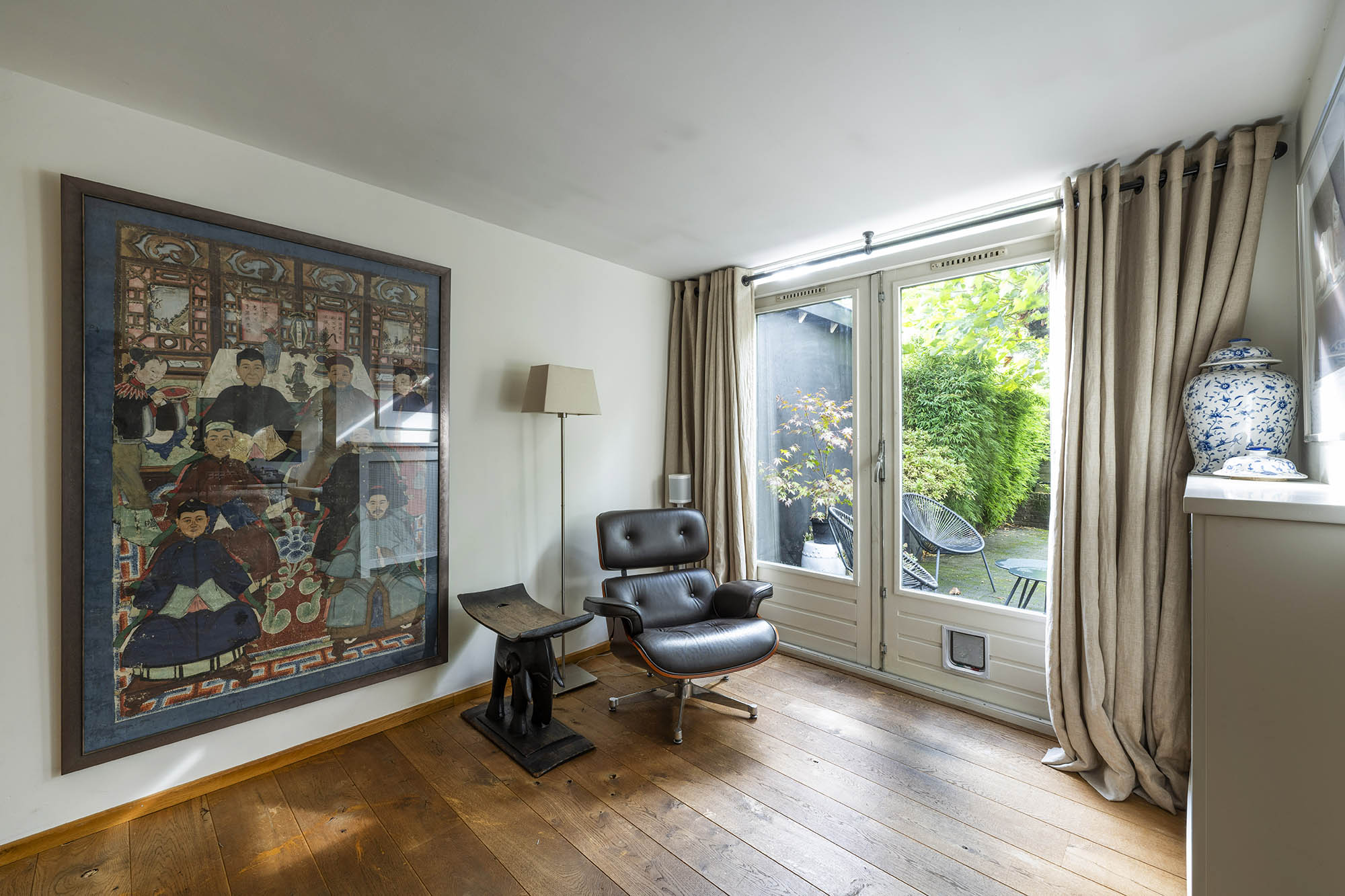 La vivienda familiar en Laren se encuentra discretamente situada detrás de la fachada de una casa de campo con tejado de paja, revelándose solo a través de un modesto sendero de grava. Este entorno apartado ofrece un equilibrio entre privacidad y comodidad, con amplio aparcamiento en la propiedad y acceso inmediato al centro del pueblo. Desde el primer paso al interior, se percibe una sensación de amplitud poco habitual en una ubicación como esta. El salón, que abarca todo el ancho de la casa, se inunda de luz natural gracias a las puertas francesas, generando una conexión armoniosa con el soleado jardín sombreado por plátanos maduros. Una chimenea define el ambiente, mientras que un rincón destinado al trabajo potencia tanto la funcionalidad como la comodidad. La moderna y bien equipada cocina con comedor y la sala de televisión independiente facilitan la vida diaria con total comodidad. En la planta superior, tres dormitorios están cuidadosamente distribuidos, incluyendo una habitación adaptada como lavandería, junto a un baño elegante con bañera, lavabo y aseo. Una escalera fija conduce a la planta superior, donde la suite principal dispone de armarios a medida y baño privado, constituyendo un refugio exclusivo. La flexibilidad es el pilar de esta propiedad: su amplio diseño permite opciones de dormitorio en la planta baja, haciéndola apta para todas las generaciones. La casa cuenta con 157 m² de superficie habitable en una parcela de 310 m², ventilación natural, aislamiento en tejado y suelos, acristalamiento doble parcial y confort con certificación energética clase C. Todas las comodidades del pueblo están a su alcance, mientras que los bosques y el campo abierto están a un corto paseo en bicicleta. Para quienes buscan una residencia versátil y acogedora en el corazón de Laren, este hogar familiar ofrece discreción y lujo sosegado.