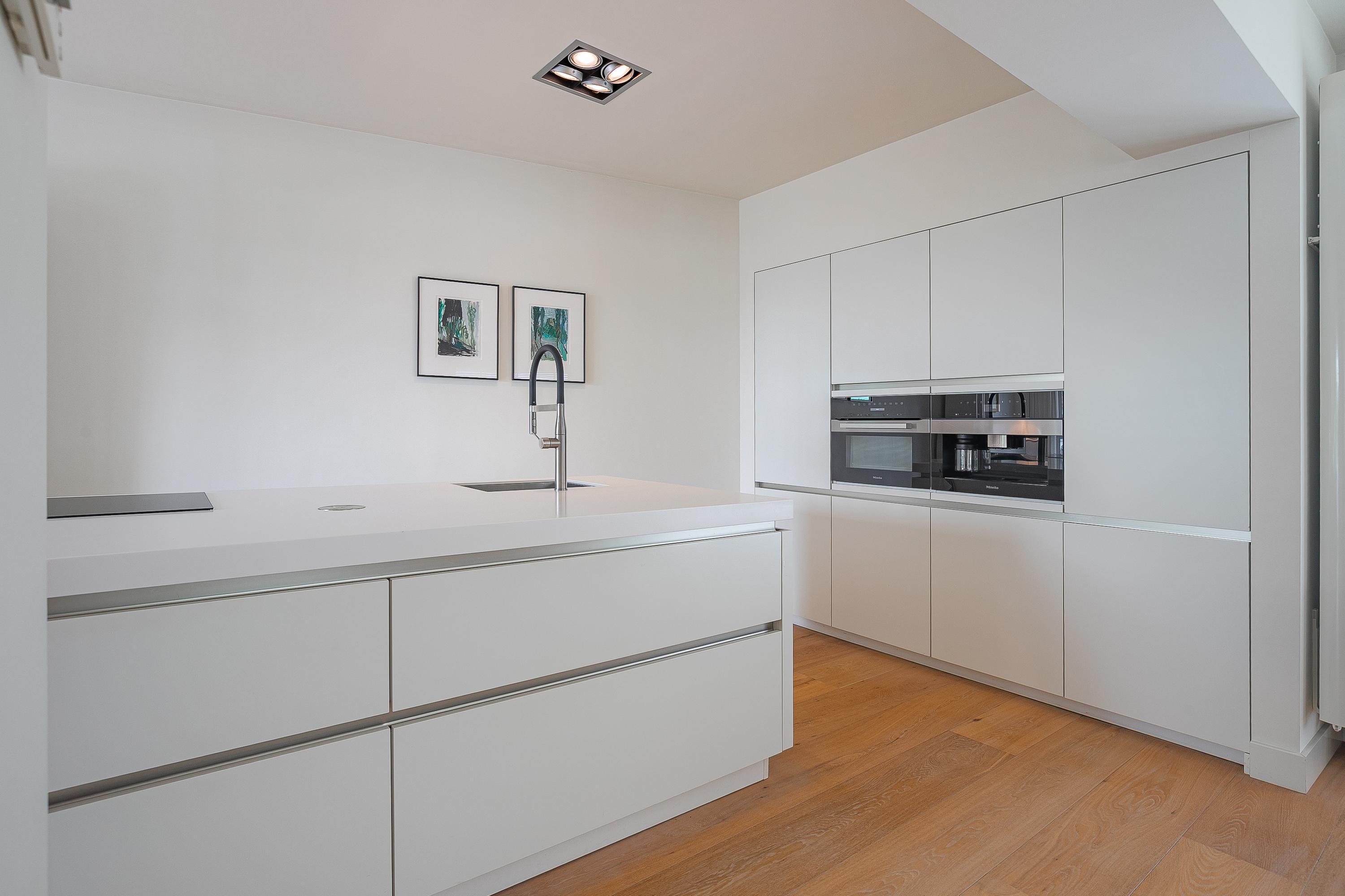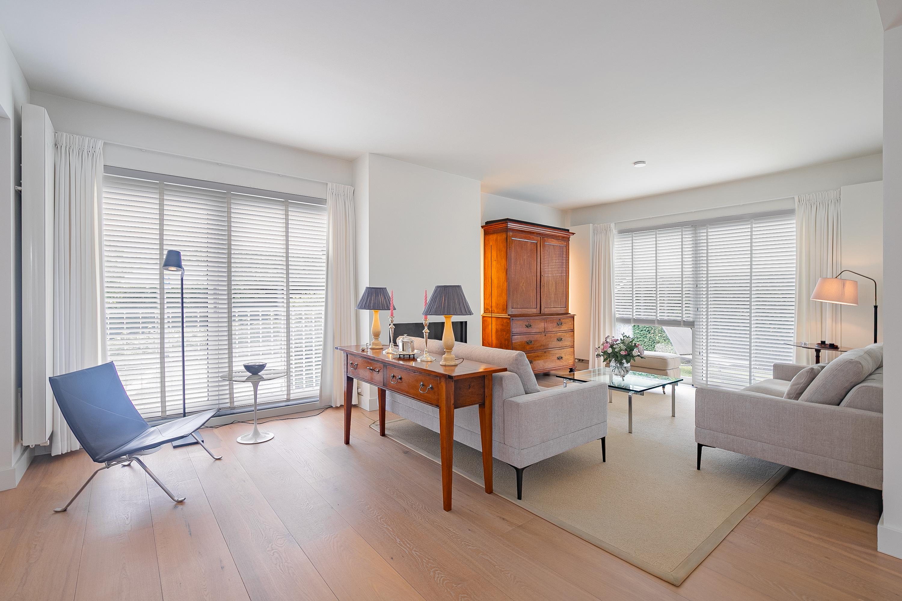 La planta baja de concepto abierto gira en torno a una amplia zona de estar de aproximadamente 68 m², distinguida por su suelo de parquet de roble, una chimenea de gas Faber a medida y radiadores de diseño. La cocina sin tiradores cuenta con placa de inducción de cinco zonas, horno de convección, cafetera integrada y puertas correderas hacia el jardín, invitando a un ritmo diario sin esfuerzo y a la recepción de invitados. El salón se conecta con un jardín urbano protegido orientado al noreste y un frondoso patio delantero que recibe el sol de la tarde.