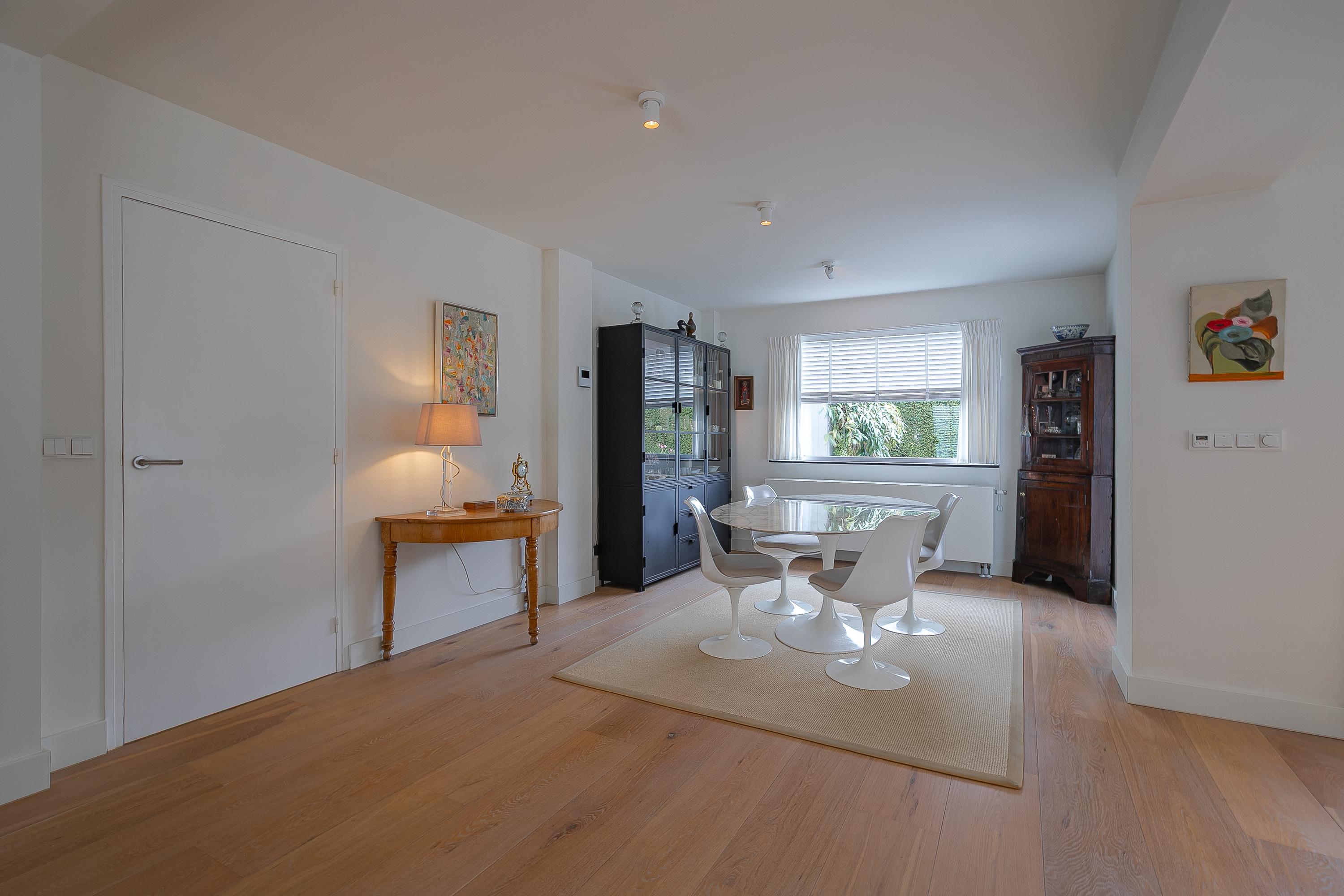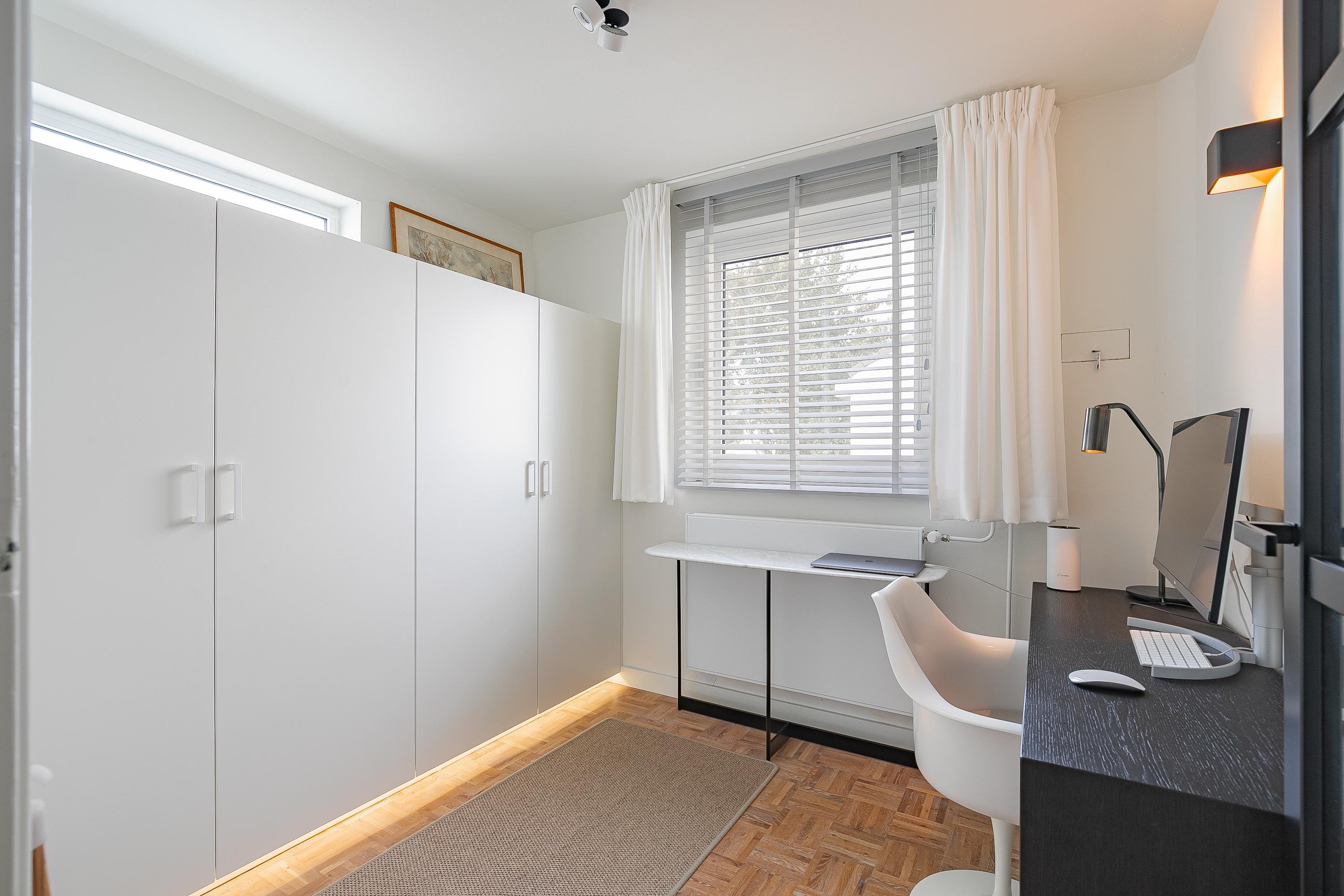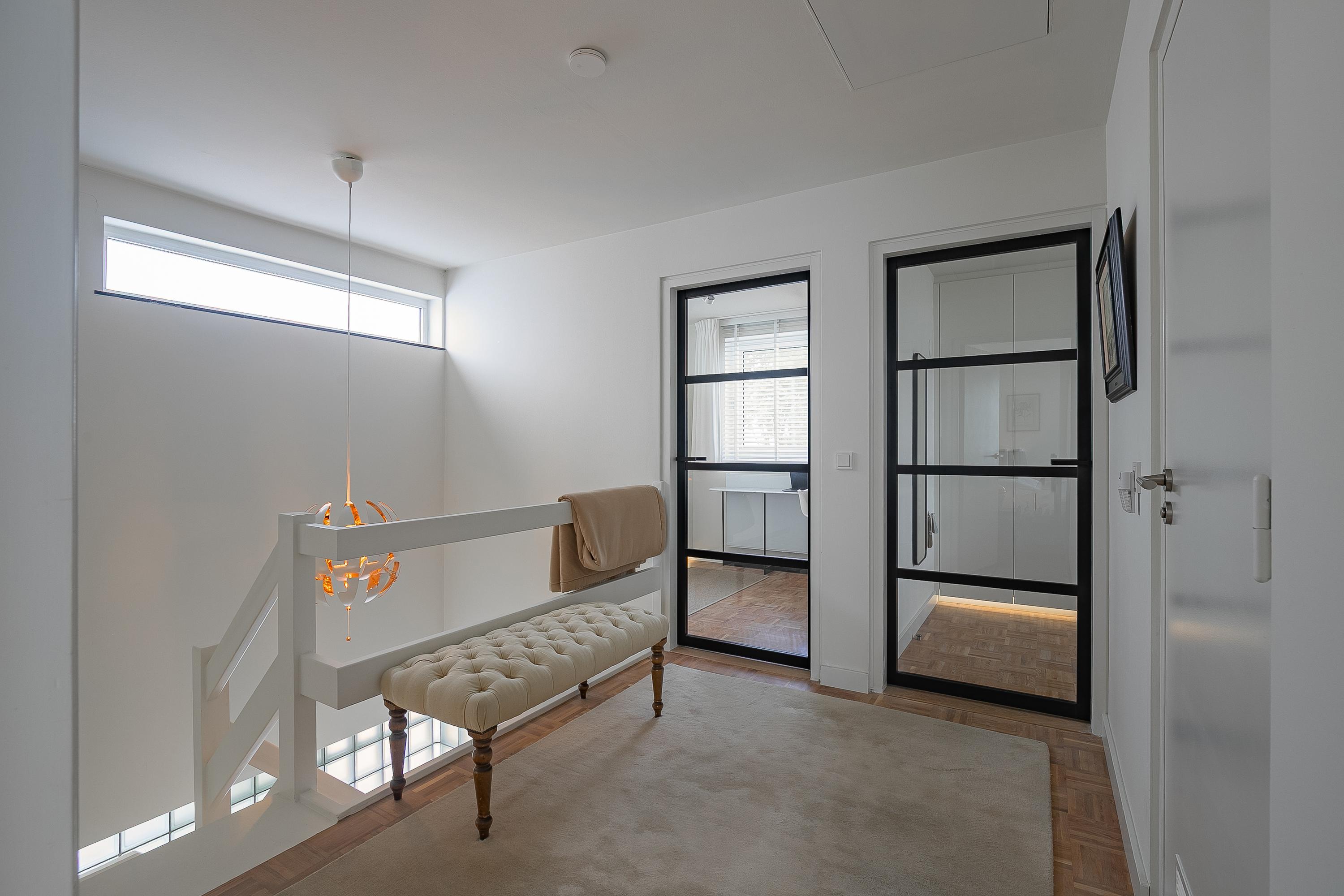 En la planta superior, los cuatro dormitorios están acompañados de armarios hechos a medida por Slangen Interieurbouw y suelos de parquet de mosaico. El baño ofrece ducha a ras de suelo y bañera, ventilación mecánica y calefacción por suelo radiante. El dormitorio principal dispone de aire acondicionado; abundan las soluciones de almacenamiento, como un generoso sótano con garaje de 33 m² y cuartos de servicio, además de un altillo para almacenamiento adicional.