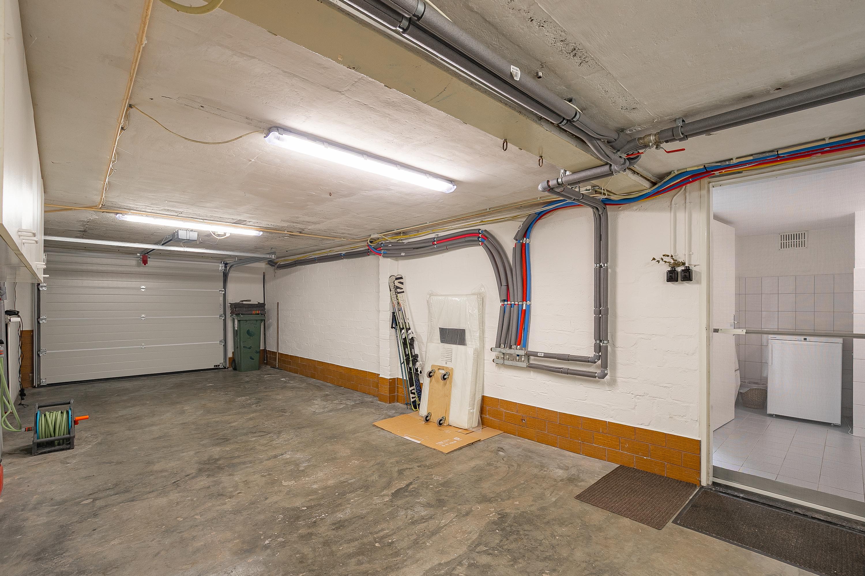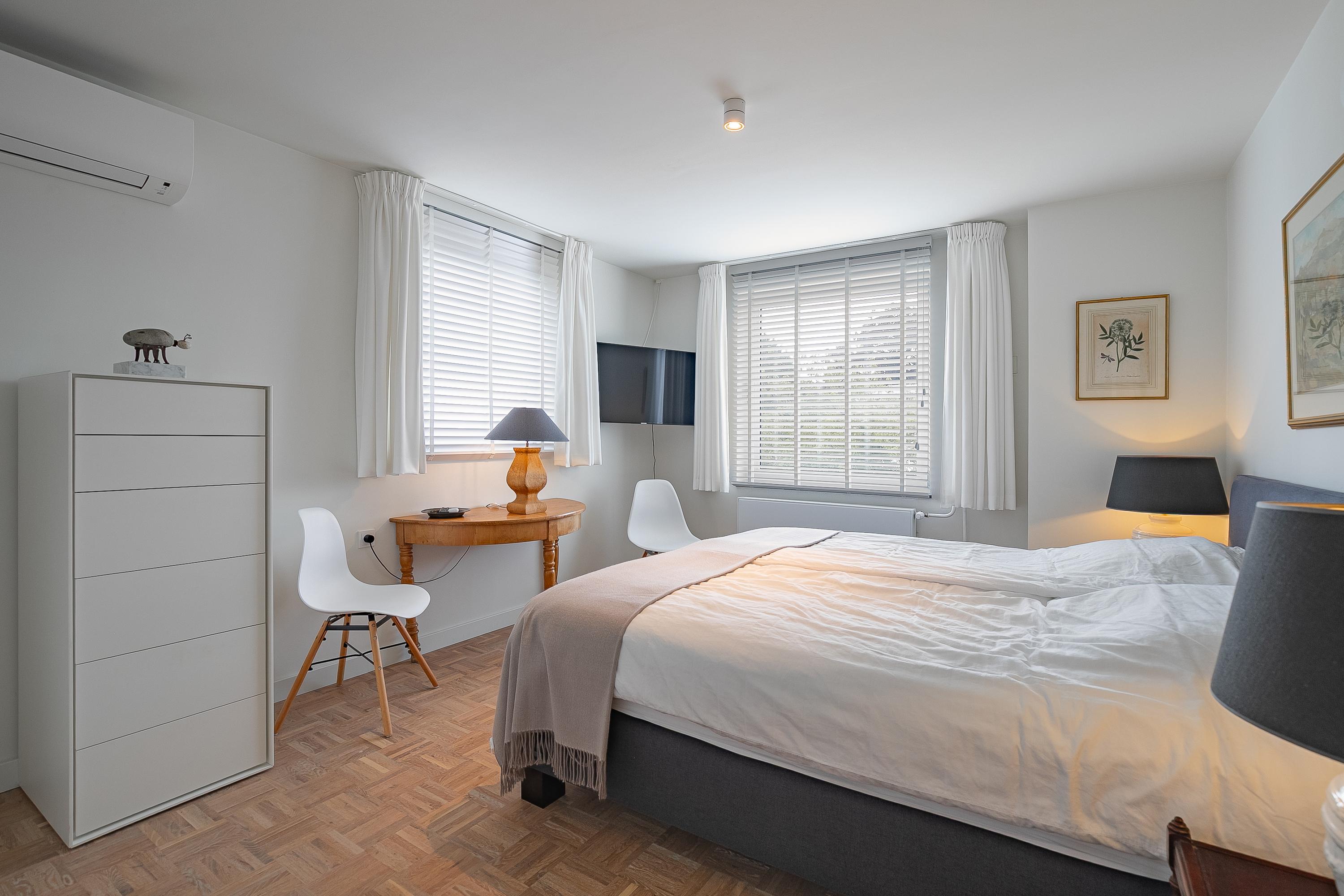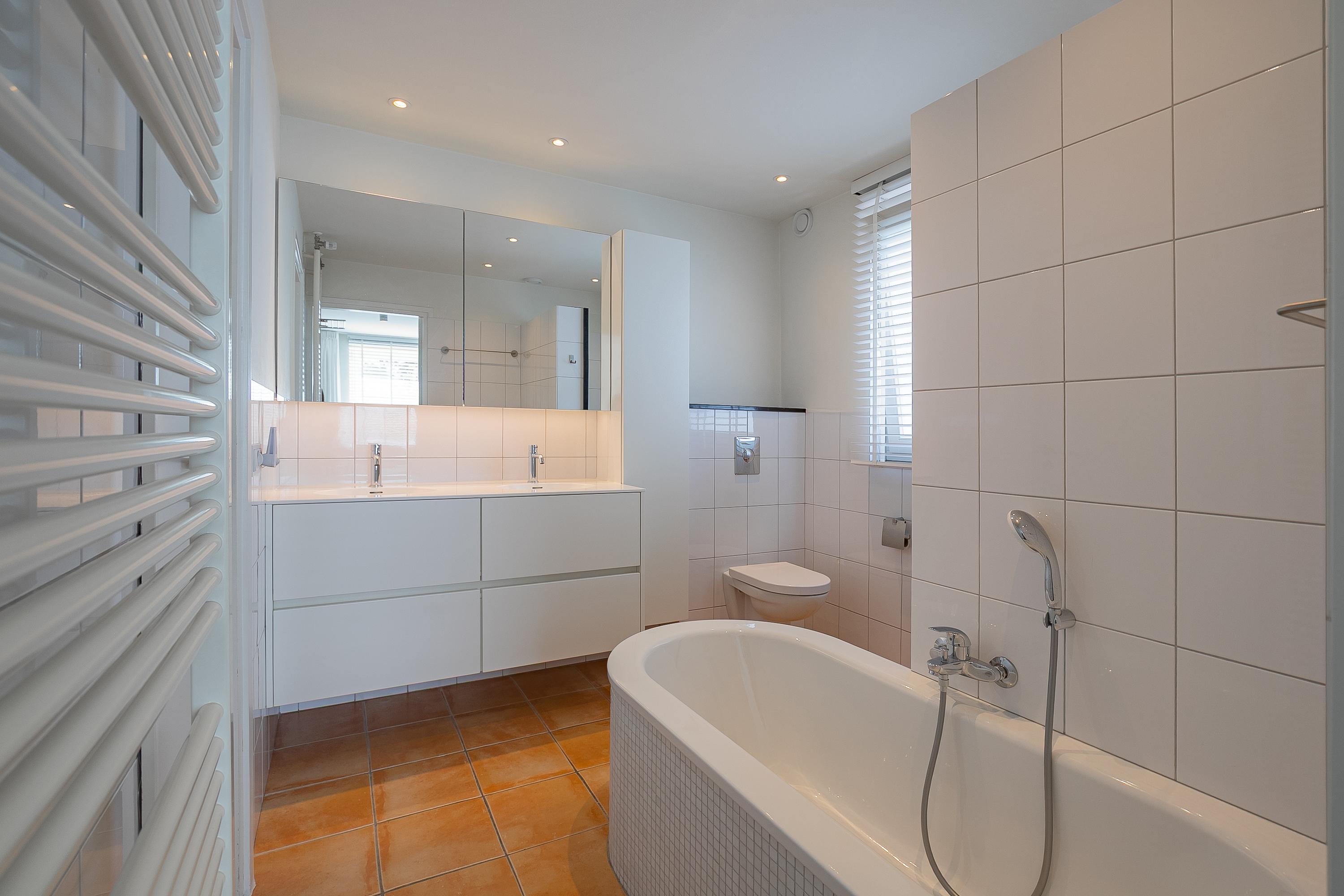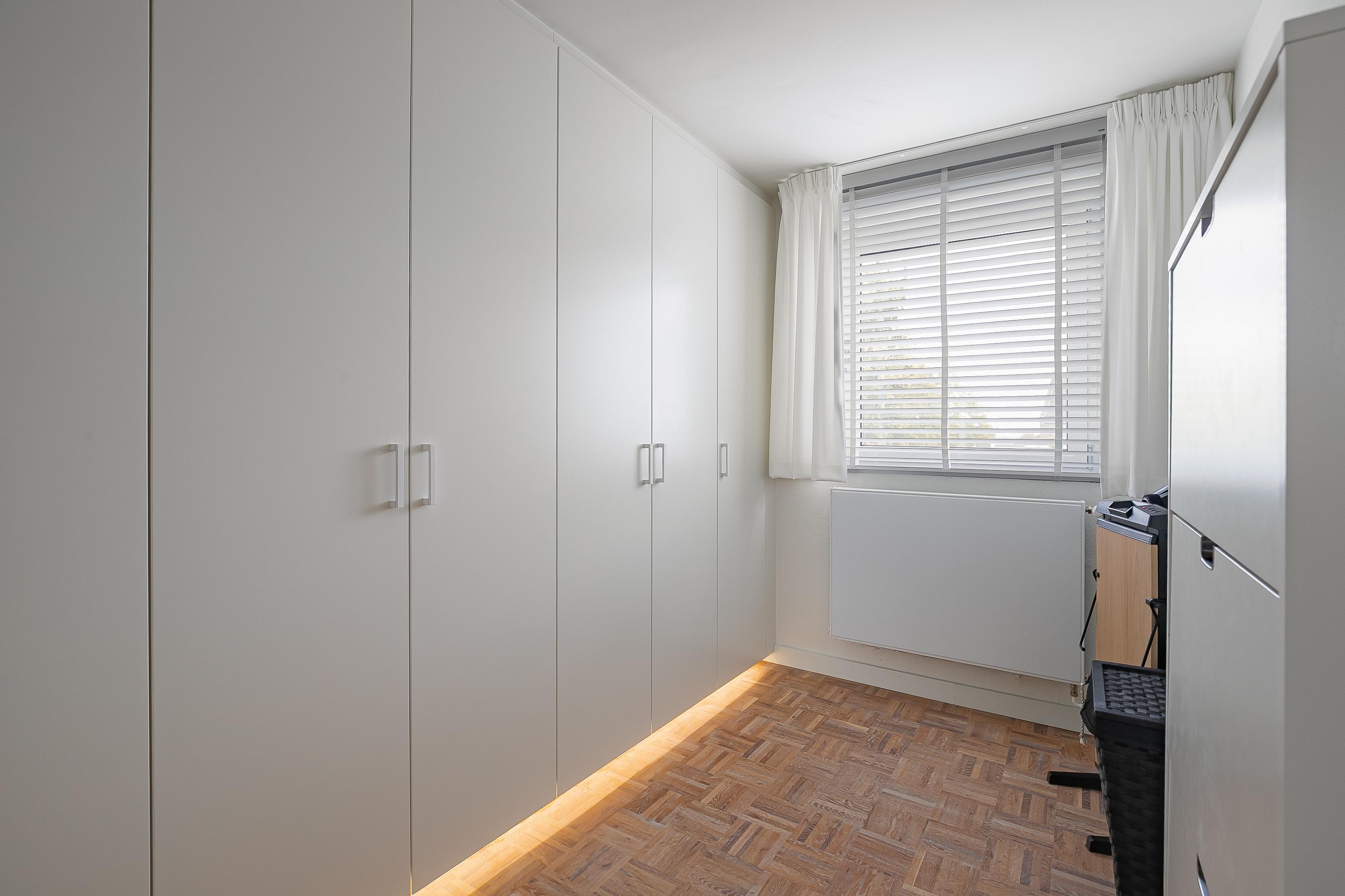 En la planta superior, los cuatro dormitorios están acompañados de armarios hechos a medida por Slangen Interieurbouw y suelos de parquet de mosaico. El baño ofrece ducha a ras de suelo y bañera, ventilación mecánica y calefacción por suelo radiante. El dormitorio principal dispone de aire acondicionado; abundan las soluciones de almacenamiento, como un generoso sótano con garaje de 33 m² y cuartos de servicio, además de un altillo para almacenamiento adicional.