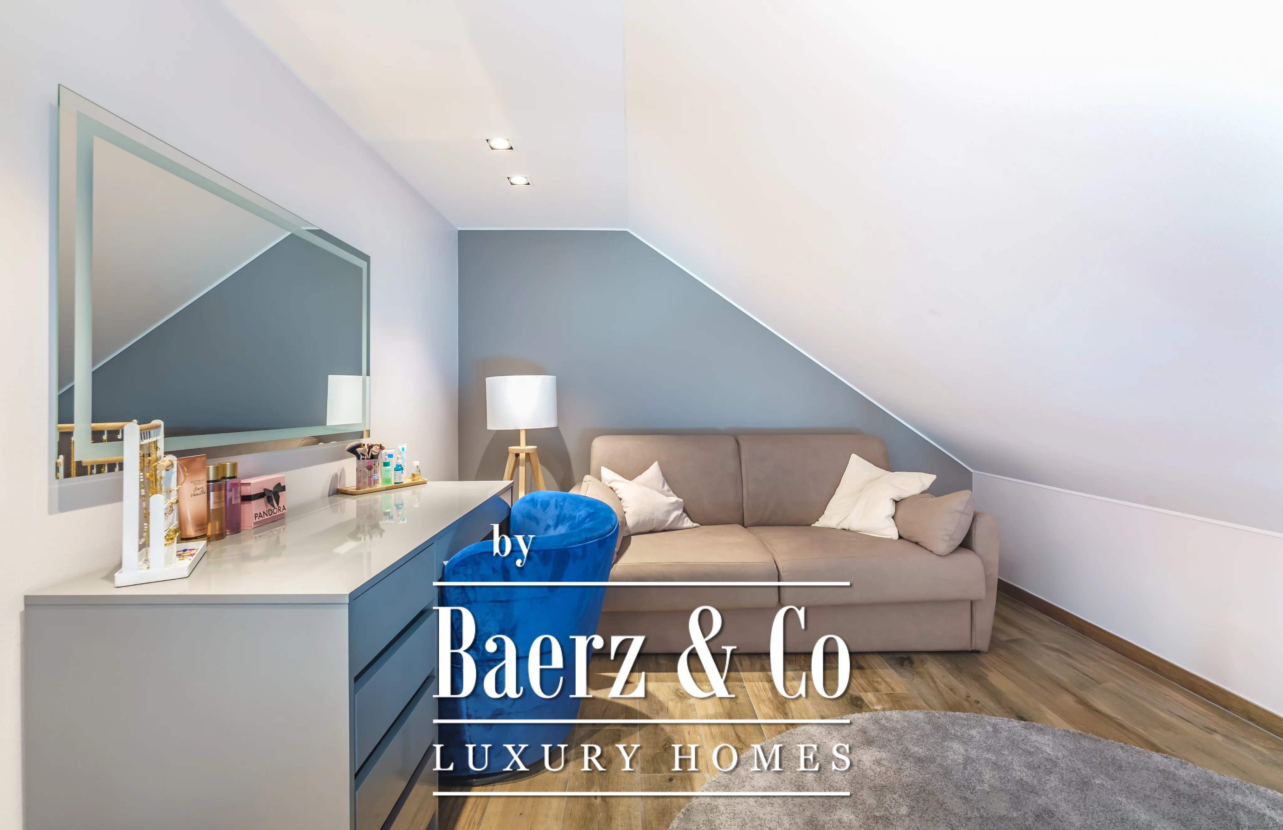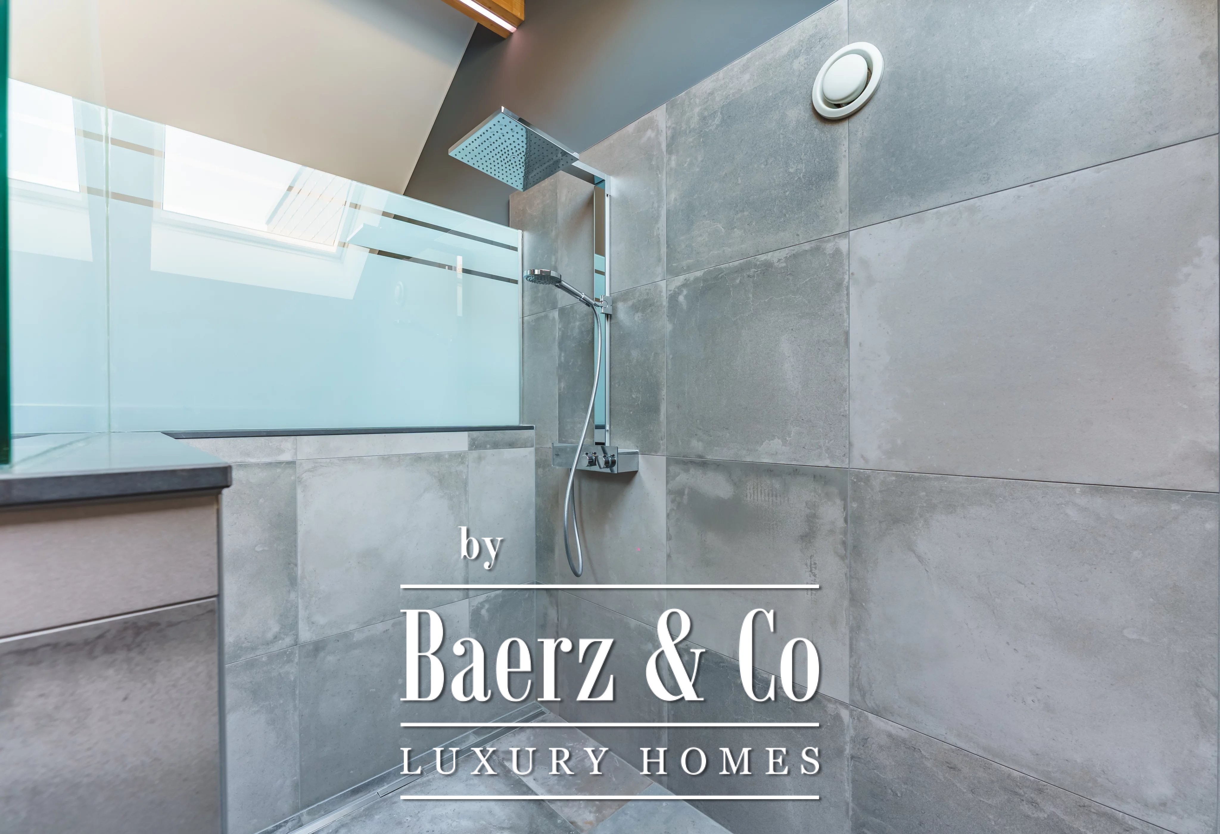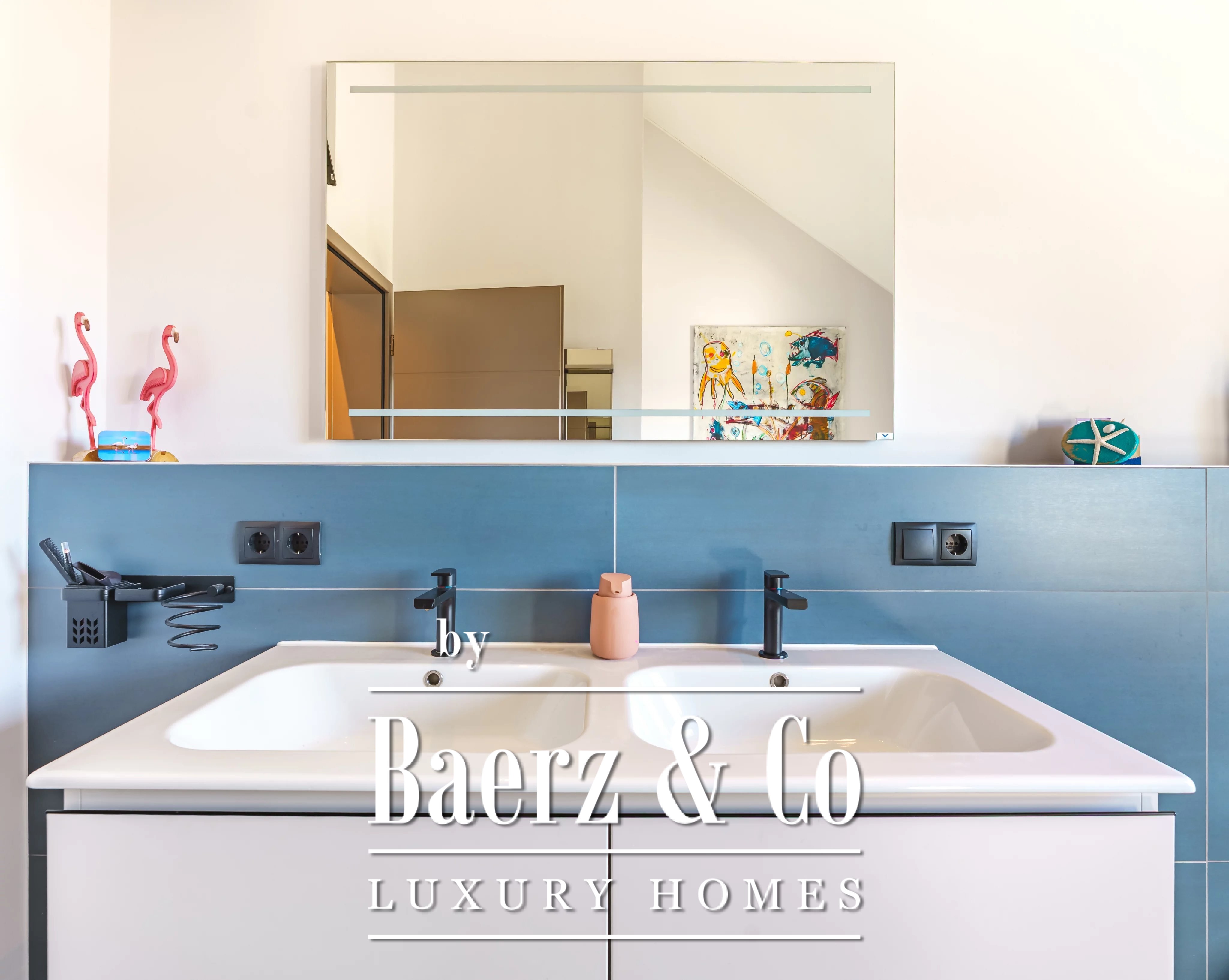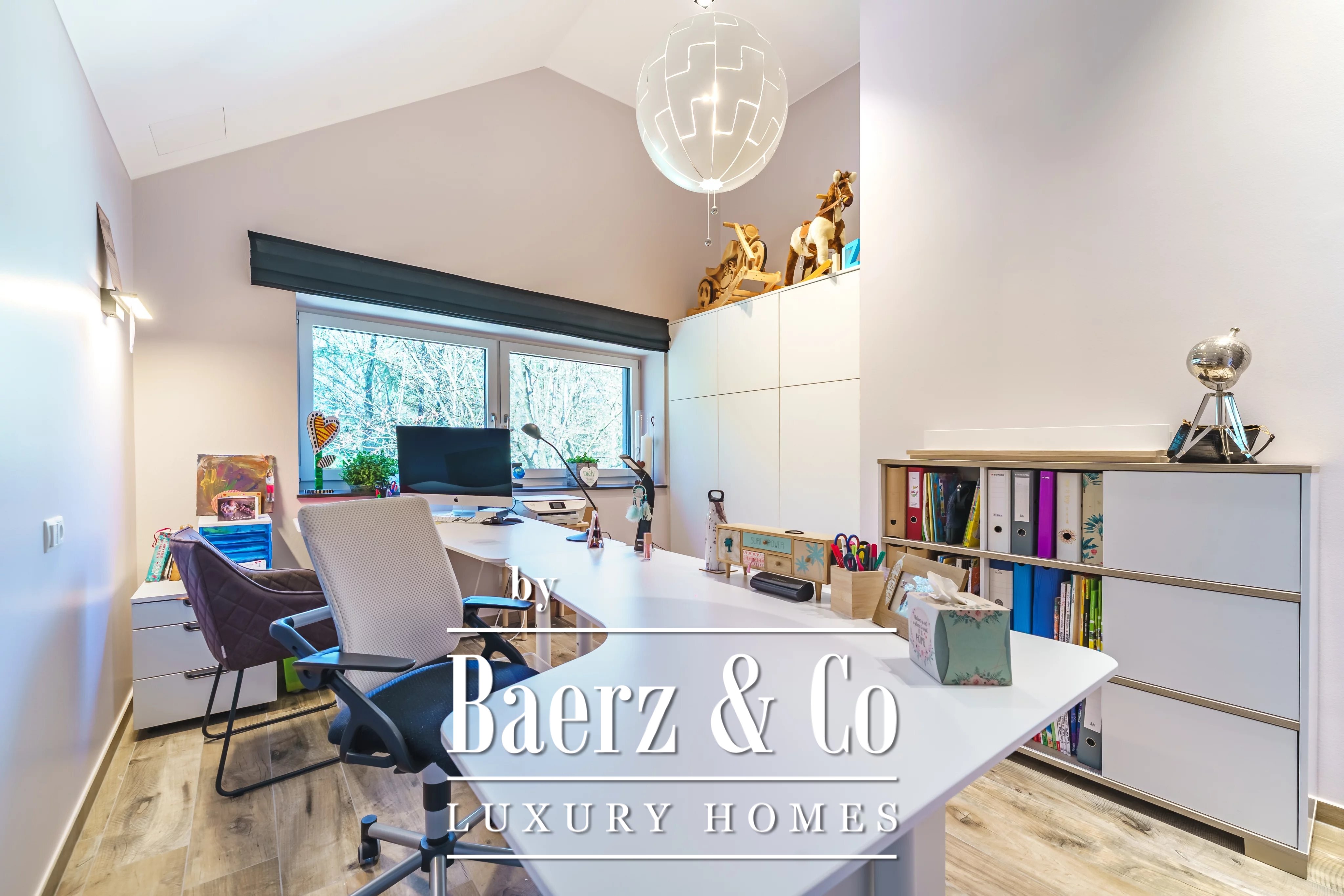 À l’étage, un salon supplémentaire offre un refuge privé pour les moments en famille. Cinq chambres et quatre salles de bains composent la maison, dont une suite parentale avec dressing, salle d’eau privative, et une chambre d’amis avec salle d’eau attenante. La buanderie se distingue par sa discrétion et son efficacité, facilitant le confort au quotidien.