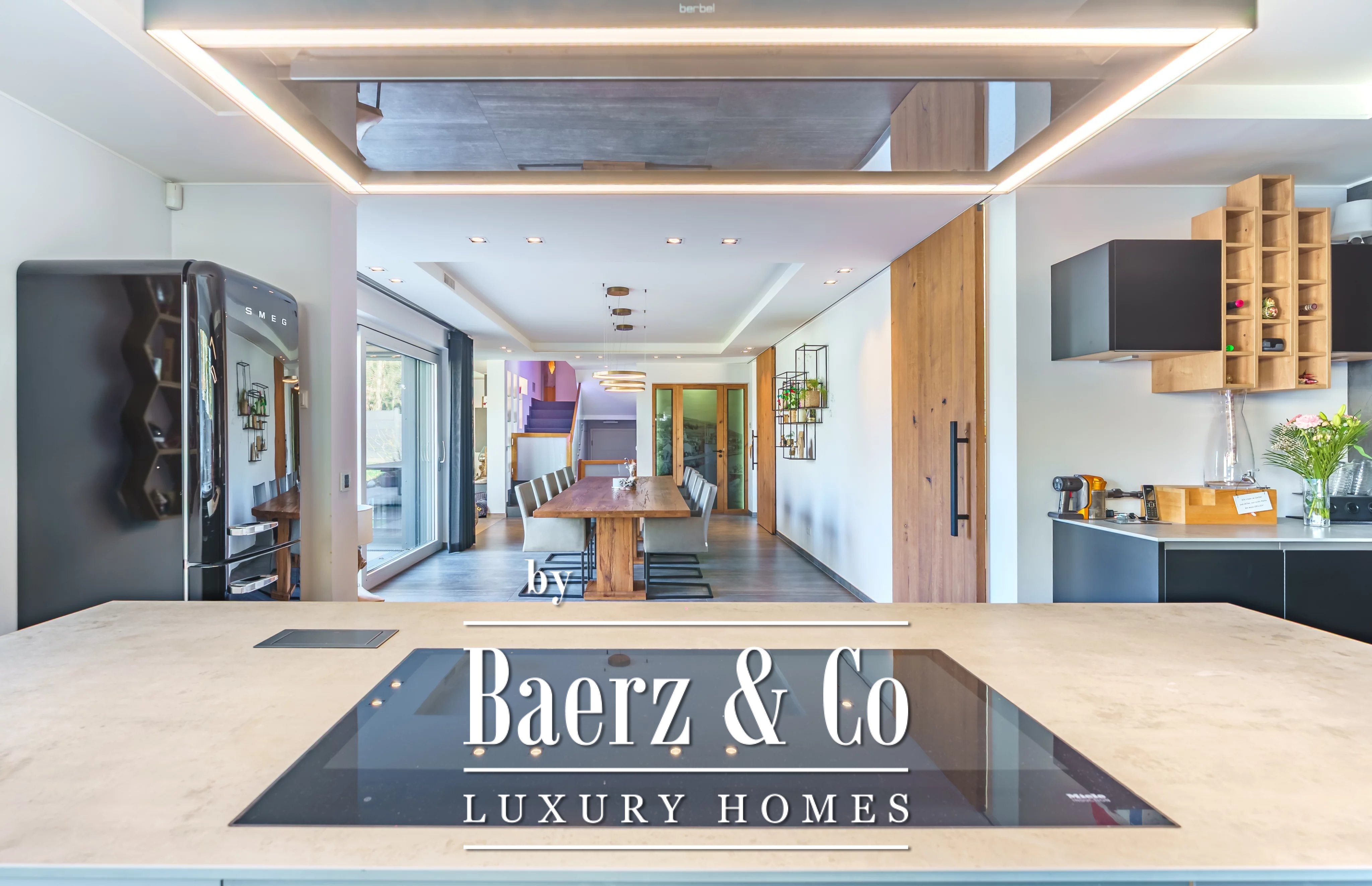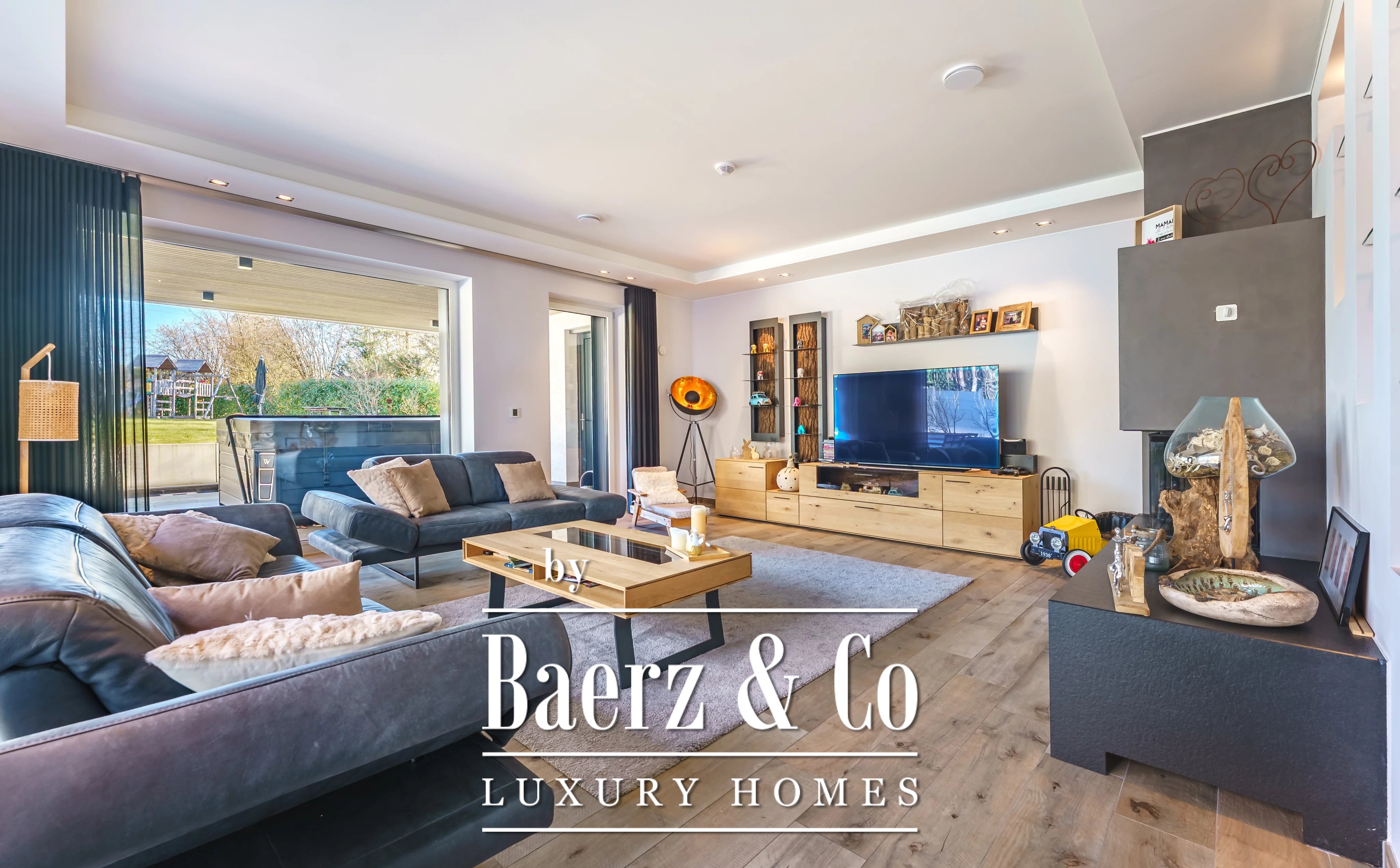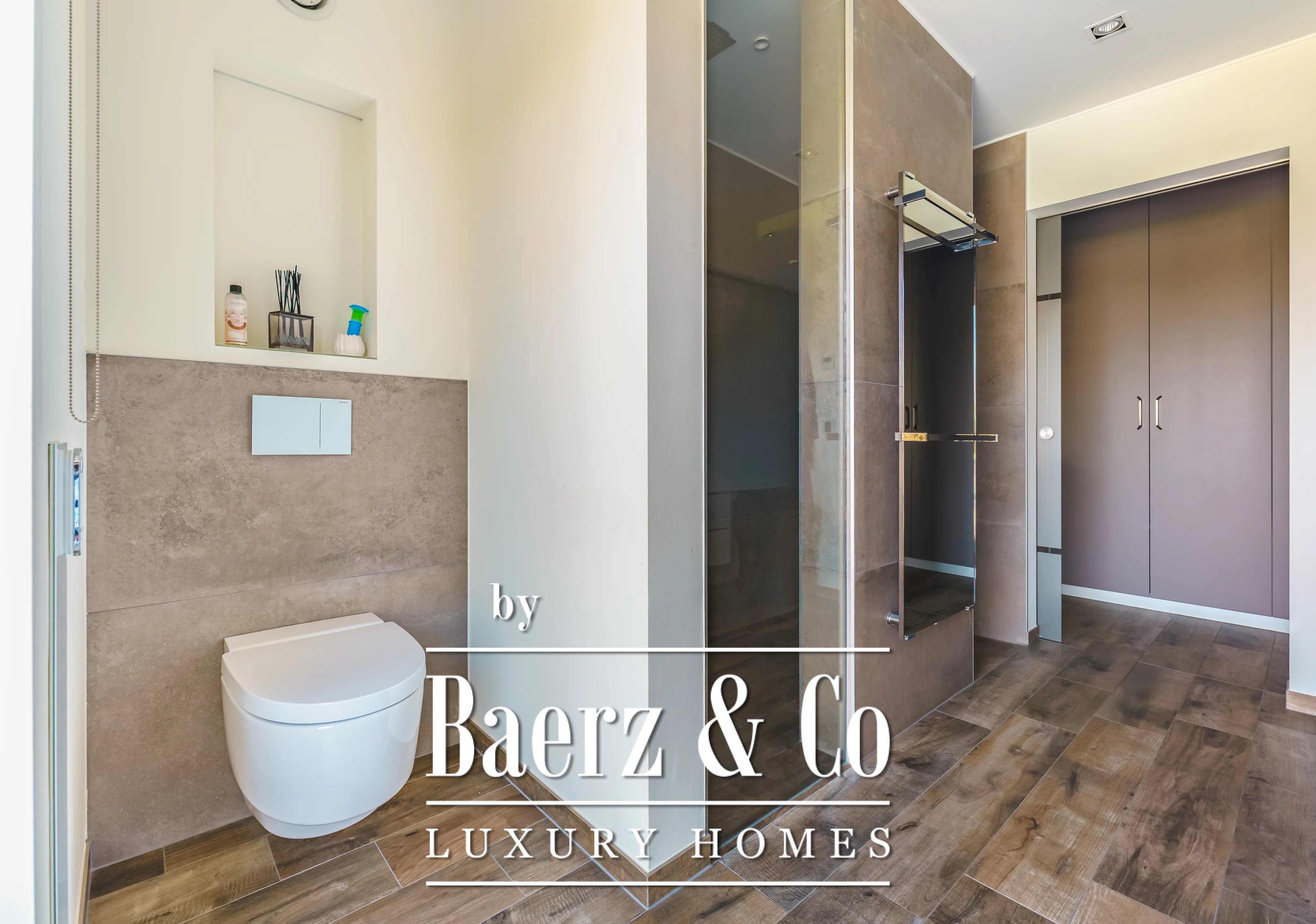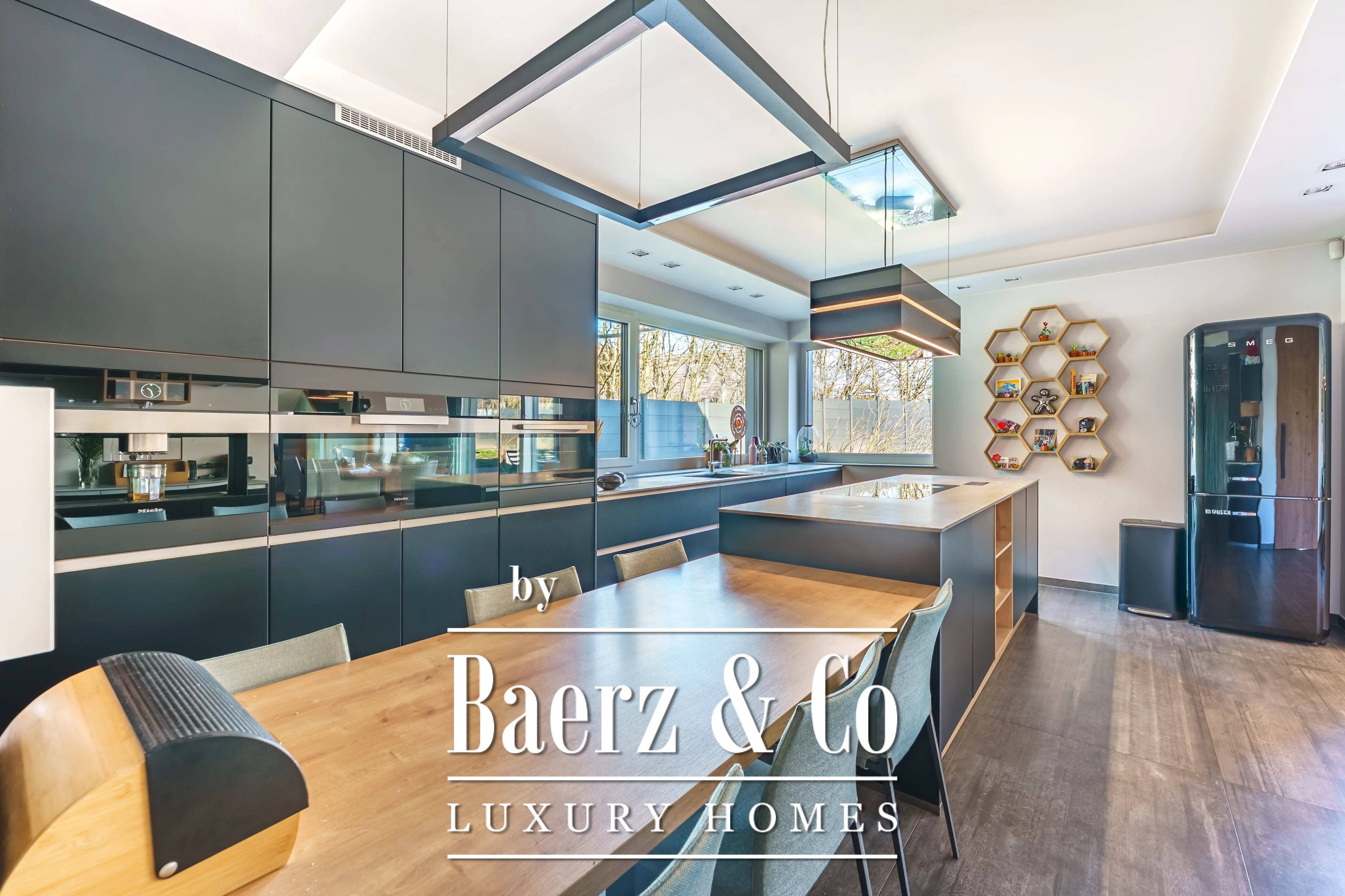 À l’étage, un salon supplémentaire offre un refuge privé pour les moments en famille. Cinq chambres et quatre salles de bains composent la maison, dont une suite parentale avec dressing, salle d’eau privative, et une chambre d’amis avec salle d’eau attenante. La buanderie se distingue par sa discrétion et son efficacité, facilitant le confort au quotidien.