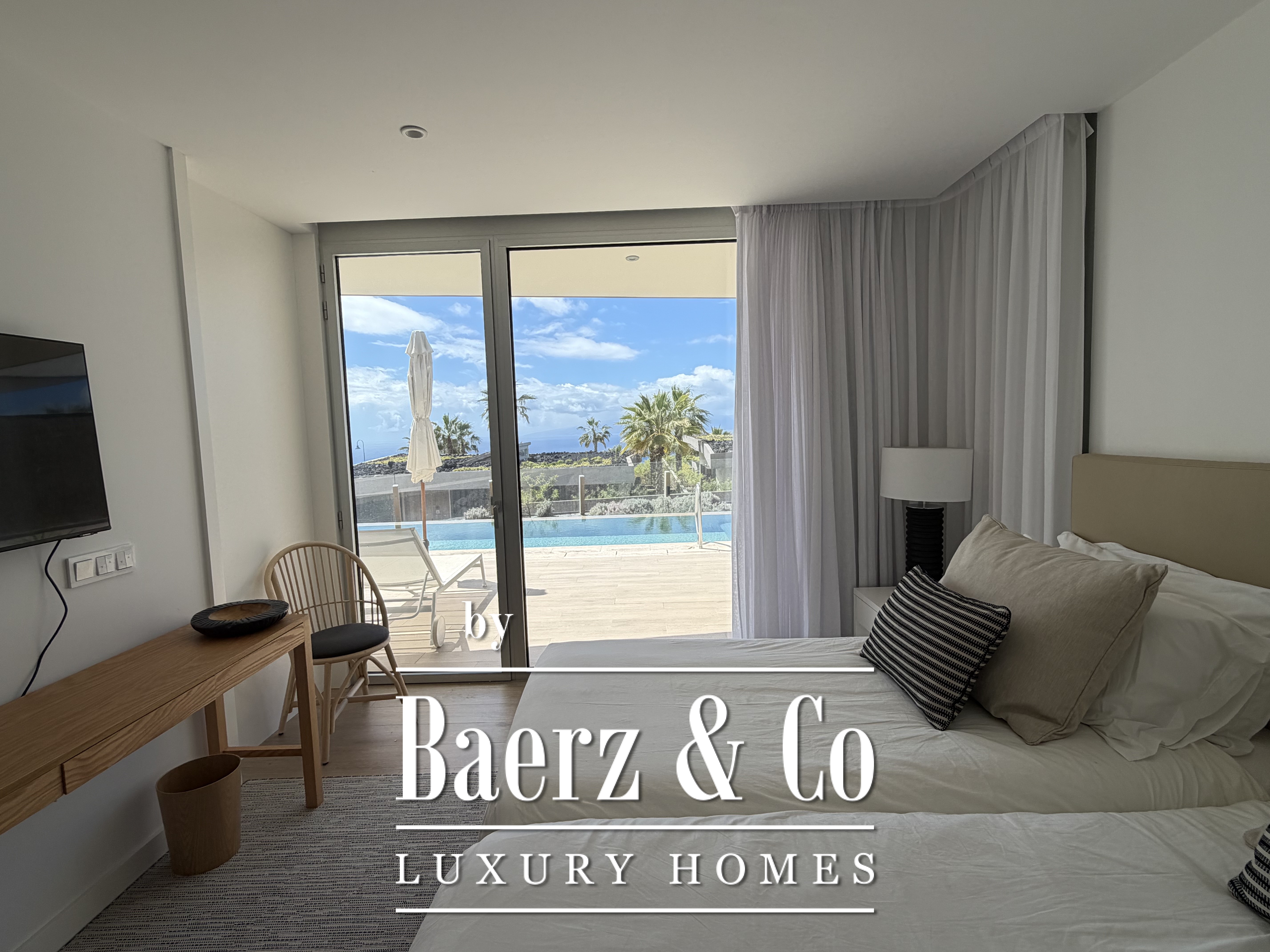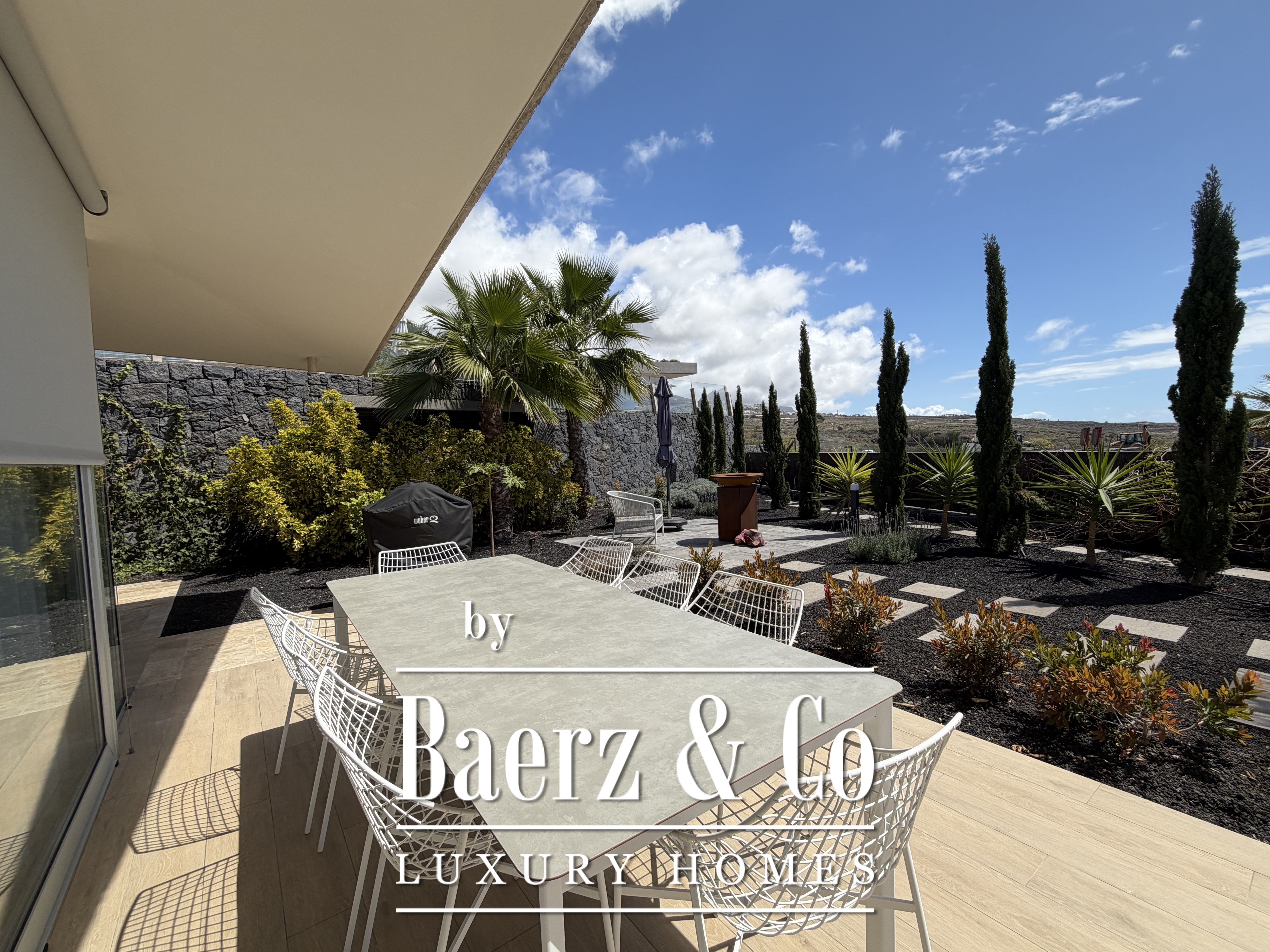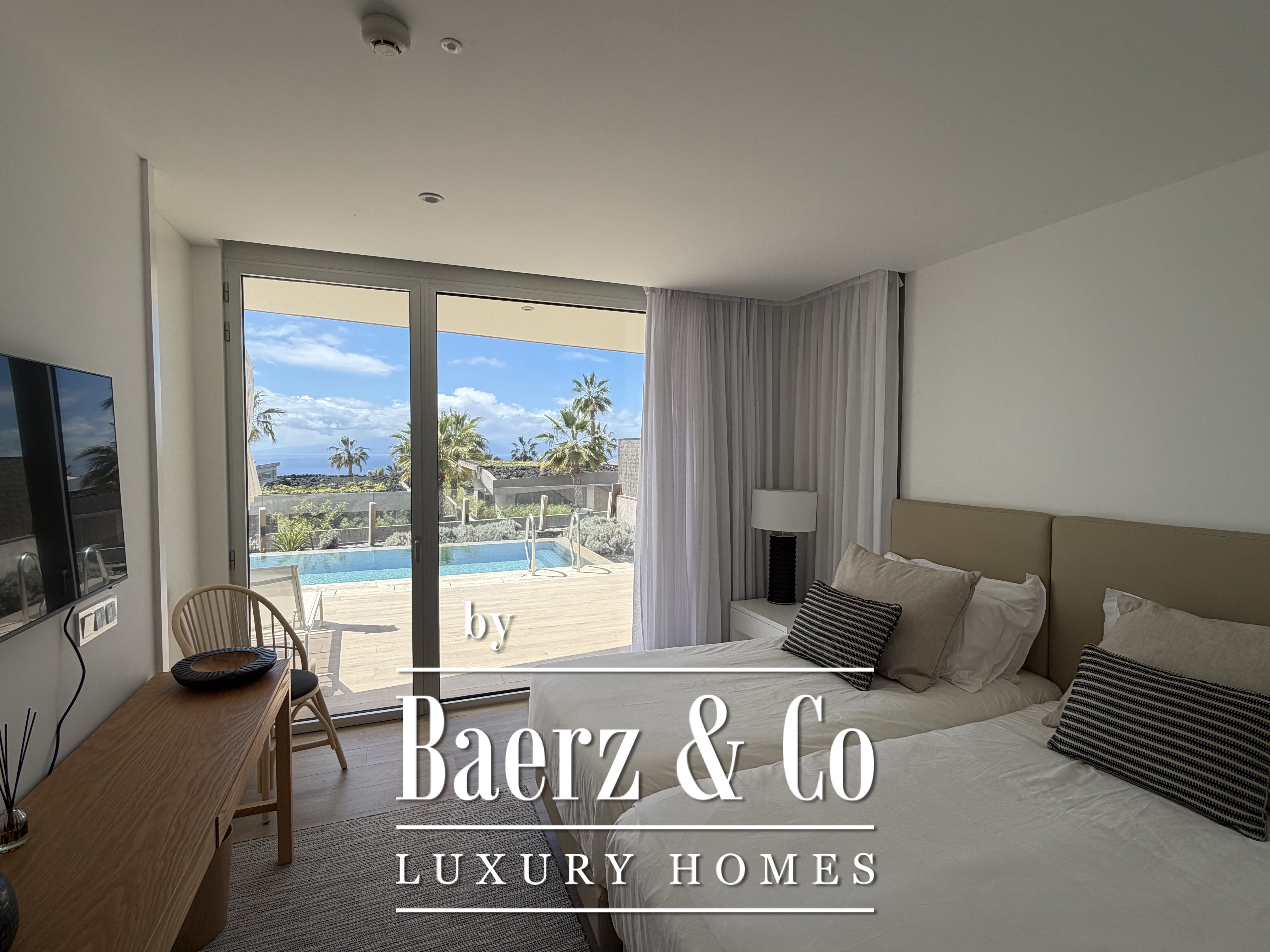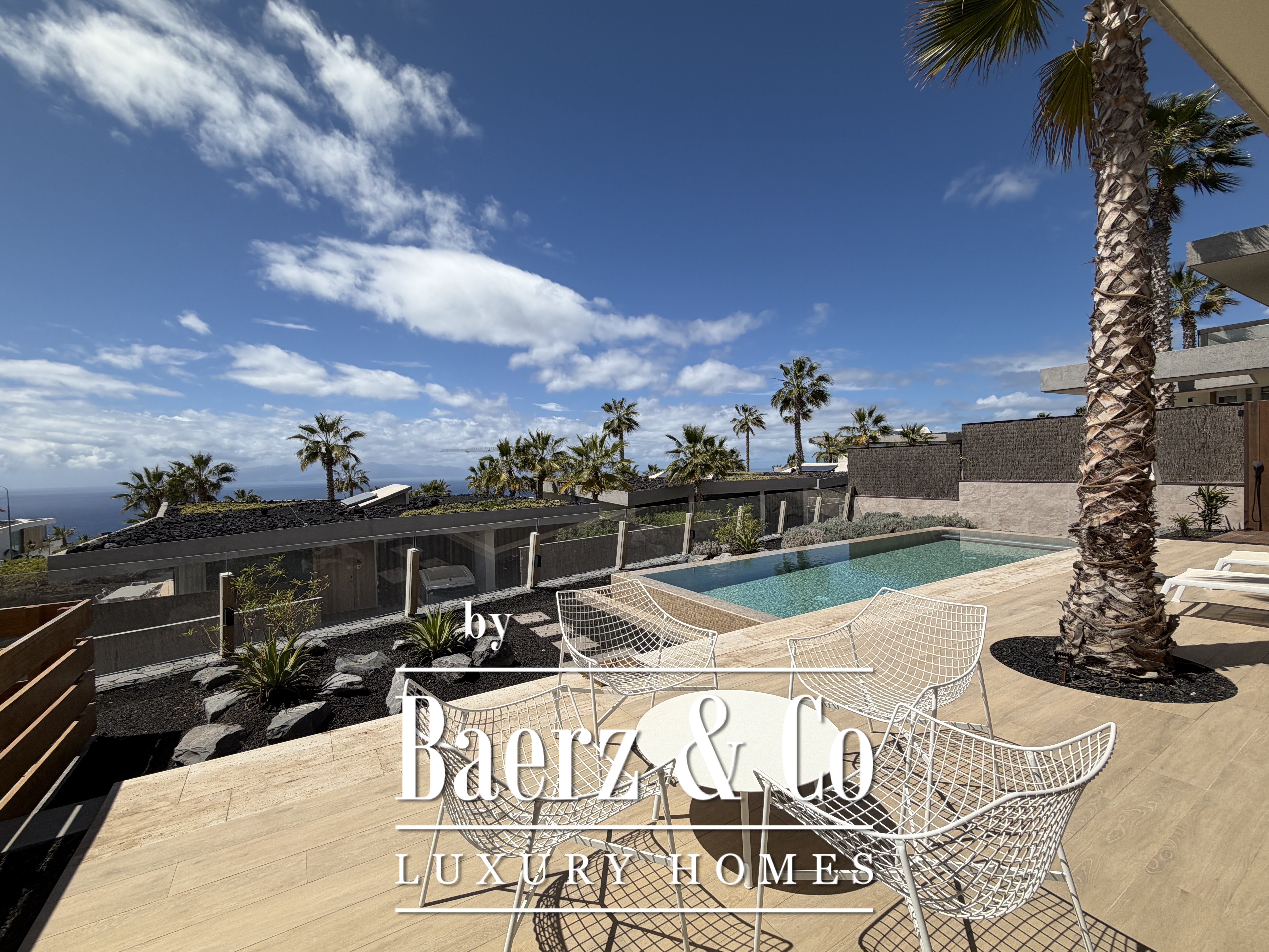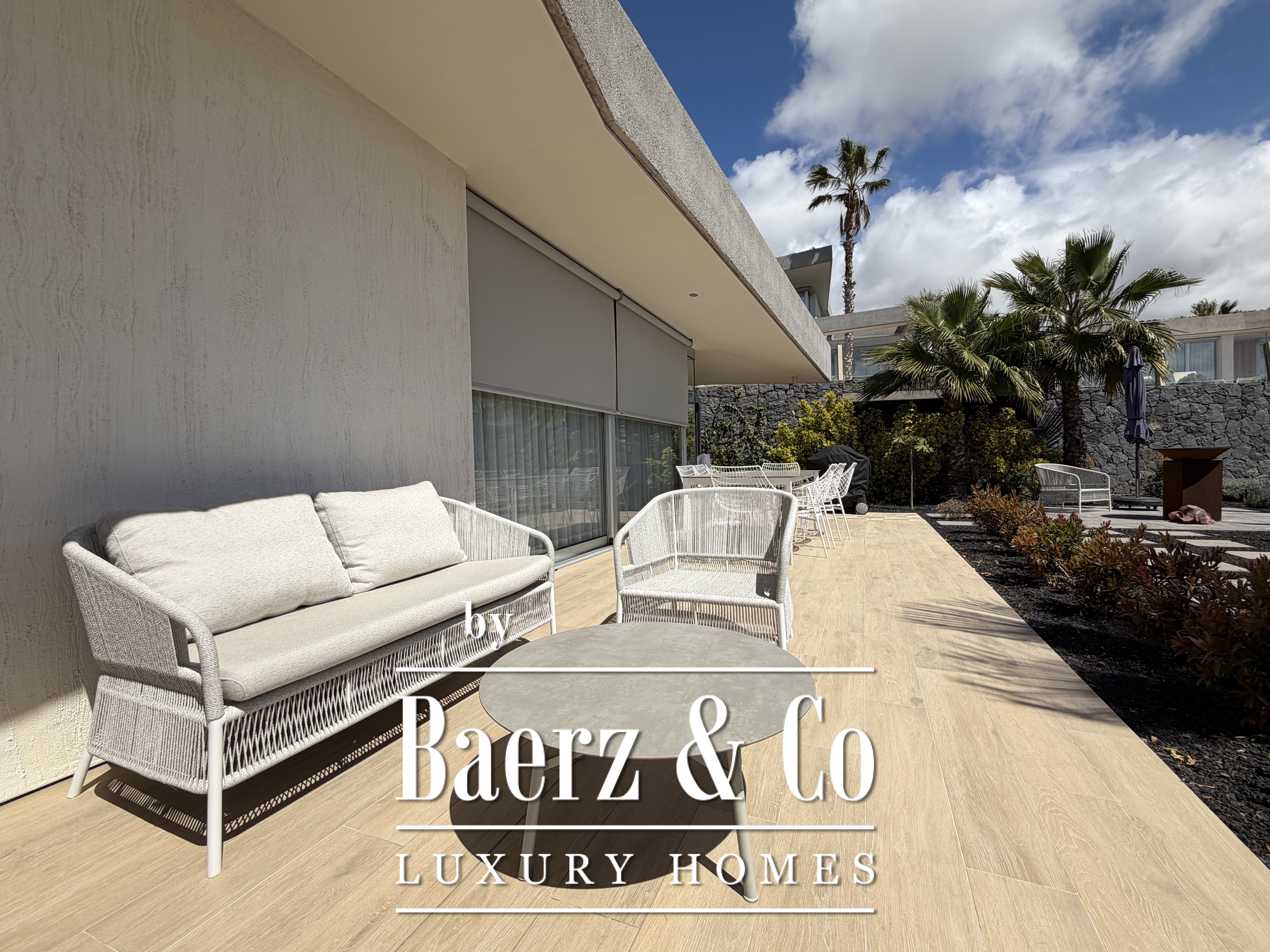 De villa beschikt over drie ruime slaapkamers met kleedkamers, twee moderne badkamers met douches en een lichte woonkamer met grote ramen die uitkomen op het terras en de tuin. Het privé, verwarmde overloopzwembad is perfect om af te koelen en te genieten van het klimaat van Tenerife, terwijl de buitenruimte diverse mogelijkheden biedt om buiten te dineren en te ontspannen.