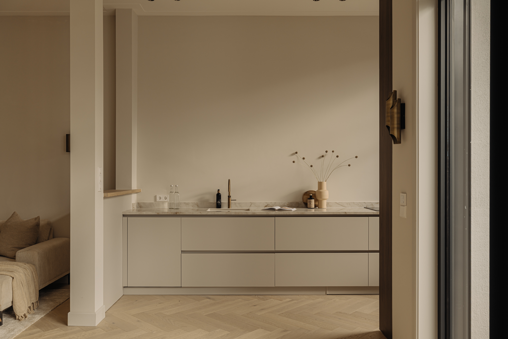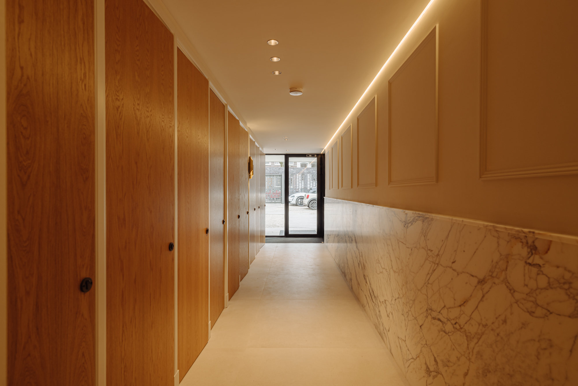 Via de privéparkeerplaatsen heeft u toegang tot het stijlvolle en gemeenschappelijke entree met marmeren lambrisering. Deze entree geeft toegang tot de meterkasten van elk appartement. Via de trap of de elegante marmeren lift bereik je de eerste verdieping, waar je het appartement betreedt. Daarnaast is de entree ook toegankelijk vanaf de achterzijde van het pand.