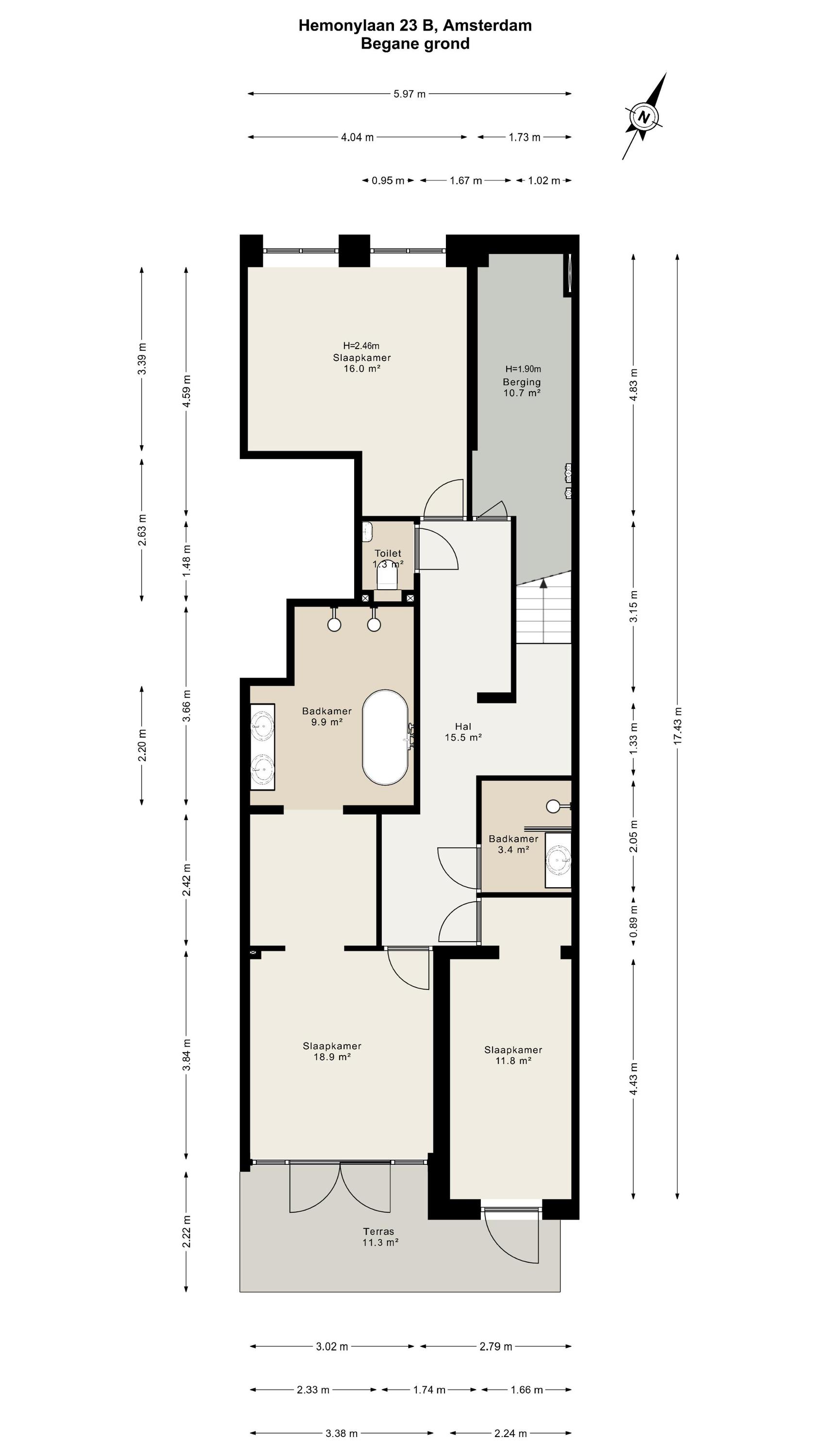 Via de interne trap bereikt u de begane grond, waar een royale overloop met een separaat toilet en een inbouwkast toegang biedt tot alle vertrekken. Aan de voorzijde bevinden zich twee ruime slaapkamers, beide met directe toegang tot het zonnige terras. De master bedroom heeft een luxe en-suite badkamer, voorzien van een ligbad, dubbele wastafel en een dubbele inloopdouche. De tweede, stijlvolle badkamer, eveneens aan de voorzijde gelegen, is uitgerust met een ruime wastafel en een inloopdouche. Aan de achterzijde vindt u de vierde slaapkamer, evenals een ruime berging van circa 11 m².