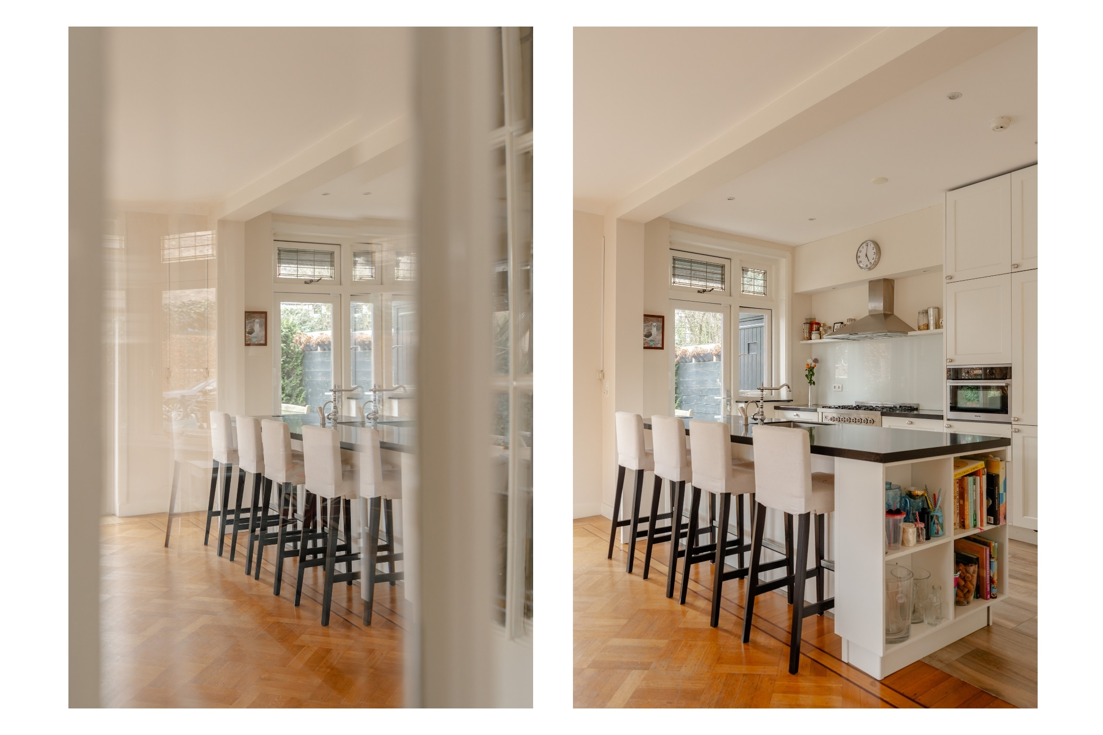 Vanuit de woonkamer loopt u door naar de ruime eetkamer met aansluitend de halfopen keuken. Deze keuken is voorzien van diverse inbouwapparatuur, waaronder een vaatwasser, Quooker en magnetron. Daarnaast beschikt de keuken over een ruim gasfornuis met oven. Vanuit de keuken heeft u tevens toegang tot de ruime kelder.
