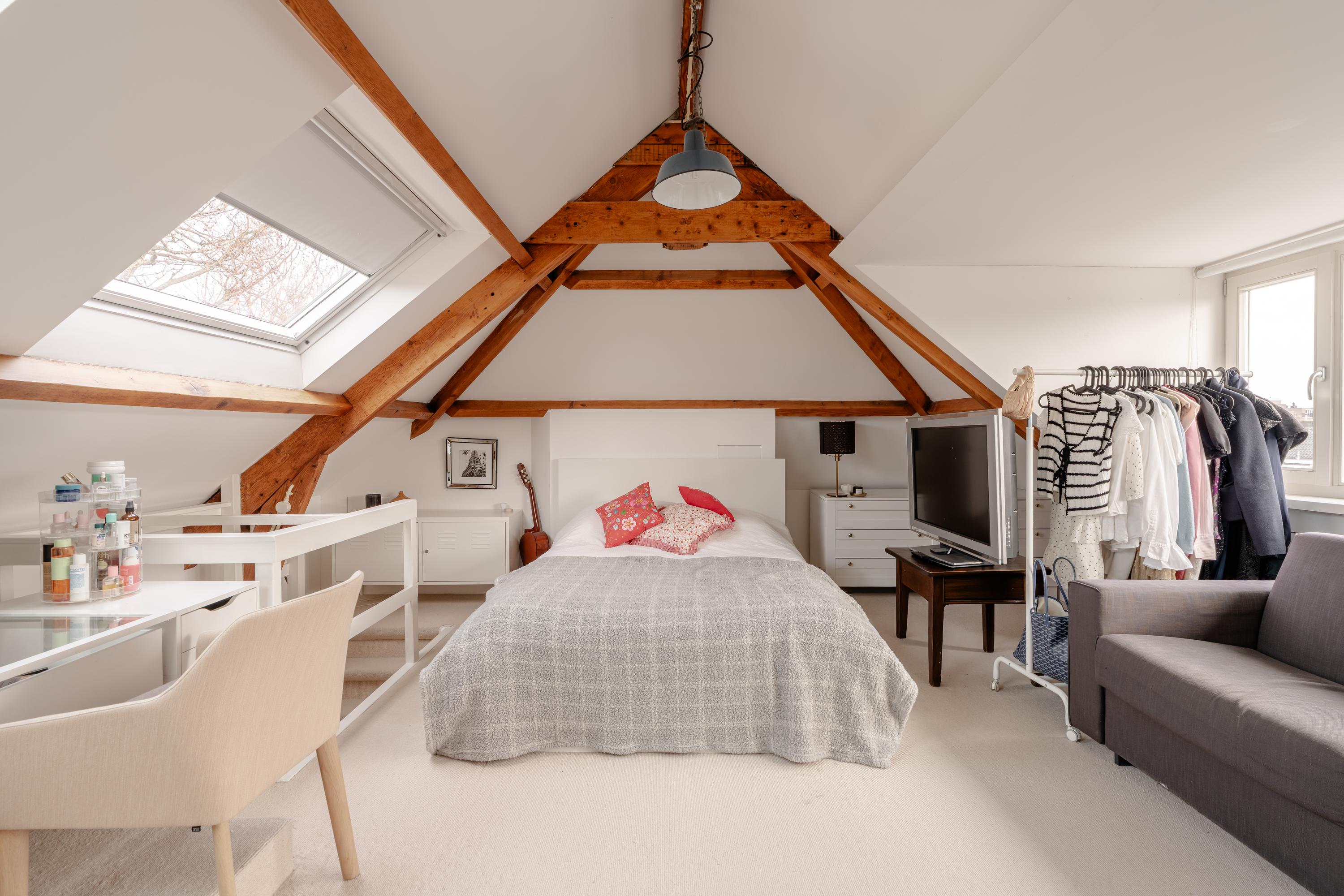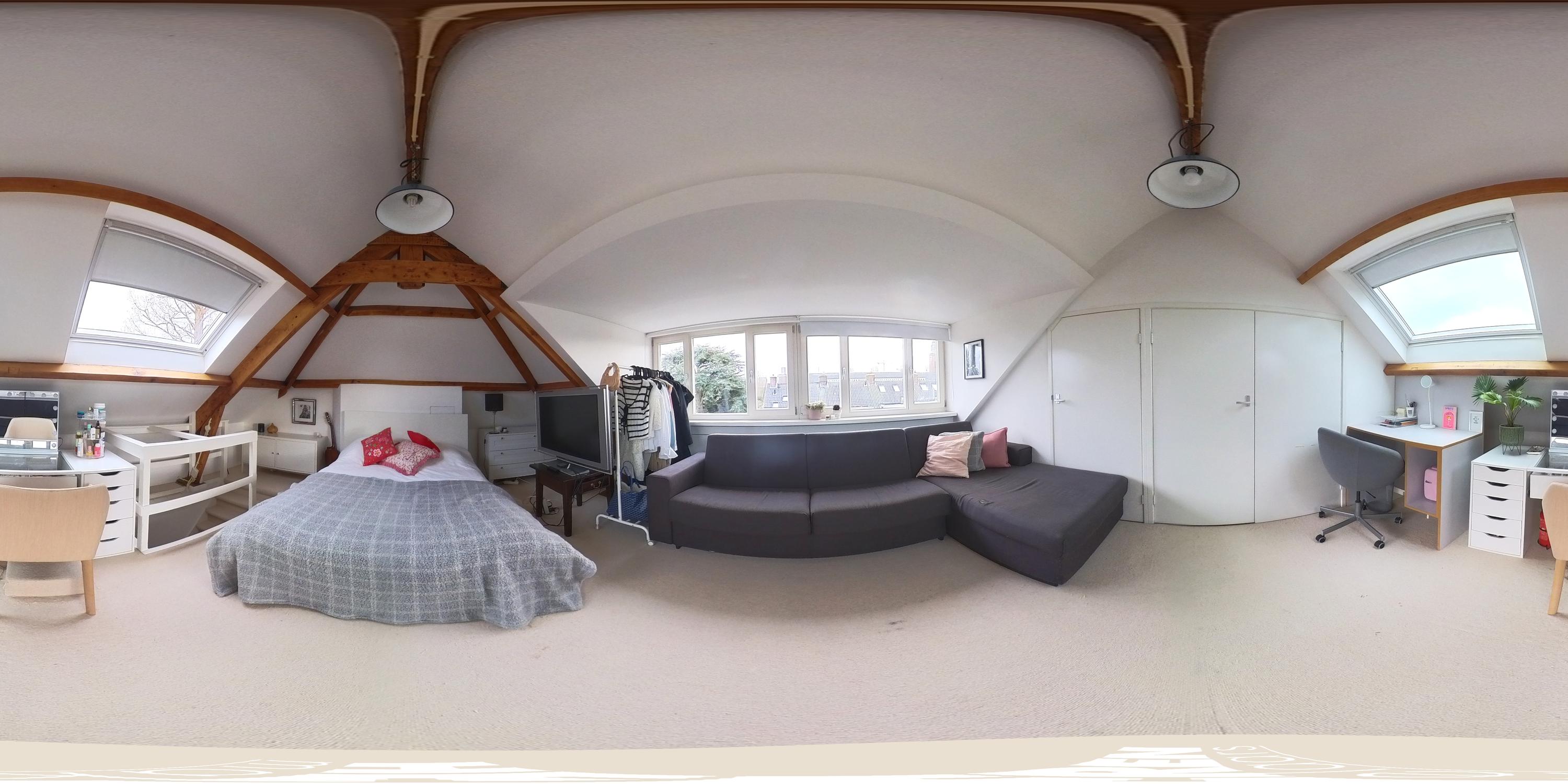 De ruimte wordt momenteel gebruikt als slaapkamer met zitgedeelte, maar kan eenvoudig op verschillende manieren worden ingericht, bijvoorbeeld als master bedroom, atelier of multifunctionele ruimte. In de knieschotten is praktische bergruimte aanwezig.