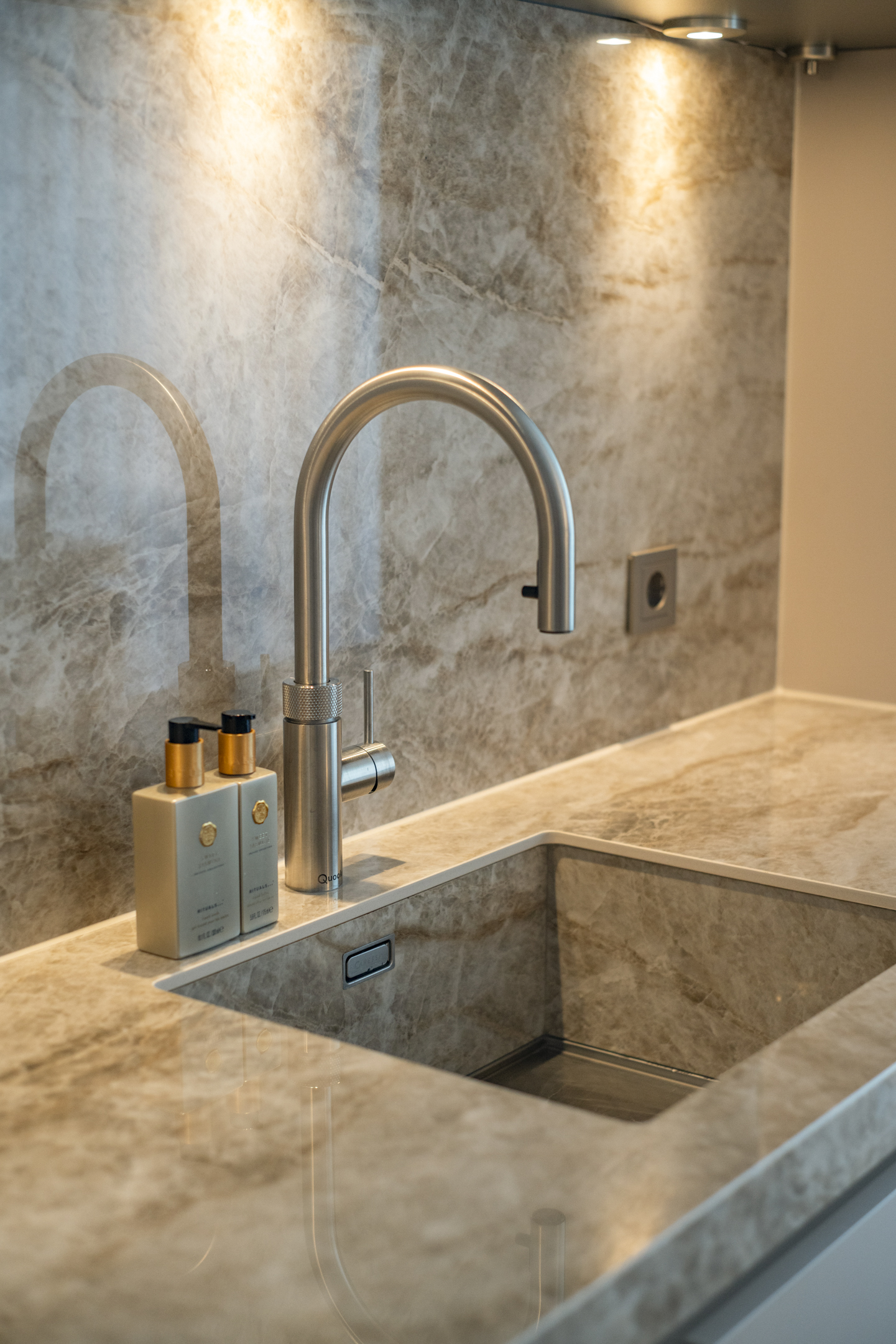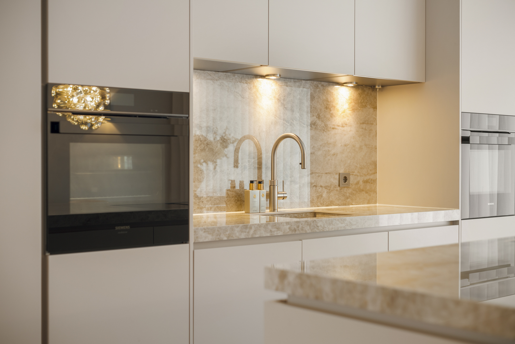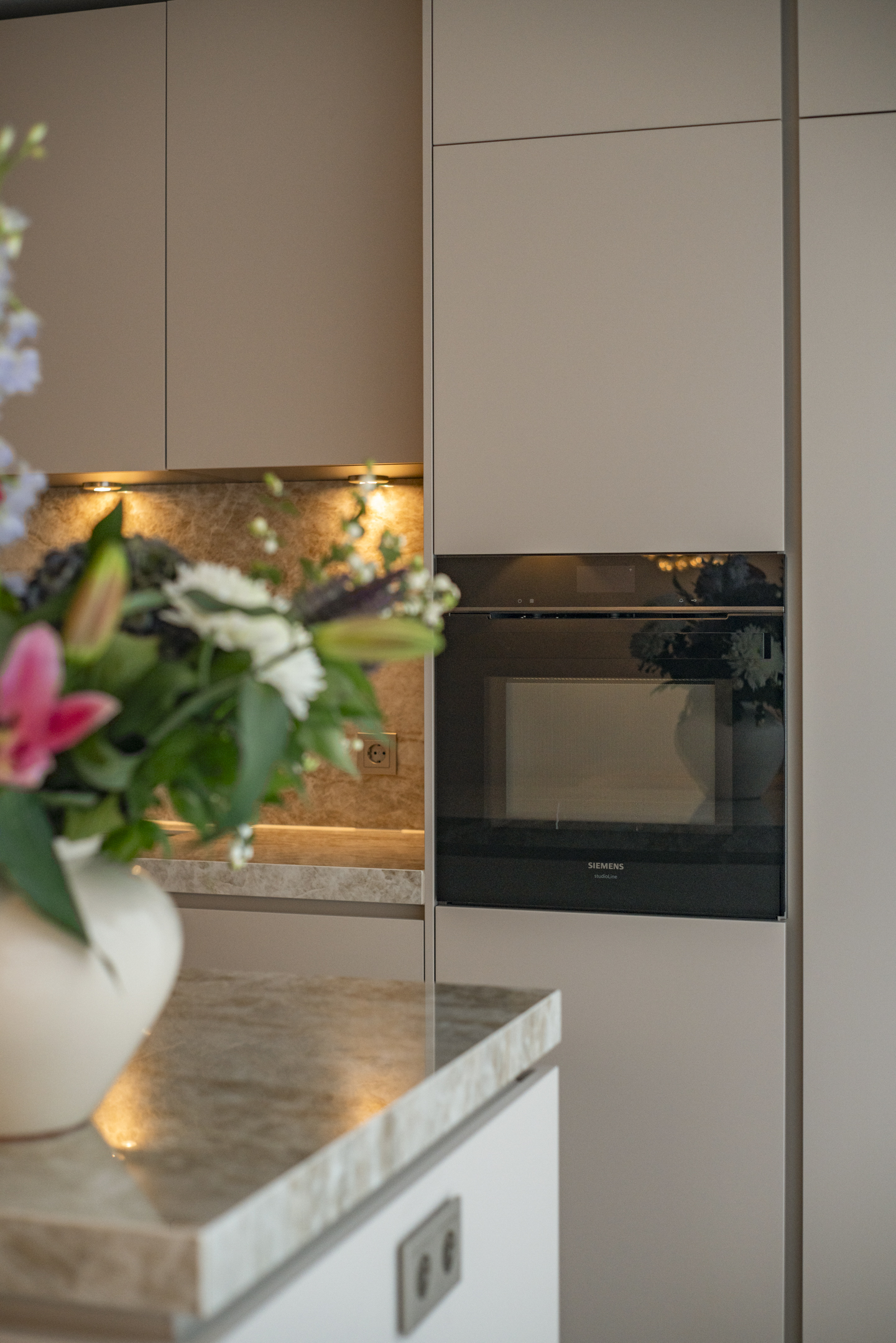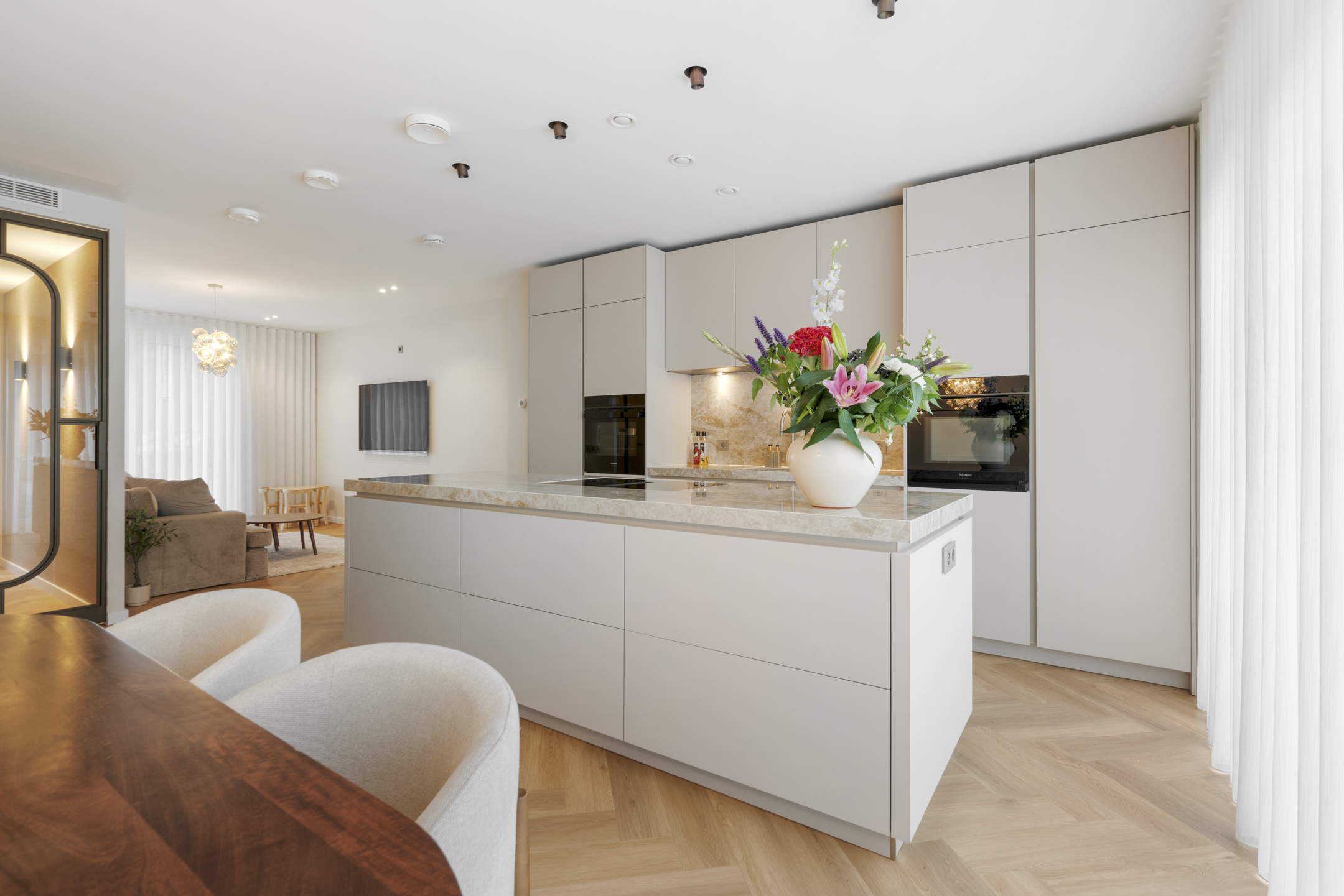 De keuken is een maatwerk droomopstelling met een imposant Dekton kookeiland van 2,80 meter breed, hoogwaardige Siemens-apparatuur (5 jaar garantie) en een Quooker. Koken en leven vloeien hier moeiteloos in elkaar over.